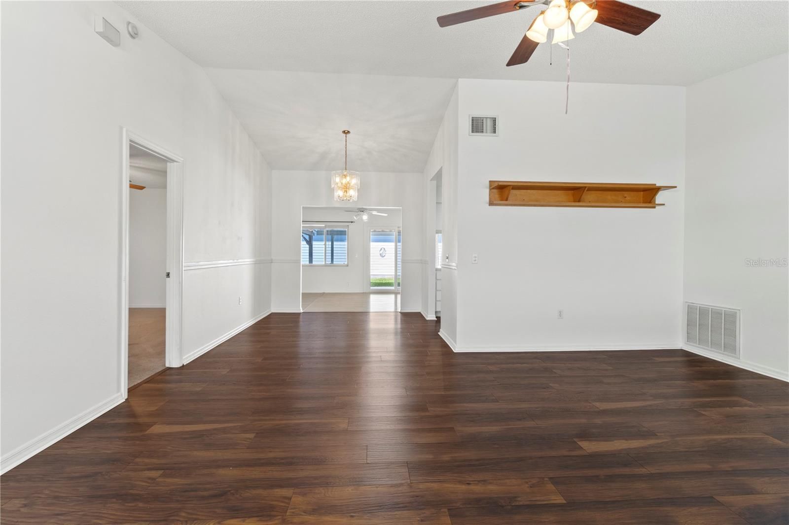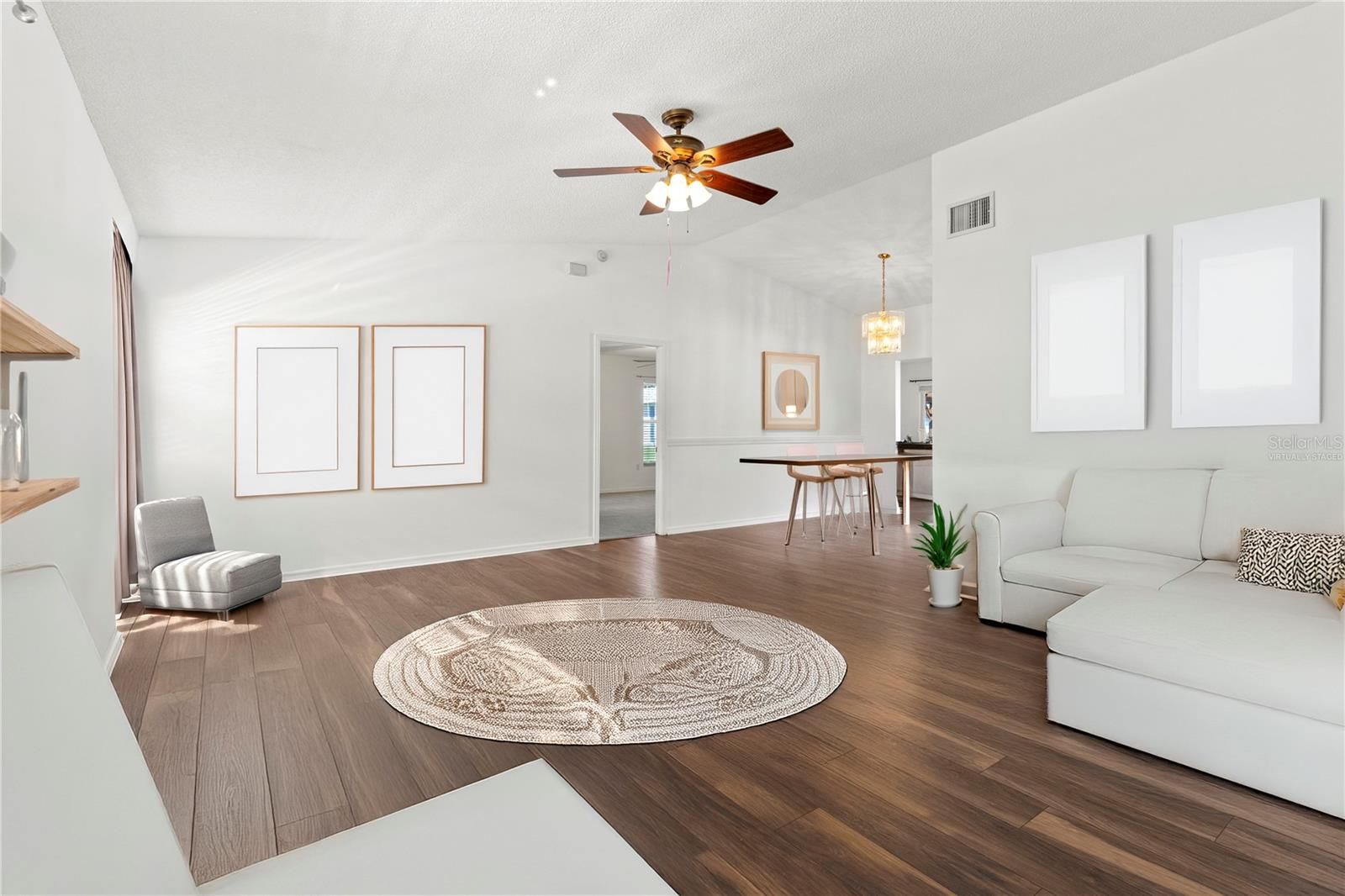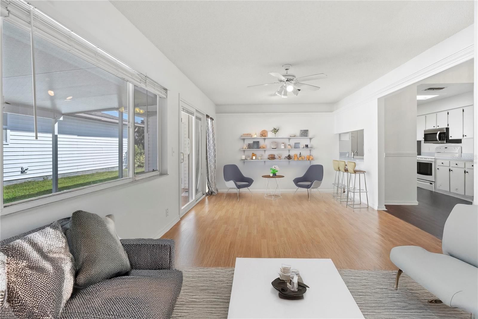 Refreshed and back on the market ! Discover your new home in the sought-after 55+ community of The Colonnades! This delightful two-bedroom, two-bathroom home with a two-car garage is ready for you to move in and enjoy. As you step inside, you’re welcomed by high ceilings and a spacious, open-concept layout that combines the great room, dining area, den, and kitchen. The neutral walls and warm-toned laminate floors create an inviting atmosphere, perfect for personalizing. The expansive bonus room offers a versatile space for morning coffee, casual gatherings, or additional living space. It also connects to a bright, cozy nook that’s ideal for a home office. Sliding glass doors open to a charming, covered patio—perfect for enjoying Florida’s pleasant weather year-round. The primary suite is both roomy and serene, featuring a walk-in closet, linen closet, soft carpeting, and an en-suite bath with dual vanities and a walk-in shower. The guest bedroom is filled with morning sunlight, while the second bathroom adds extra convenience for residents and visitors alike. Outside, the oversized driveway and screened garage door enhance both functionality and curb appeal. Additional highlights include mature landscaping and a generator hookup for peace of mind. The Colonnades community offers fantastic amenities, including a clubhouse, fitness center, swimming pool, and library. The low HOA fee of $173/month covers lawn maintenance, cable, and internet. NEW ROOF 2023 Don’t miss the chance to make this home yours—schedule your private showing today!