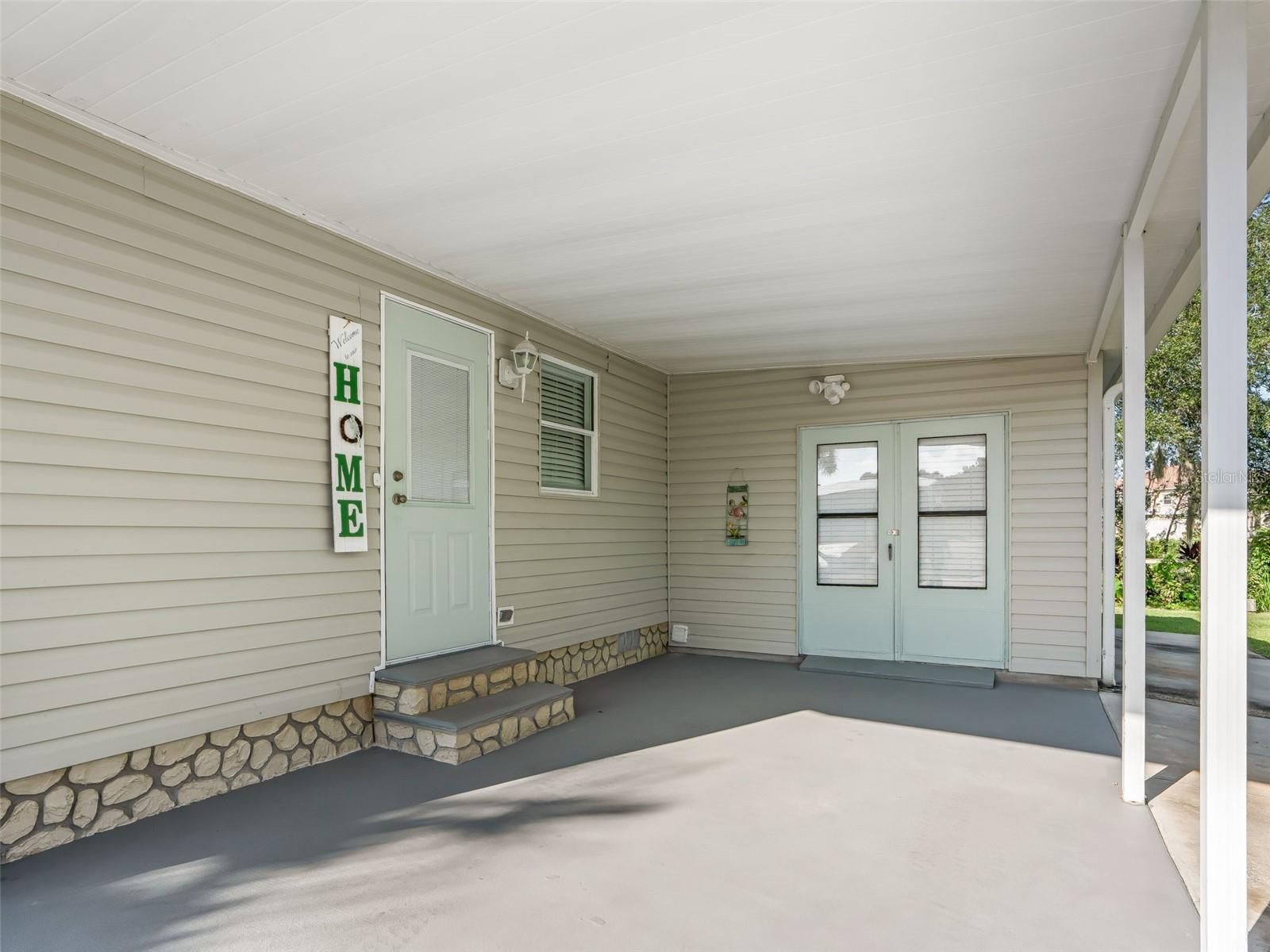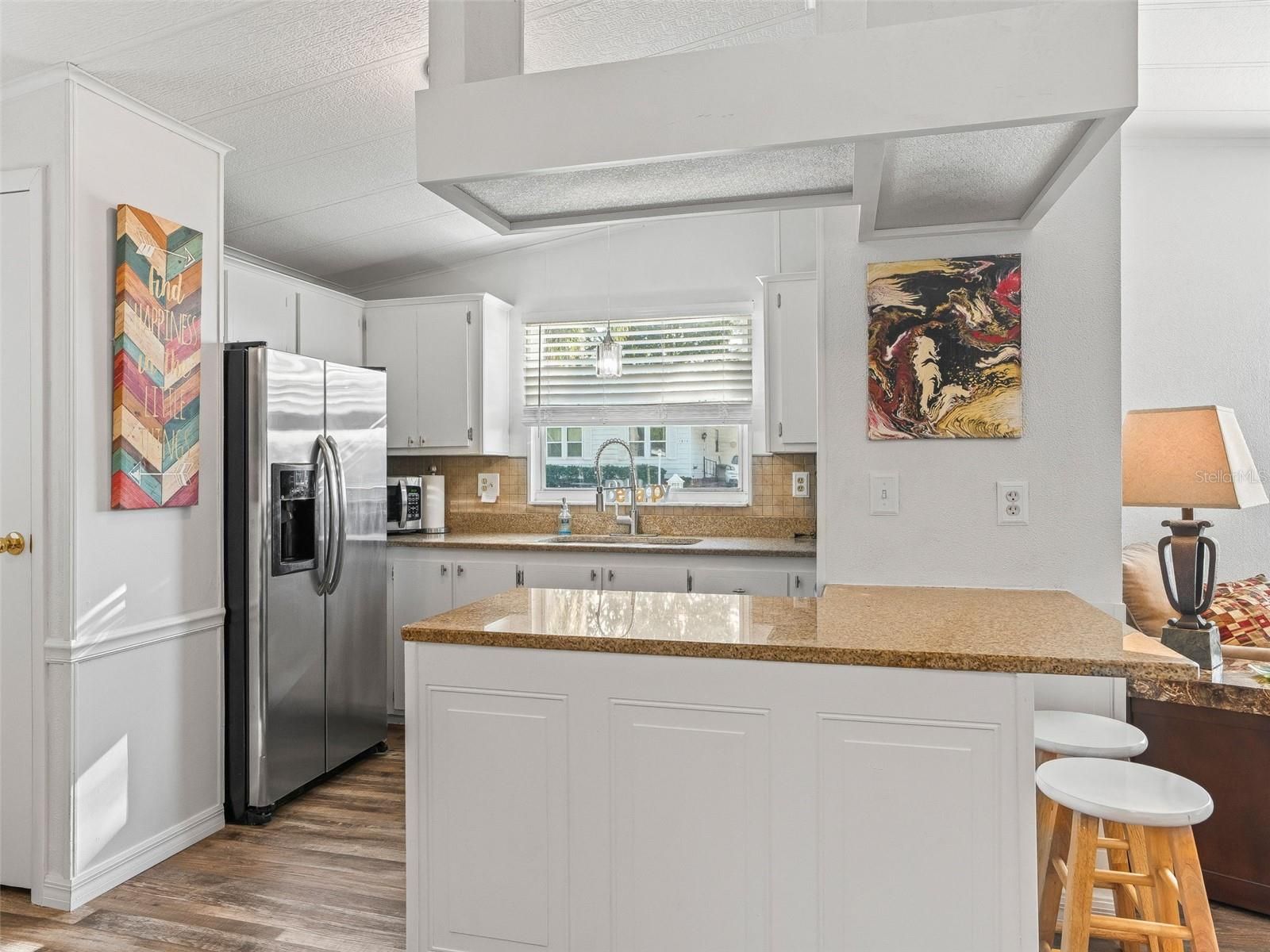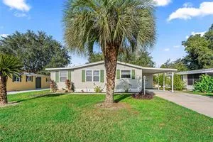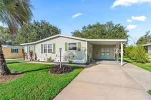 Turn-Key 2/2 Manufactured Home in Country Club Hills. This wonderfully maintained and modern turn-key 2-bedroom, 2-bath manufactured home features a newer roof installed in 2023. Situated in the highly desired Village of Country Club Hills, the property offers privacy with no homes located behind it. Residents will enjoy easy access to excellent golf courses, swimming pools, and recreation centers, all just minutes away. The home is conveniently close to Spanish Springs Town Square and is positioned along the Highway 27/441 corridor, providing an abundance of nearby shopping opportunities. Inside, the home boasts a host of modern updates and amenities. The kitchen is equipped with white cabinets accented by decorative hardware, granite countertops and tile backsplash, and stainless-steel appliances. Laminate flooring extends throughout the entire home, creating a cohesive and stylish look. Both bathrooms, as well as the hall desk and buffet area, feature granite countertops for a touch of elegance. The spacious primary suite is beautifully furnished and includes vaulted ceilings and a large walk-in closet. The primary bathroom offers ample space and a walk-in shower for convenience and comfort. The guest bedroom also features vaulted ceilings and a generous closet, making it an inviting space for visitors. Designed for entertaining, the open layout of the living and dining area is ideal for hosting family and friends for any occasion. A bonus area provides the perfect spot for card games, hobbies, or a round of darts. From this space, step into the private screened-in lanai to enjoy a relaxing evening. The golf cart garage includes a laundry area complete with a washer and dryer, as well as plenty of room for storage. The covered patio and carport have been freshly painted, adding to the home's overall appeal.