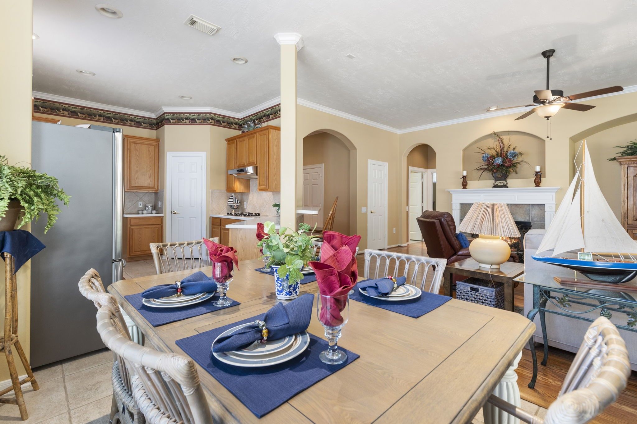 - Breakfast Bar, Double Vanity, Entrance Foyer, High Ceilings, Kitchen/Family Room Combo, Bath in Primary Bedroom, Pantry, Solid Surface Counters, Soaking Tub, Separate Shower, Tub Shower, Makeup/Vanity Space, Window Treatments, Ceiling Fan(s), Programmable Thermostat