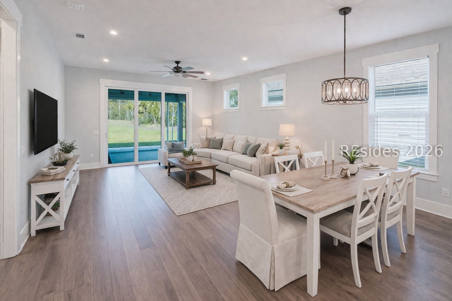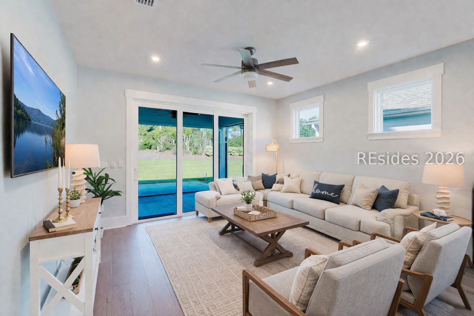Welcome to Fawnwood Court in Sun City Hilton Head, a premier location, this beautifully enhanced home offers exceptional upgrades, quality, space, and comfort. Close proximity to the brand new amenities center just over the bridge and around the corner from the northside amenities. Highlights include hardwood flooring throughout, 3 bedrooms, 3 full bath PLUS a separate den/flex space, extended screened porch, triple sliding glass doors, upgraded cabinetry, Level 3 countertops, KitchenAid appliances, custom trim, and a frameless primary shower. Expanded garage and driveway space, added lighting, electrical upgrades, solar shades, and new gutters provide everyday efficiency and convenience. Move-in ready and thoughtfully designed, this home delivers outstanding value.