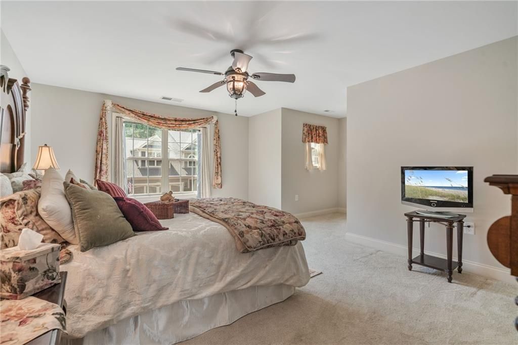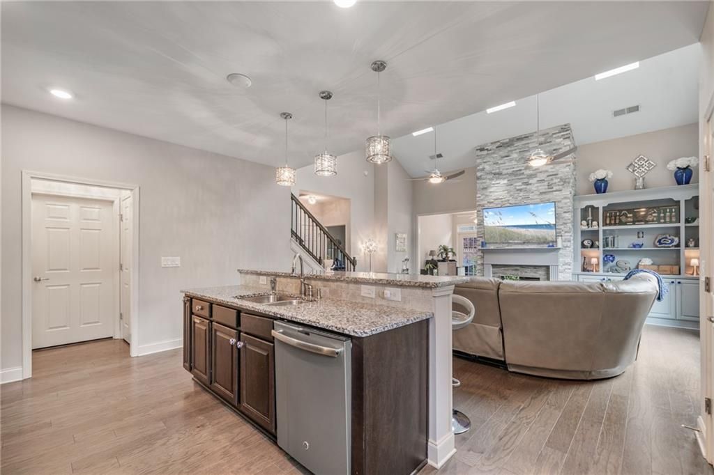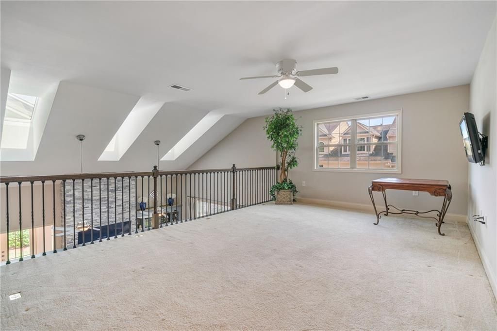 This beautiful home is located in the sought-after, active adult, 55+ community of Orchards of Stoney Point. This townhouse, the largest floorplan available is situated on a desirable corner lot that brings in an abundance of natural light. The professionally landscaped yard includes a sprinkler system and lovely mature trees, creating a serene setting. Inside, you'll find true wood floors, ceramic tile, and carpet throughout. NEW carpet has been installed in Master Bedroom and stairs. The spacious master suite includes a private ensuite, with ceiling fans in both rooms for added comfort as well as TWO Master closets. A charming powder room showcases decorative rock trim, a stylish lavatory with a matching framed mirror, and elegant hanging lighting. Ceiling fans are also found in the great room, all bedrooms, and the upstairs loft. The Great Room itself is a showstopper with a stunning full-wall rock fireplace, built-in shelves and cabinets, cathedral ceilings, triple skylights, and dual ceiling fans. Entertain guests in the separate Dining room, which is accented by a dramatic rock wall. The welcoming foyer opens from the quiet, peaceful front porch, while the sunroom is surrounded by windows tRat let light pour in. The large kitchen offers an eat-in bar and ample cabinetry and counters, gas cooktop, and stainless steel appliances. The refrigerator stays! The laundry room is outfitted with cabinets, shelving, and a utility sink. The two-car garage includes custom wood shelving for extra storage. Upstairs, you’ll find an open loft with a wrought iron railing overlooking the great room, two generously sized bedrooms, and a full bath with a double vanity. There are also two very large storage rooms upstairs. The oversized patio in the private backyard provides the perfect place to relax and enjoy your morning beverage or cookout with friends. With upgraded galore, and the convenience of to Ga. 400, Halcyon, and The Collection at Forsyth, this home truly has it all!