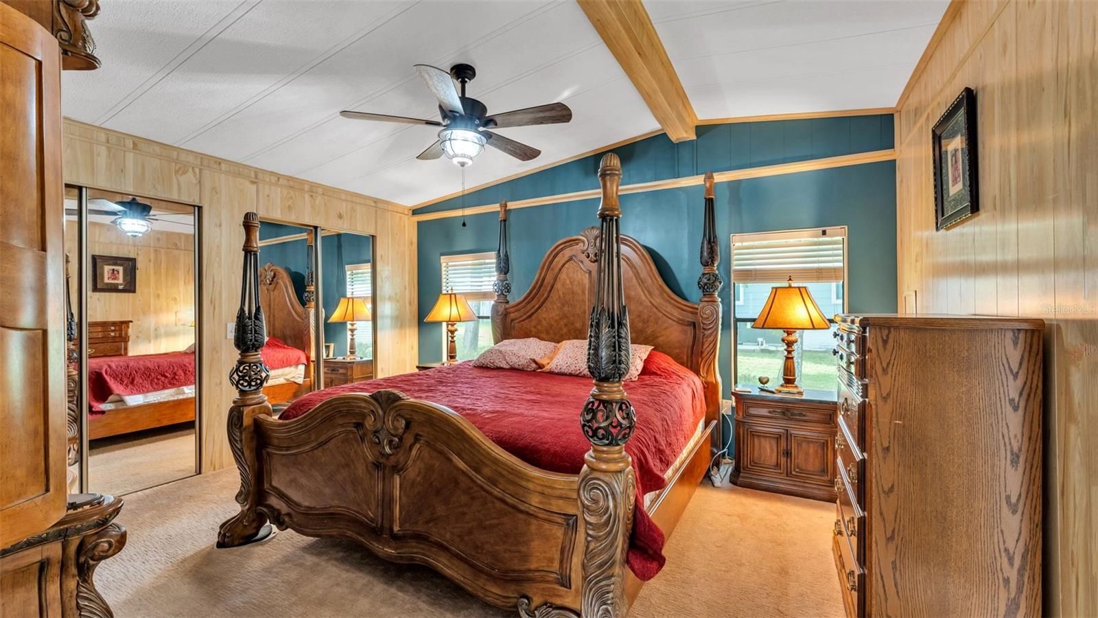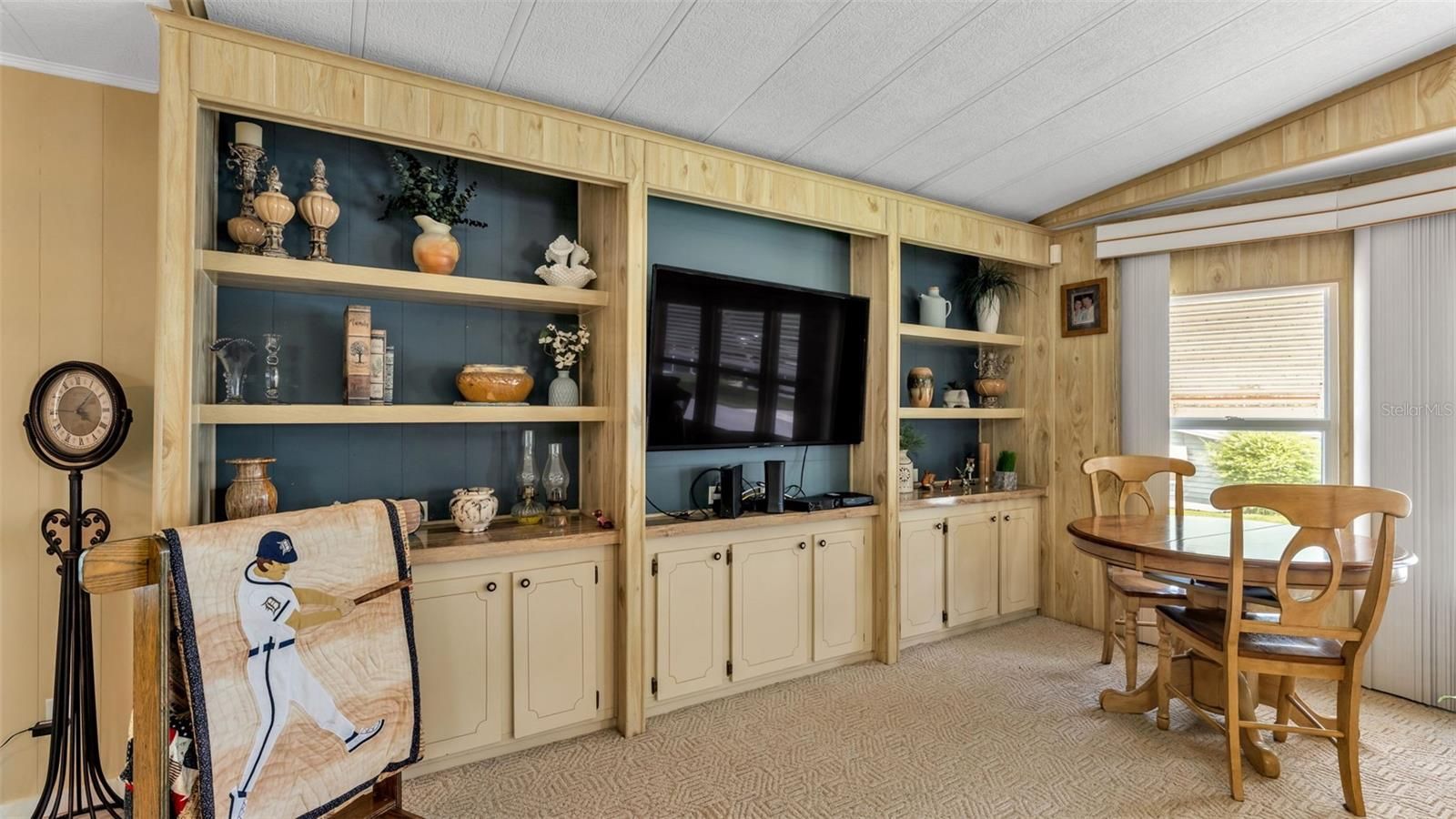 - Built-in Features, Ceiling Fan(s), Eat-in Kitchen, L-Shaped Dining Room, Living/Dining Room, Open Floorplan, Main Level Primary, Solid-Wood Cabinets, Thermostat, Walk-In Closet(s), Window Treatments