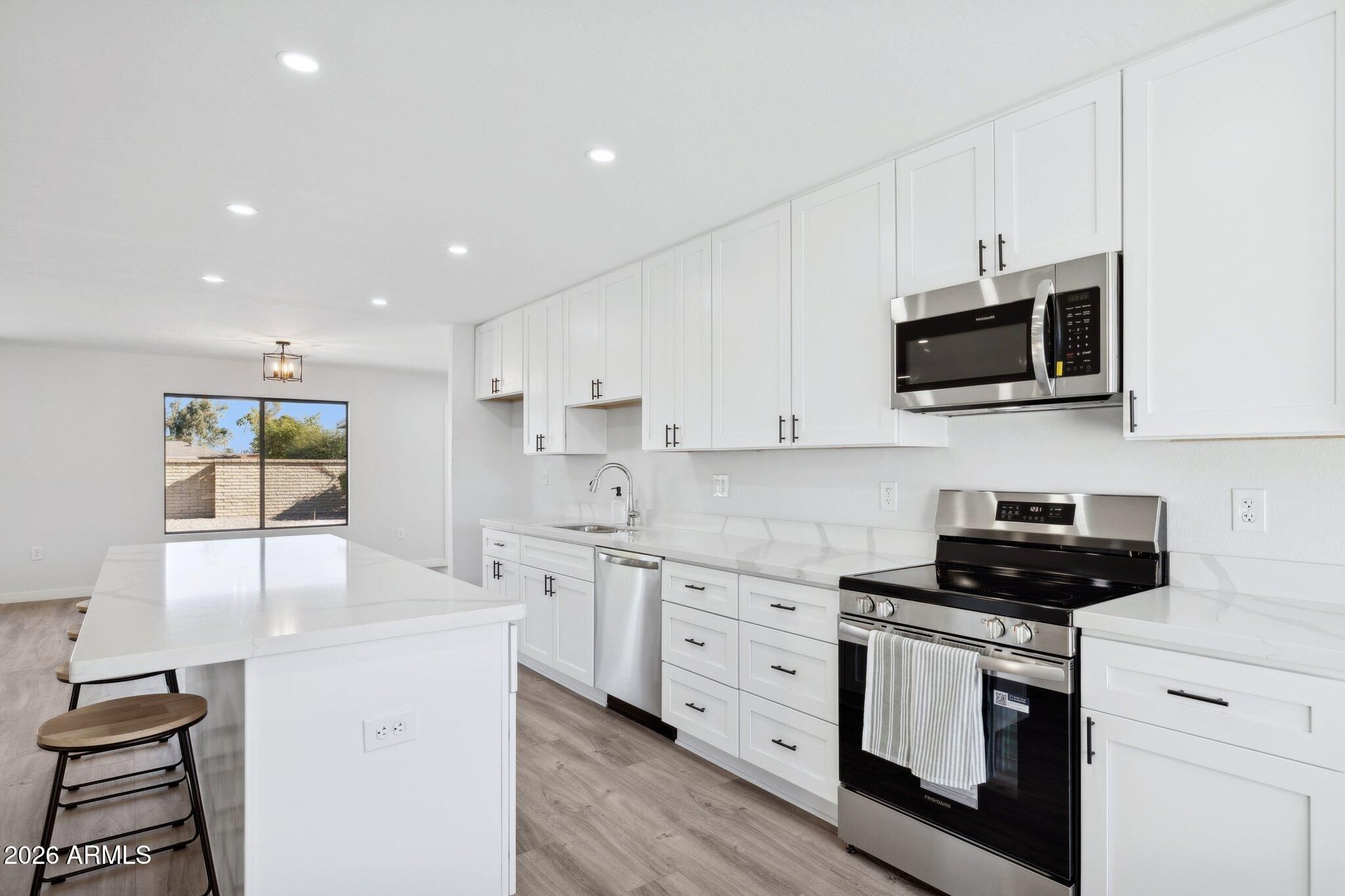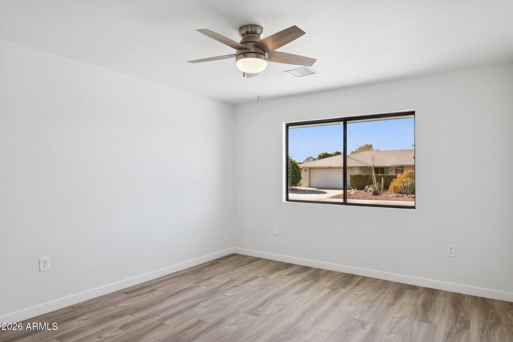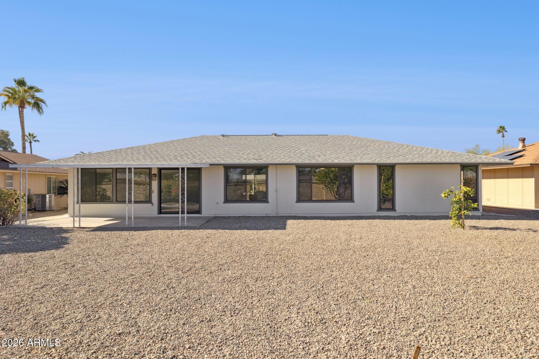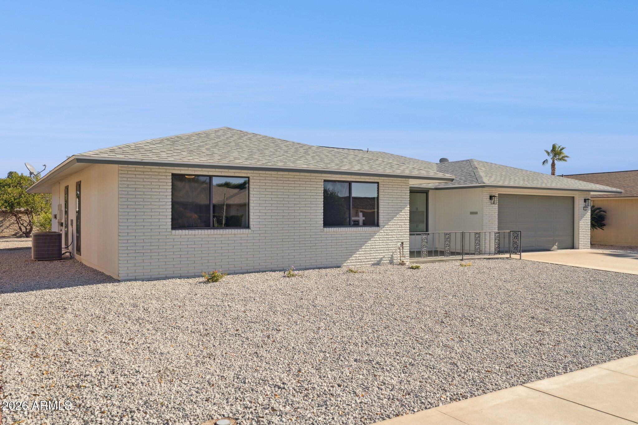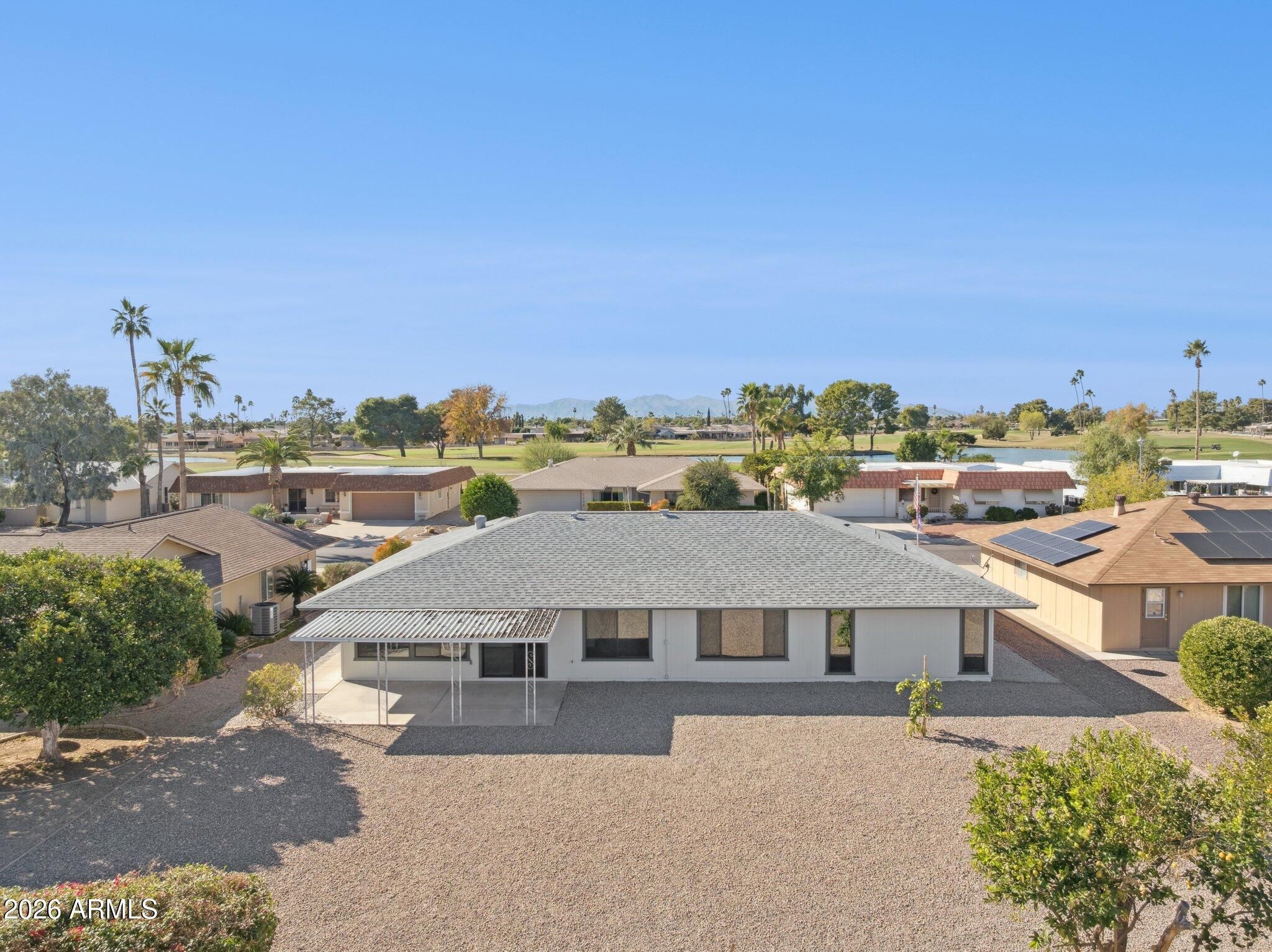 Welcome home to this beautifully remodeled, move-in-ready residence in the highly desirable Sun City active adult community. This home radiates true pride of ownership. Perfectly situated on a 8,880 sq. ft. lot directly across from the Riverview Golf Course, you'll enjoy a peaceful setting in a premier location. The property has been completely transformed inside and out. Both the front and backyard have been thoughtfully reimagined to create stunning, low-maintenance curb appeal and an outdoor oasis. Inside, the home features an open kitchen with new cabinetry, quartz countertops, and stainless steel appliances. Modern comforts include new flooring throughout, new dual-pane windows, and the removal of all popcorn ceilings. With a newer roof and HVAC system, all the heavy lifting has already been done for you. Step inside to a bright and comfortable 1,832 sq. ft. layout designed for everyday ease. The spacious primary suite boasts a large walk-in closet and an ensuite bathroom with a walk-in shower. Additionally, the home features two generous guest bedrooms with ample space for visitors, hobbies, or a home office. These rooms are served by a beautifully updated guest bathroom featuring a full tub. Open living areas create a welcoming, relaxed atmosphere, and a two-car garage provides convenient parking and additional storage. Enjoy Arizona's pleasant weather year-round from the backyard and covered back patio, or the inviting front porchperfect for morning coffee or time with friends. Ideally located just minutes from golf, recreation centers, and the shopping along Bell Road, this home offers the turnkey comfort, convenience, and community Sun City is known for.