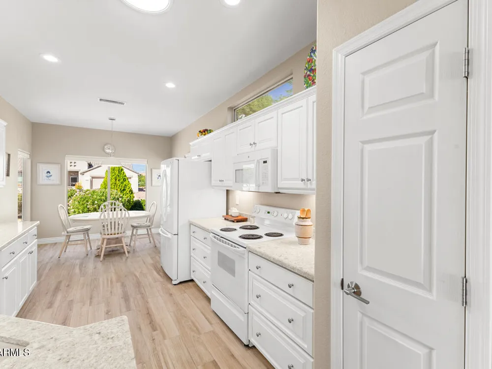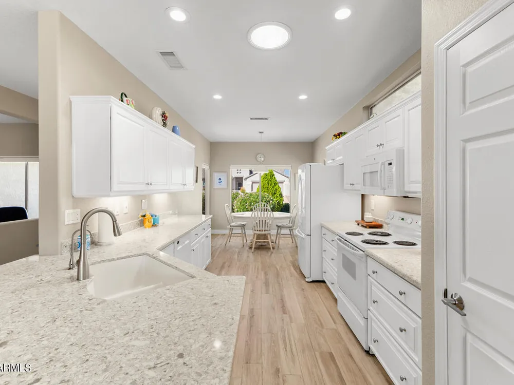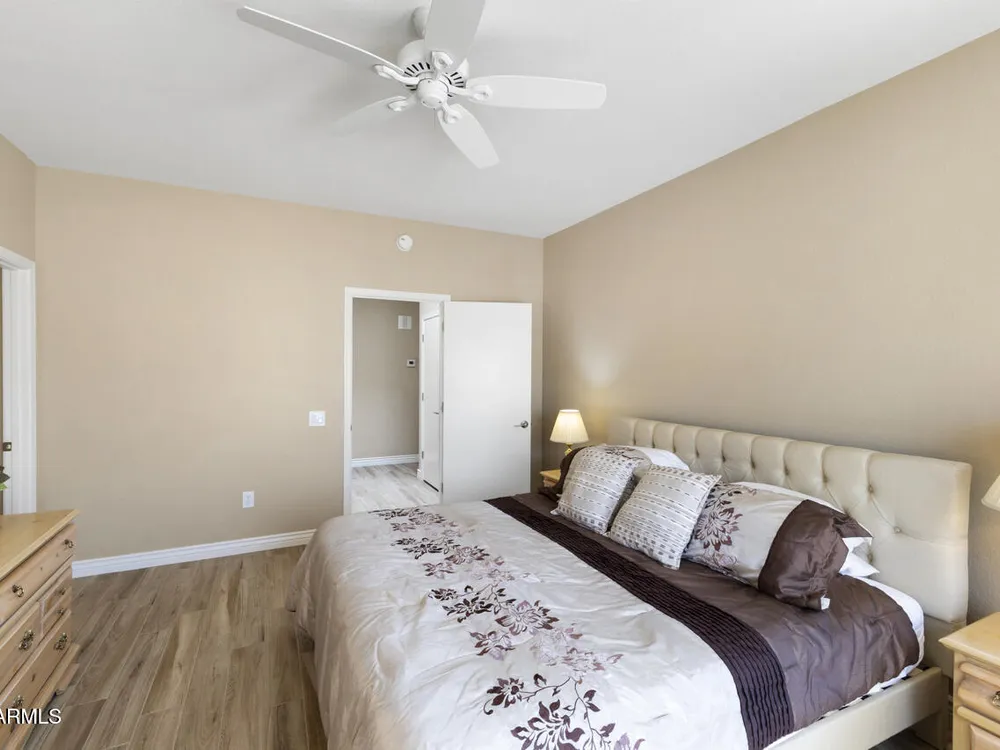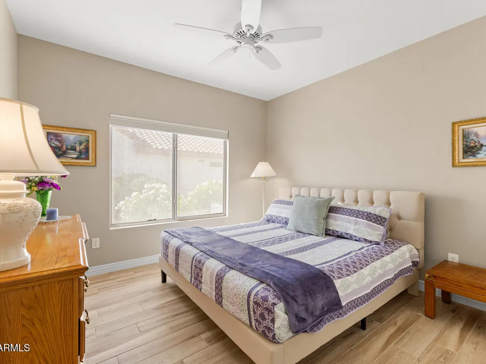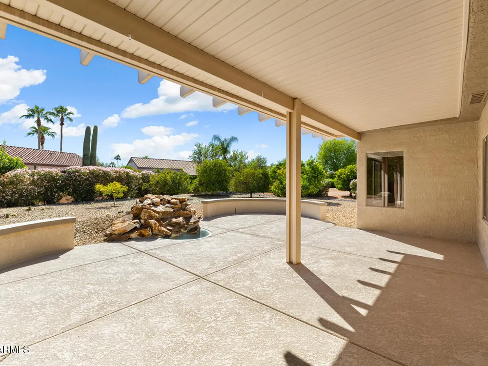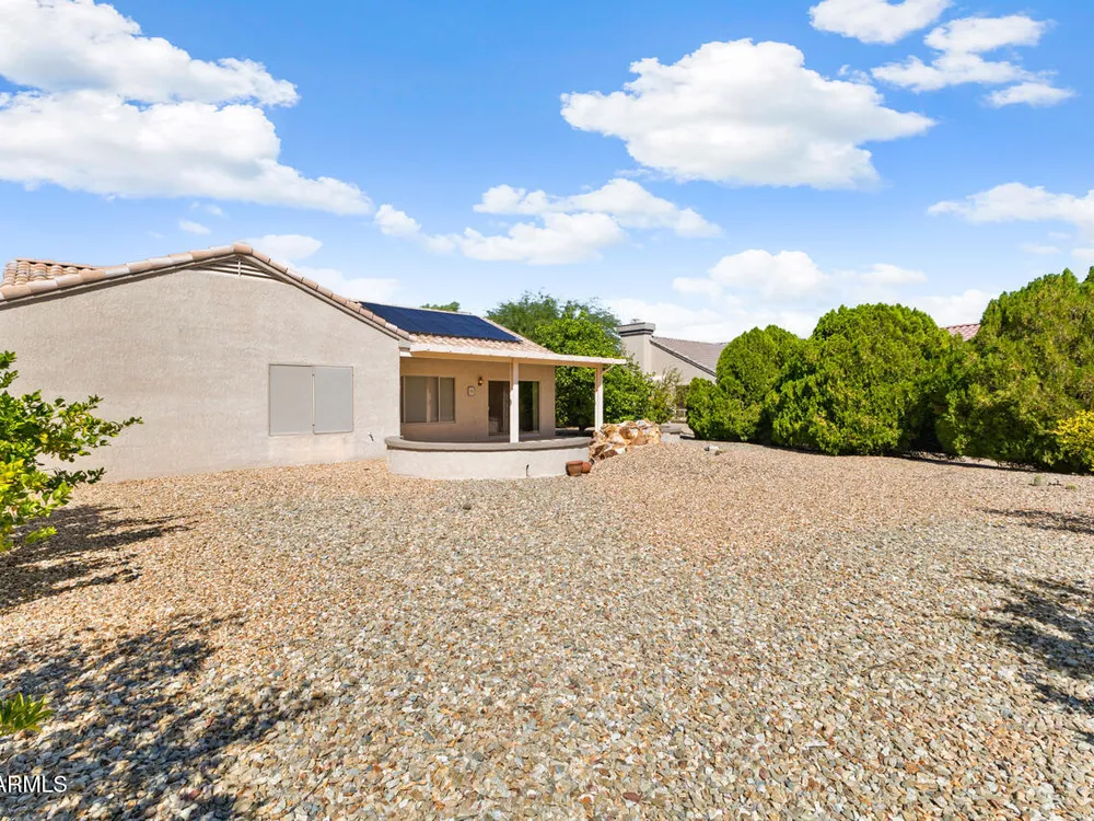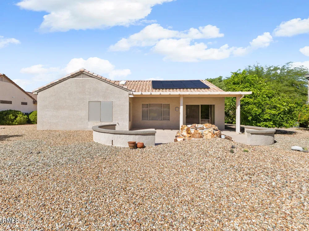 Beautifully updated and TURN - KEY Madera offers peace of mind with major improvements already done—including a new roof, new Trane HVAC, a new 50-gallon water heater. Owned solar keeps energy costs low (average APS just $60/month), and the system comes with a 10-year parts warranty. Inside, you'll find wood-look porcelain tile throughout, large base moldings, and fresh paint creating a bright, modern feel. The kitchen has been remodeled with additional cabinetry, closing off the front entry to maximize storage and functionality. All interior doors and bathroom cabinets have been freshly painted, with new Moen Voss faucets, chair-height Kohler toilets, and updated brushed nickel hardware throughout. Other thoughtful touches include new Hunter fans, Bali up/down cellular shades (motorized in the great room), solar tubes, LED lighting, and skylights that fill the home with natural light. The laundry room includes cabinetry and a utility sink. The extended 2-car garage features cabinets and a freshly coated Polyaspartic Sandstone floorwith a fun twist of rainbow glitter! Outside, enjoy Arizona living with a recoated front walkway, refreshed backyard fountain, and power-washed, painted patio and pony walls. The irrigation system has been converted to drip for efficiency. The large private lot features a lovely water feature and plenty of room to relax or entertain.