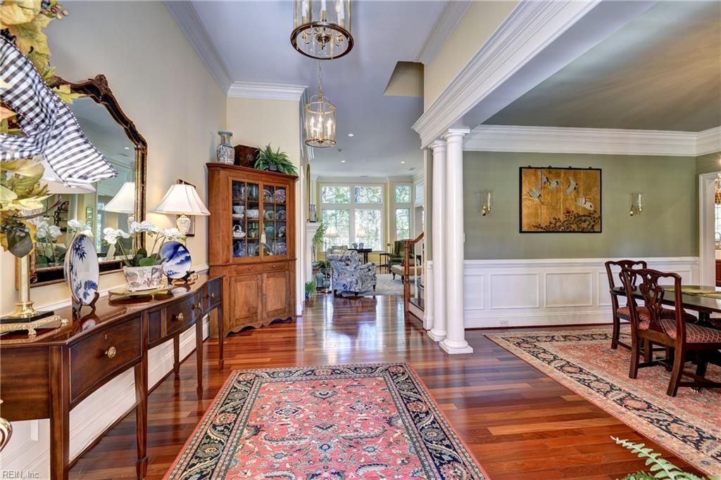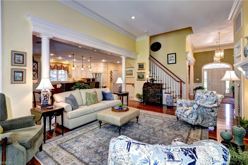 This Cape Cod–style home with its gracious Southern Living porch is perfectly sited along a tranquil estuary framed by trees and a distant tidal marsh—an ideal haven for bird-watching and privacy. Set on one of Governor’s Land’s most desirable streets, the home offers timeless architecture and comfortable sophistication. A dramatic 14-foot foyer opens to the dining room and a spectacular great room with soaring ceilings, gas fireplace, and walls of windows capturing the serene landscape. The open kitchen features a large center island, gas cooking, walk-in pantry, and coffee/wine bar with sink. The breakfast area opens to a grilling deck and screened porch. The first-floor primary suite includes a tray ceiling, two walk-in closets, and a luxurious en suite bath. Upstairs, a private suite offers a bedroom, recreation area, and bath. The walk-out lower level features a family room with stacked-stone fireplace, built-ins, sunroom, second primary suite, flex rooms, and conditioned storage.
