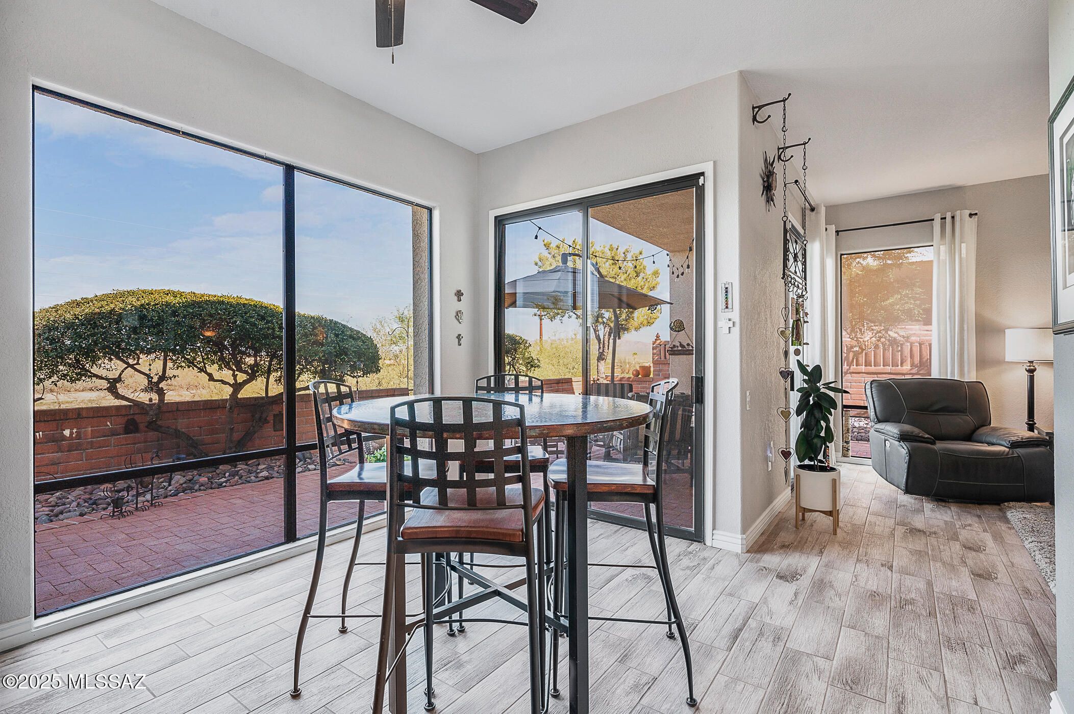 Realize the quintessence of retirement living in sunny Arizona, explicitly designed for active retirees looking to bask in the warmth and beauty of the Southwest. Imagine stepping through a captivating courtyard entrance, greeted by the verdant charm of lush greenery and the unique allure of an Elephant Foot Palm tree at your doorstep. This haven has been completely refreshed to provide a modern and inviting atmosphere, boasting wood-look tile flooring and soothing neutral paint colors that create a serene canvas for your personal touches. Step inside to an interior bathed in natural light, with 10-foot ceilings and floor-to-ceiling windows that frame the pristine natural desert landscape beyond. The expansive living area seamlessly transitions into an elegant dining room, offering the