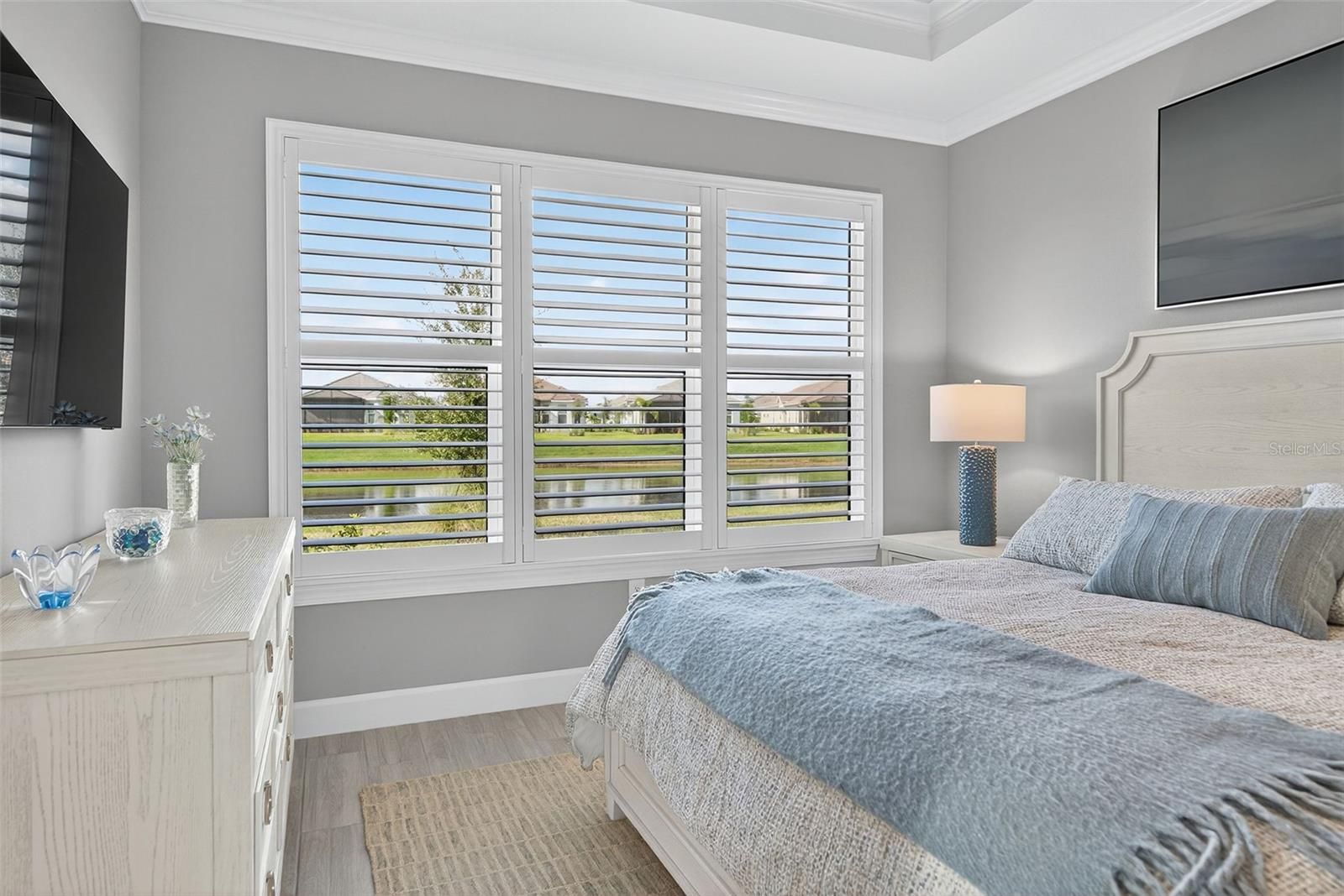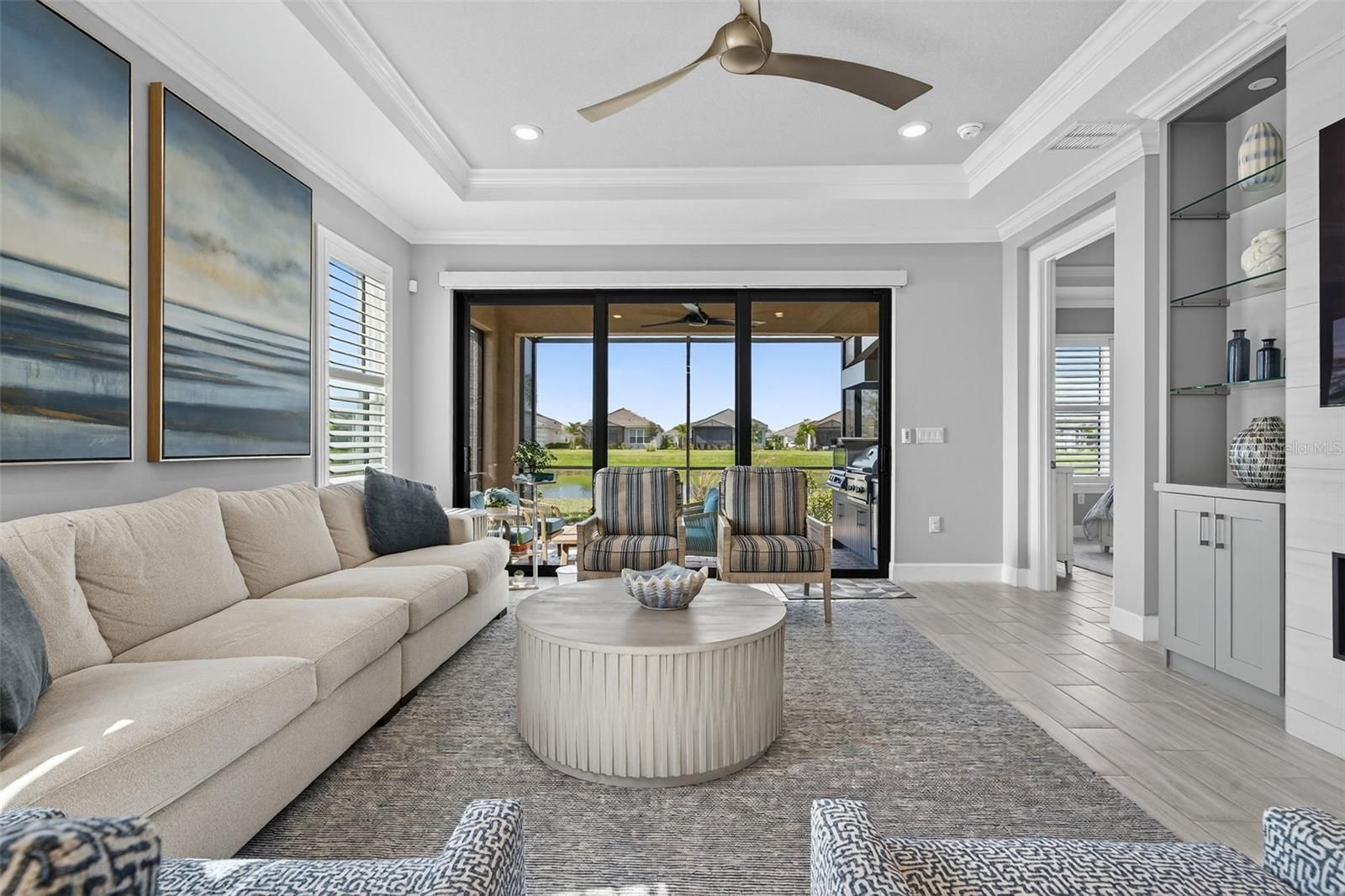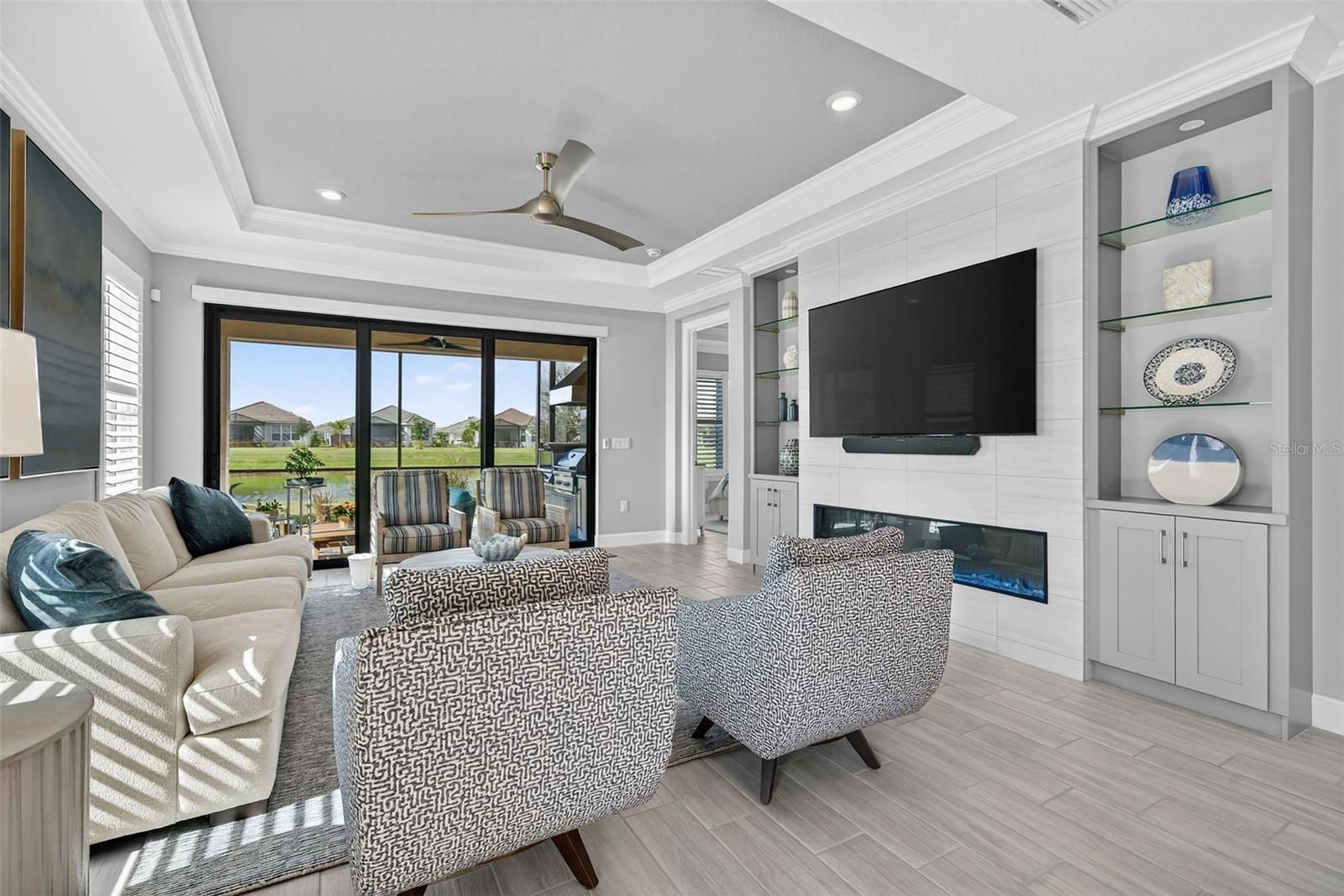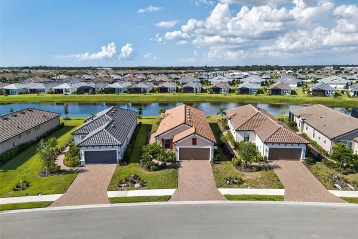 Extremely Upgraded, Golf-deeded, water view Arezzo! A refined expression of resort-inspired luxury awaits at 16221 Fortezza Drive, perfectly positioned on a tranquil lakefront homesite within the coveted Esplanade at Azario. Thoughtfully enhanced with premium upgrades throughout, this impeccably curated residence delivers a seamless blend of timeless modern design, smart-home functionality, and an amenity-rich golf community lifestyle—complete with ample space to add a custom pool overlooking sparkling water views. From the moment you arrive, architectural sophistication sets the tone. High tray ceilings adorned with custom crown molding, plank tile flooring throughout, plantation shutters, and expansive hurricane-impact windows create a bright, airy ambiance that feels both polished and welcoming. The open-concept great room is anchored by a sleek electric fireplace, enhanced by motorized shades, offering effortless comfort and elevated design for everyday living and entertaining alike. The chef-inspired kitchen is a true showpiece, featuring Café Performance appliances, crown molding atop custom cabinetry, LED under-cabinet lighting, refined countertops, and a built-in wine refrigerator—perfectly suited for hosting gatherings that flow seamlessly into the dining and living spaces. Oversized sliders and French doors with custom shades lead to the expansive extended lanai, finished with pavers and an extended screen enclosure, creating an exceptional indoor-outdoor living experience. Outdoors, the custom-designed kitchen—complete with a built-in grill, pizza oven, and refrigerator—sets the stage for unforgettable alfresco dining, sunset cocktails, and entertaining against serene lake views. Professionally designed path lighting enhances the atmosphere, while the generous backyard offers abundant room to design your dream pool and spa. The thoughtfully designed floor plan includes three spacious bedrooms, each outfitted with custom-built closet systems, and two luxurious bathrooms featuring spa-inspired finishes. A versatile office/den with upgraded French doors provides flexibility for a home office, private retreat, or easily functions as a fourth bedroom. A spacious laundry room with abundant cabinetry and counter space further enhances everyday convenience. Additional premium features include a whole-home filtration and water softener system, whole-house surge protector, generator, alarm system with A/C and heat control, and extensive garage upgrades—epoxy flooring, custom closet storage, wall-mounted racks, and an extended garage—delivering both form and function at every turn. Residents of Esplanade at Azario enjoy a premier golf community lifestyle, offering championship golf, resort-style pools, wellness and fitness amenities, tennis, pickleball, on-site dining, and a vibrant social calendar—all within one of Bradenton’s most desirable addresses.