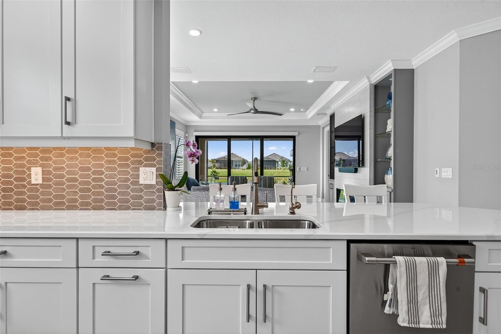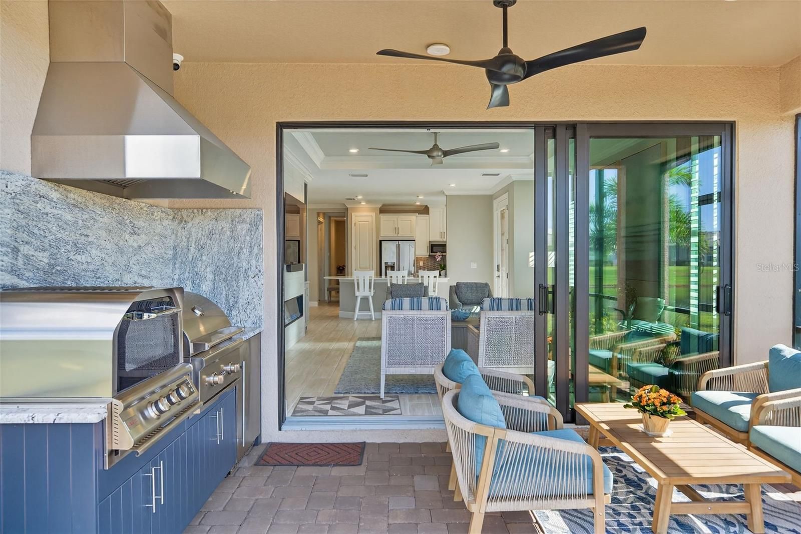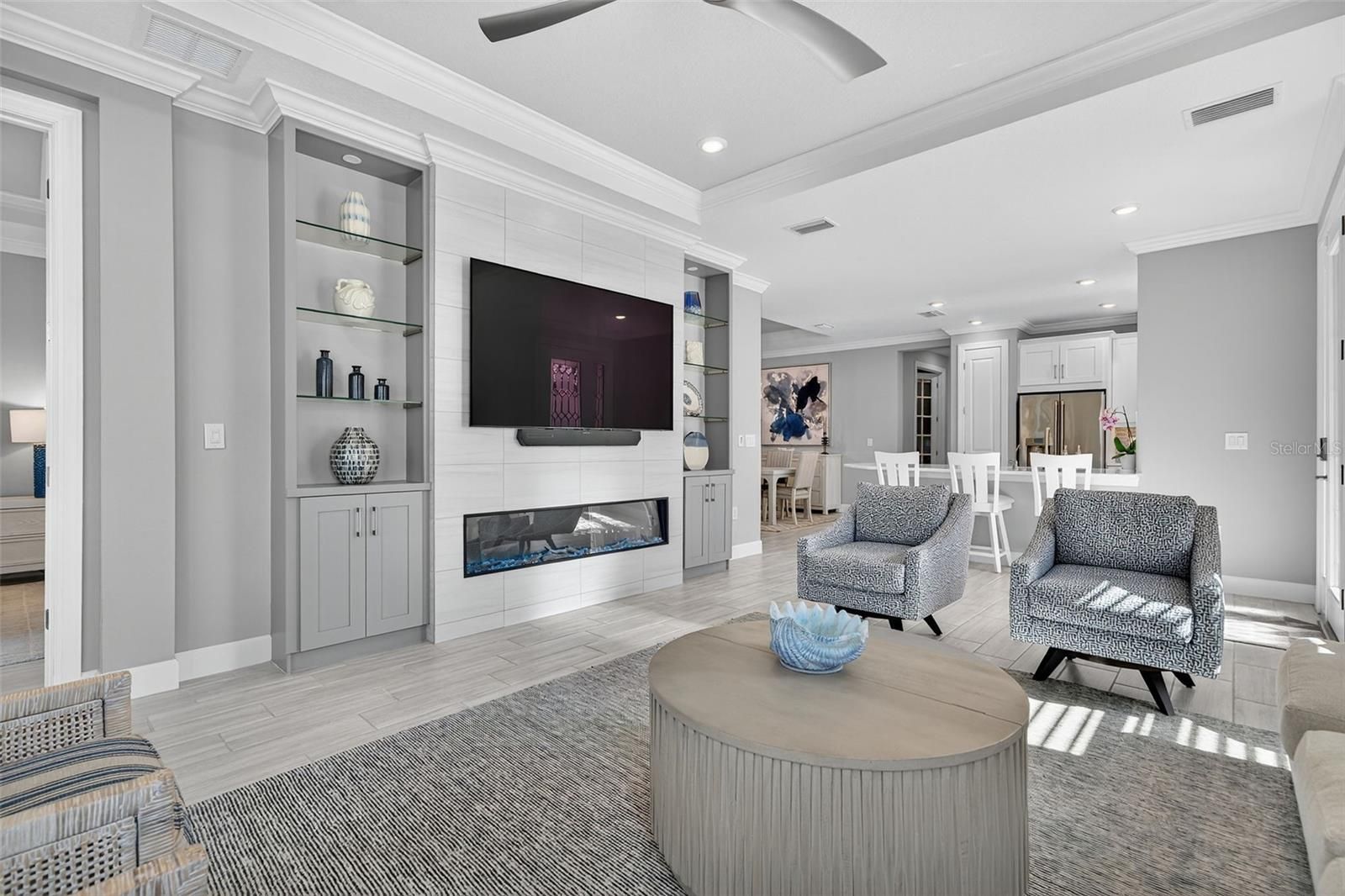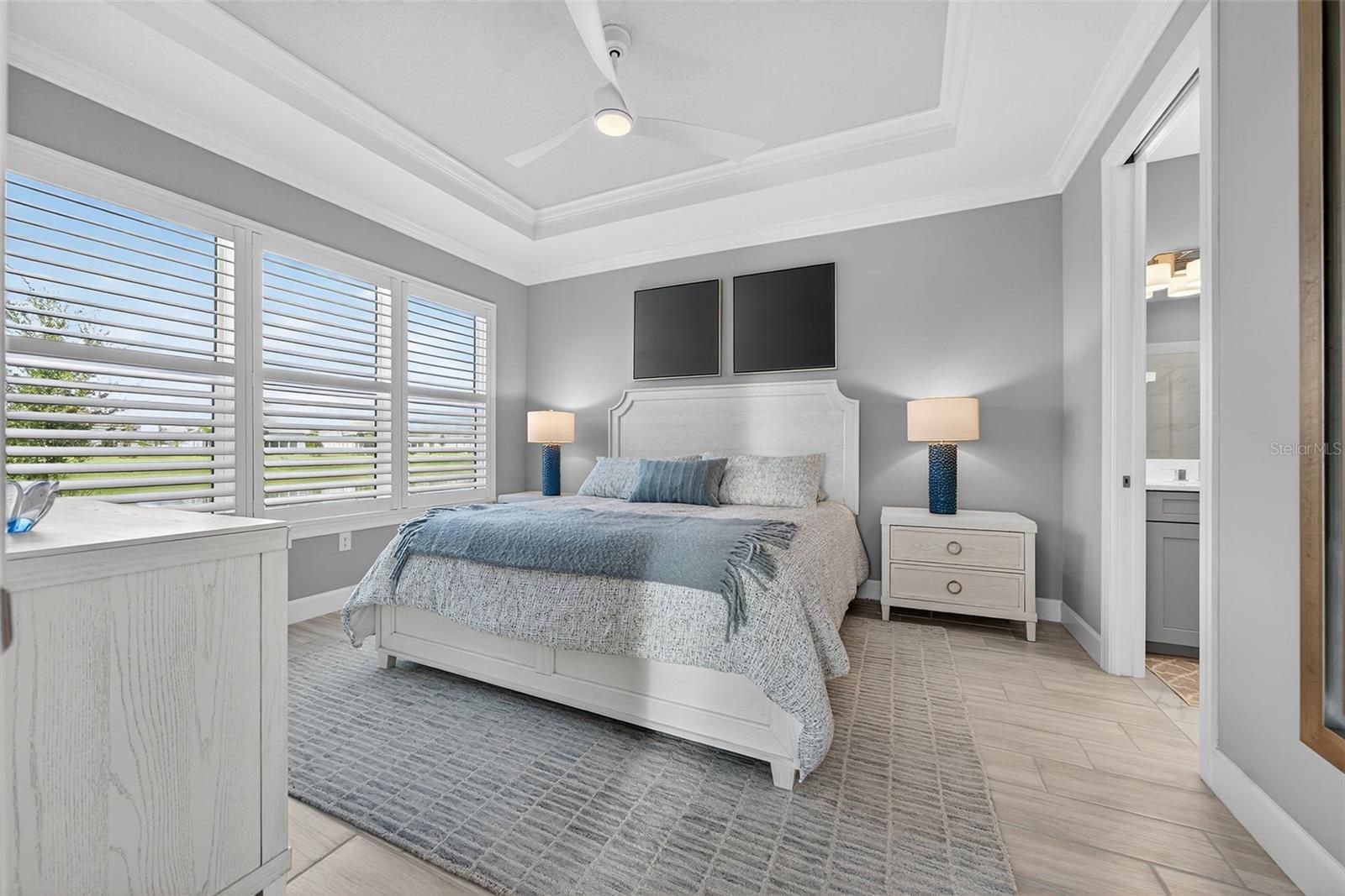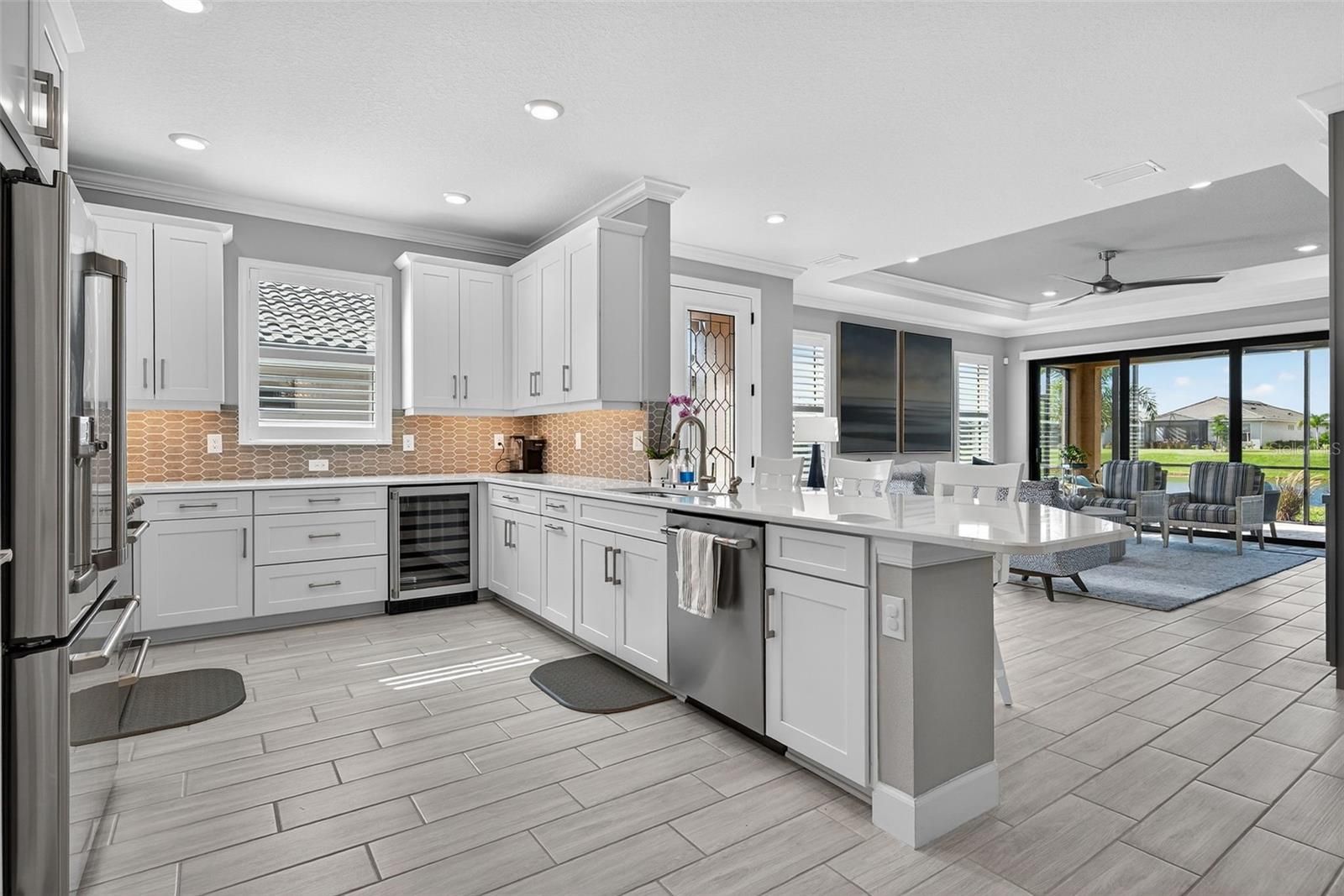 Extremely Upgraded, Golf-deeded, water view Arezzo! A refined expression of resort-inspired luxury awaits at 16221 Fortezza Drive, perfectly positioned on a tranquil lakefront homesite within the coveted Esplanade at Azario. Thoughtfully enhanced with premium upgrades throughout, this impeccably curated residence delivers a seamless blend of timeless modern design, smart-home functionality, and an amenity-rich golf community lifestyle—complete with ample space to add a custom pool overlooking sparkling water views. From the moment you arrive, architectural sophistication sets the tone. High tray ceilings adorned with custom crown molding, plank tile flooring throughout, plantation shutters, and expansive hurricane-impact windows create a bright, airy ambiance that feels both polished and welcoming. The open-concept great room is anchored by a sleek electric fireplace, enhanced by motorized shades, offering effortless comfort and elevated design for everyday living and entertaining alike. The chef-inspired kitchen is a true showpiece, featuring Café Performance appliances, crown molding atop custom cabinetry, LED under-cabinet lighting, refined countertops, and a built-in wine refrigerator—perfectly suited for hosting gatherings that flow seamlessly into the dining and living spaces. Oversized sliders and French doors with custom shades lead to the expansive extended lanai, finished with pavers and an extended screen enclosure, creating an exceptional indoor-outdoor living experience. Outdoors, the custom-designed kitchen—complete with a built-in grill, pizza oven, and refrigerator—sets the stage for unforgettable alfresco dining, sunset cocktails, and entertaining against serene lake views. Professionally designed path lighting enhances the atmosphere, while the generous backyard offers abundant room to design your dream pool and spa. The thoughtfully designed floor plan includes three spacious bedrooms, each outfitted with custom-built closet systems, and two luxurious bathrooms featuring spa-inspired finishes. A versatile office/den with upgraded French doors provides flexibility for a home office, private retreat, or easily functions as a fourth bedroom. A spacious laundry room with abundant cabinetry and counter space further enhances everyday convenience. Additional premium features include a whole-home filtration and water softener system, whole-house surge protector, generator, alarm system with A/C and heat control, and extensive garage upgrades—epoxy flooring, custom closet storage, wall-mounted racks, and an extended garage—delivering both form and function at every turn. Residents of Esplanade at Azario enjoy a premier golf community lifestyle, offering championship golf, resort-style pools, wellness and fitness amenities, tennis, pickleball, on-site dining, and a vibrant social calendar—all within one of Bradenton’s most desirable addresses.