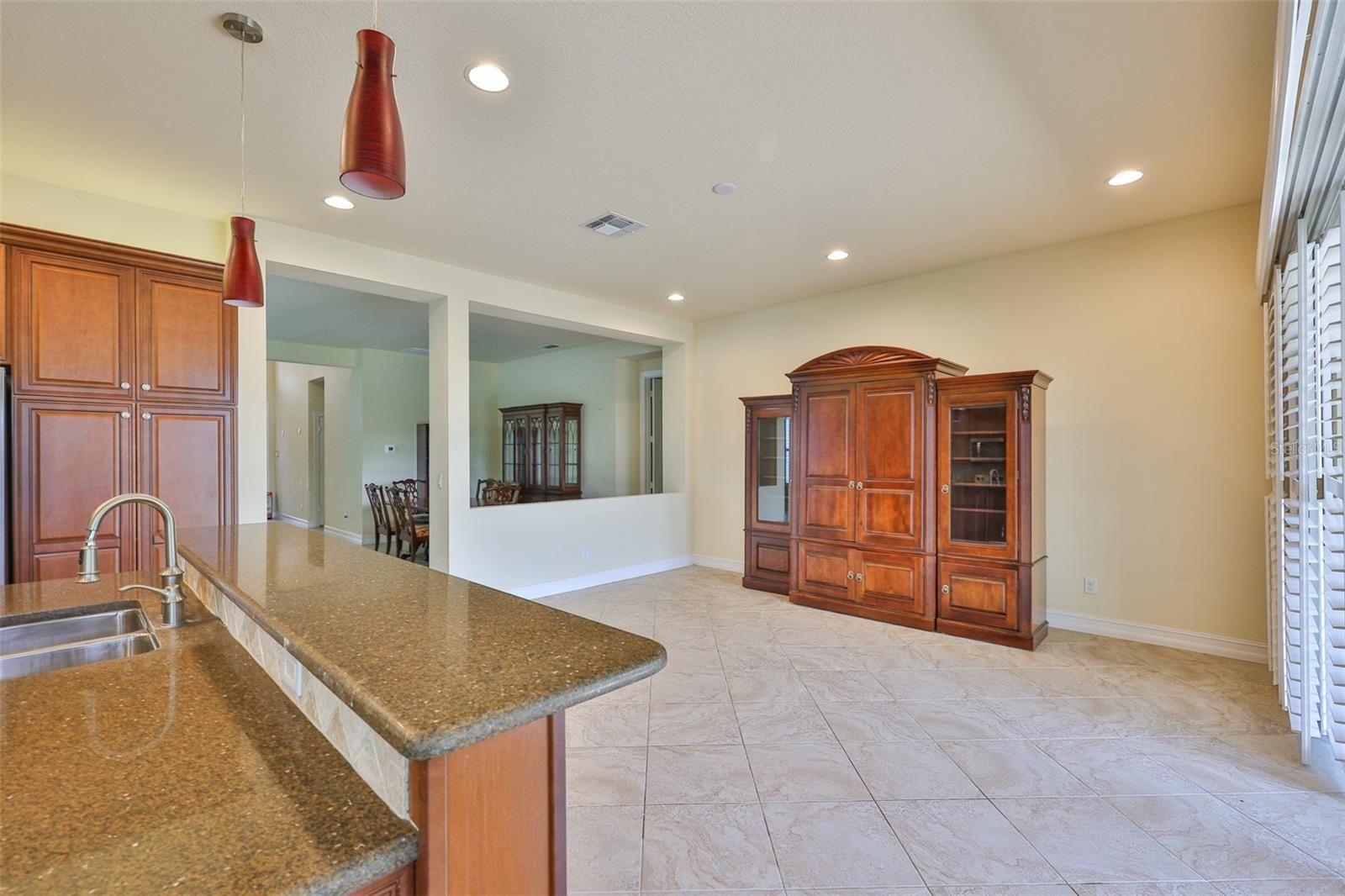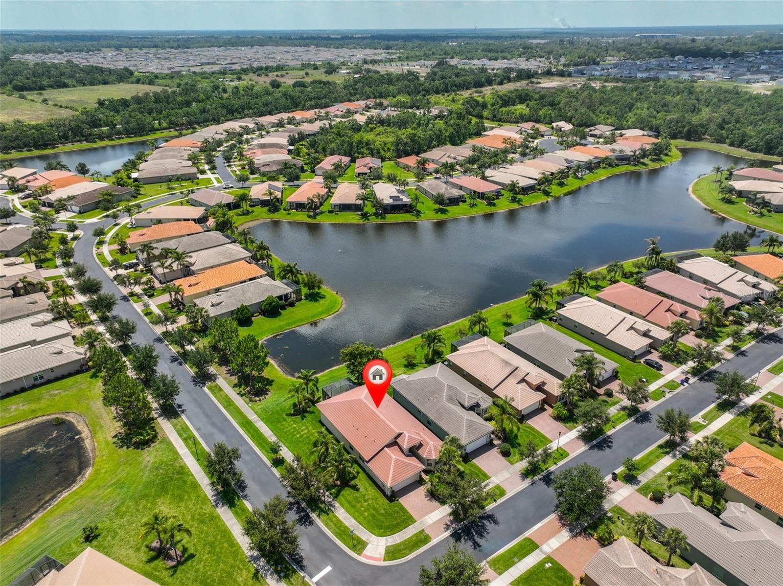 Elegant, spacious, and perfectly situated welcome to your dream home in Valencia Lakes! This 4-bedroom, 3-bath corner lot property offers breathtaking lake views not just from your backyard, but also from across the street, creating a serene backdrop from every angle. Step into high ceilings, plantation shutters, and granite countertops, new carpet in the master bedroom, all complemented by new appliances, a new water heater, and a whole-home water filtration system. Enjoy gatherings in the formal dining room, breakfast nook area or unwind in your fully screened-in back lanai with pavers, ideal for peaceful outdoor living. With added features like gutters and resort-style amenities exclusive to this 55+ gated community, this home delivers both comfort and class. This sought-after community has an amazing 40,000 square feet clubhouse offering entertainment shows, dances, over 100 Clubs, a 5,000SF 24/7 State-of-the Heart Fitness Center, Beach entry Resort-style pool, 5 Lane-Lap pool, Resistance pool, Spa, Saunas, 2 Multi-Purpose Fitness Rooms hosting a variety of Classes with certified fitness instructors, Games Rooms, 7 Pickleball courts, 6 USTA Har-Tu Clay Tennis courts, Bocce, Shuffleboard, Basketball Half-Court, Softball Field, RV & Boat Storage, Garden plots, Dog Park a venerated Memorial Honor Circle.