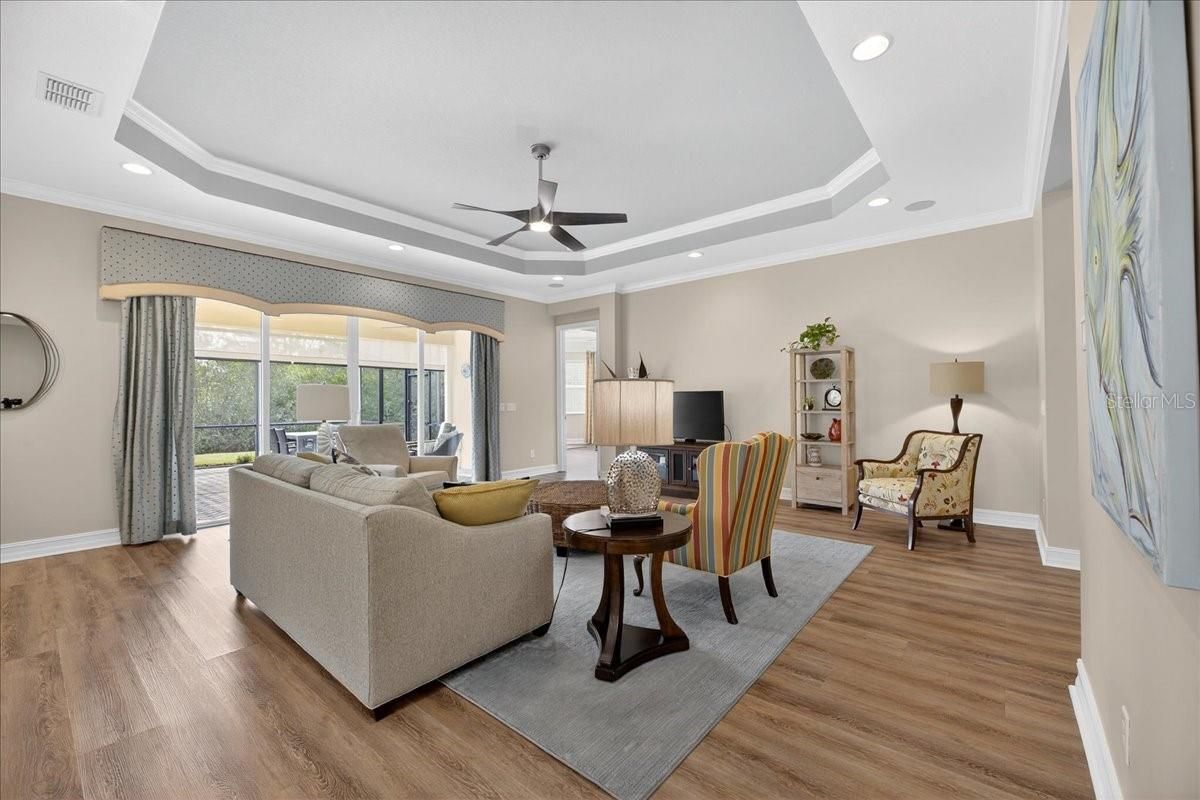 Welcome to Valencia Lakes, one of Southeast Tampa’s most sought-after 55+ active lifestyle communities, perfectly situated in the Wimauma/Sun City Center area. Designed for those who want to enjoy resort-style living with everyday convenience, this gated community offers an unmatched Florida lifestyle filled with amenities, activities, and connection. This meticulously maintained and beautifully upgraded Bellagio floorplan offers the perfect blend of elegance, comfort, and functionality. Featuring 3 spacious bedrooms, 3 full bathrooms, a private office/den, and a 3-car garage, this home is thoughtfully designed for both everyday living and entertaining. Set on a peaceful preserve lot, the home provides added privacy and serene views from the extended screened lanai, already pre-plumbed for a pool and spa—ideal for creating your own outdoor retreat. Inside, you’ll find an open, light-filled layout enhanced by luxury vinyl flooring (2021), crown molding, tray ceilings, and 8-foot doors throughout, fans in all rooms adding to the home’s upscale feel. The updated kitchen is a standout, with its unique open dining room/kitchen featuring white cabinetry, quartz countertops, a stylish backsplash, an exterior-vented exhaust fan, and a newer induction oven, making it as functional as it is beautiful. The garage is equally impressive with epoxy flooring, built-in cabinetry, hanging storage, and ample space for vehicles and hobbies. Additional upgrades include a water softener, gutters, irrigation with drip lines, hurricane shades at the rear, accordion shutters, plantation shutters, a new A/C system (2025), updated bathrooms and custom window treatments throughout. The tile roof is professionally cleaned twice a year, offering both peace of mind and lasting curb appeal. Living in Valencia Lakes means access to a resort-style clubhouse, fitness center, restaurant, swimming pools, walking trails, pickleball and tennis courts, and hundreds of clubs and activities to match every interest. Boat and RV storage is also available for an additional fee. Highly desired for its lifestyle, amenities, and location, Valencia Lakes truly delivers the Florida lifestyle you’ve been dreaming of—where every day feels like a vacation and your home is the perfect place to enjoy it all.