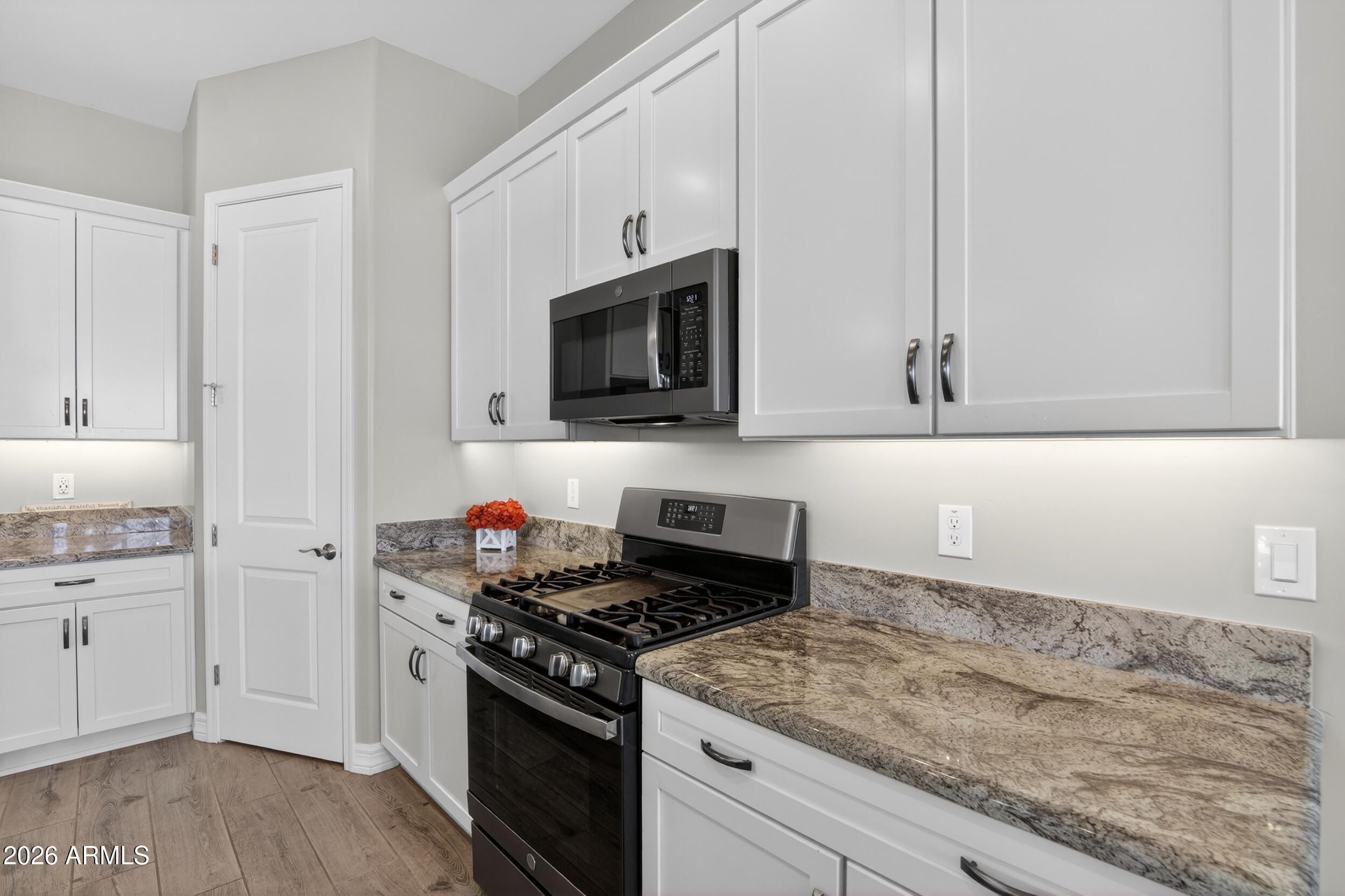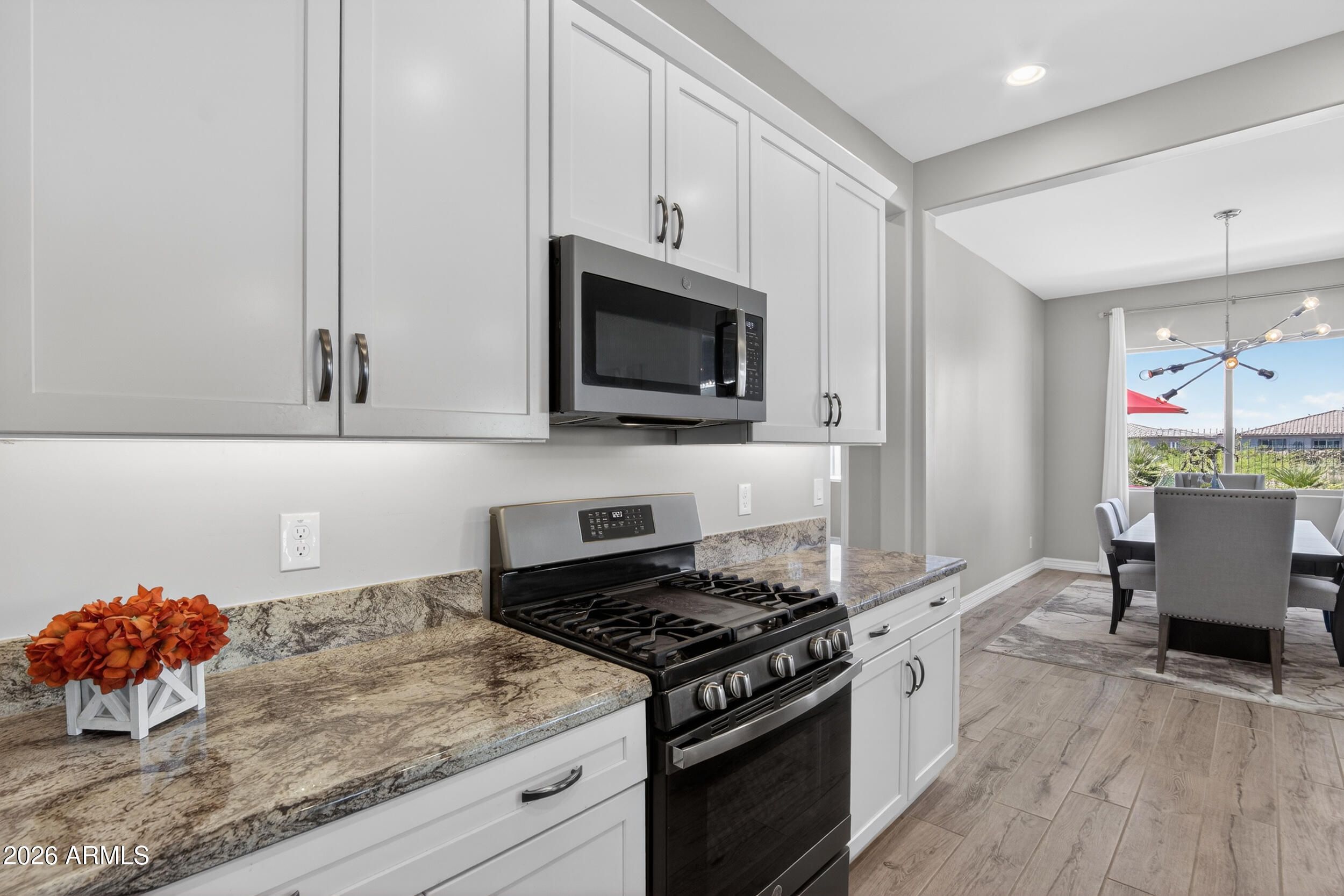 Welcome to this beautifully maintained home in the gated community of CantaMia. The open layout brings the kitchen, dining, and living areas together with white cabinetry, granite counters, a gas range, pantry, island seating, and great natural light. The spacious primary suite offers dual sinks, a walk-in shower, and a large closet, while the separate guest room and flex space give buyers options for an office or den with a built in Hideaway BED! A large sliding glass door opens to the covered patio and backyard with a pool, spa, fire feature, and mountain views. Oversized** 2.5 / 3 CAR** garage and access to CantaMia and Estrella amenities including walking paths, fitness, pickleball, clubs, Gated community and more. Premium oversized VIEW LOT, back yard is your very own RESORT!!!!!!!! CANTAMIS is a 55+ ACTIVE adult community with exclusive Resort Style amenities.. MUST see pictures. SOLAR Savings... $$$$ Solar owned system save on utility bills - energy efficient.