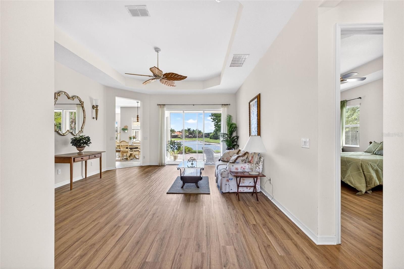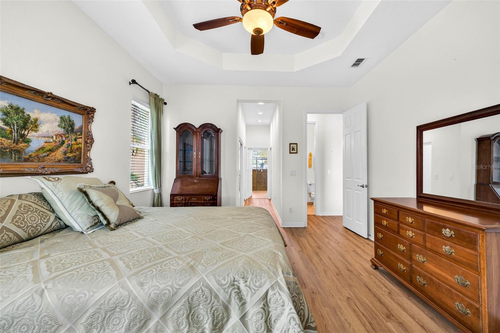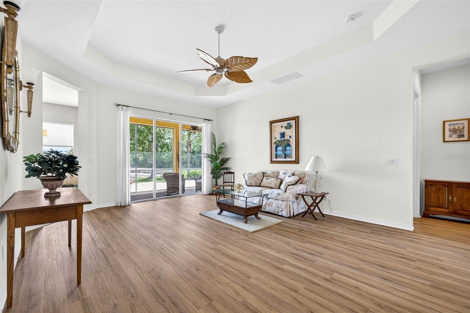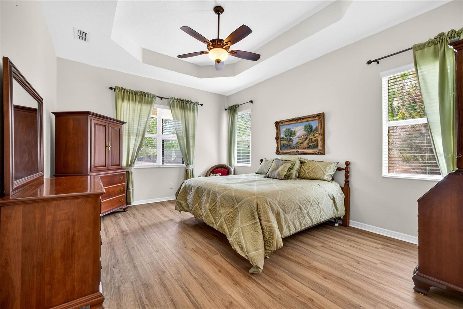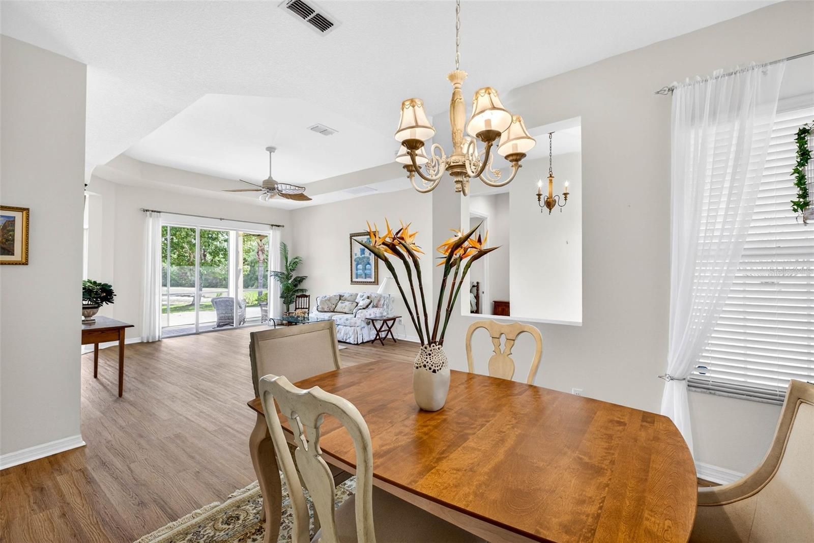 Bright, open, and inviting with 10 foot ceilings—this home captures the essence of relaxed Florida living. BRAND new upgraded Luxury Vynil Flooring in formal areas and bedrooms. Priced to sell! This home features double-pane windows and easy-close hurricane shutters for comfort and peace of mind. The true split floor plan offers three bedrooms, ensuring privacy for both owners and guests. The expansive primary suite showcases a coffered ceiling, large windows overlooking the pond and conservation area, two walk-in closets, and a generous en-suite bath with dual vanities and a large walk-in shower. The upgraded kitchen features custom-designed cabinetry, stone countertops, designer tile backsplash, and above- and below-cabinet lighting, including illuminated glass display cabinets. The popular Rialto floor plan offers an abundance of windows, perfectly positioned to capture tranquil views of the natural setting behind the home. The spacious 18' x 20' family room is filled with natural light and flows seamlessly into a large breakfast nook with oversized windows and a sliding glass door leading to the covered, screened lanai. An additional open patio provides the perfect spot to enjoy peaceful pond and wooded conservation views. Located in Valencia Lakes, HOA fees include yard maintenance, mowing, irrigation, cable TV, high-speed internet, and a monitored security system, allowing for truly carefree living. Just a short distance from the renovated 40,000-square-foot clubhouse and lifestyle center, residents enjoy three pools including a resort-style pool, resistance pool, and lap pool, an outdoor hot tub, sauna and steam rooms, ballroom, state-of-the-art fitness center, tennis courts, pickleball, bocce, softball, shuffleboard, basketball, recreation paths, RV and boat storage on premises, and a full calendar of clubs, crafts, and social activities. The community also features the Veterans Memorial Park, known as the Circle of Honor. Conveniently located minutes from shopping, dining, hospitals, and everyday conveniences, this home offers the best of resort-style, maintenance-free living—all that’s left to do is move in and enjoy.