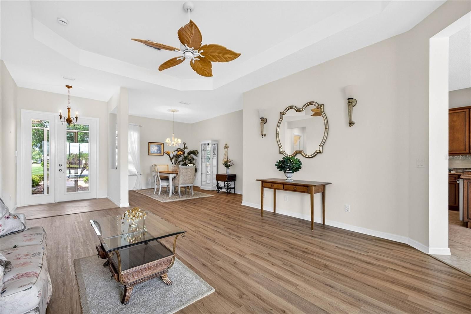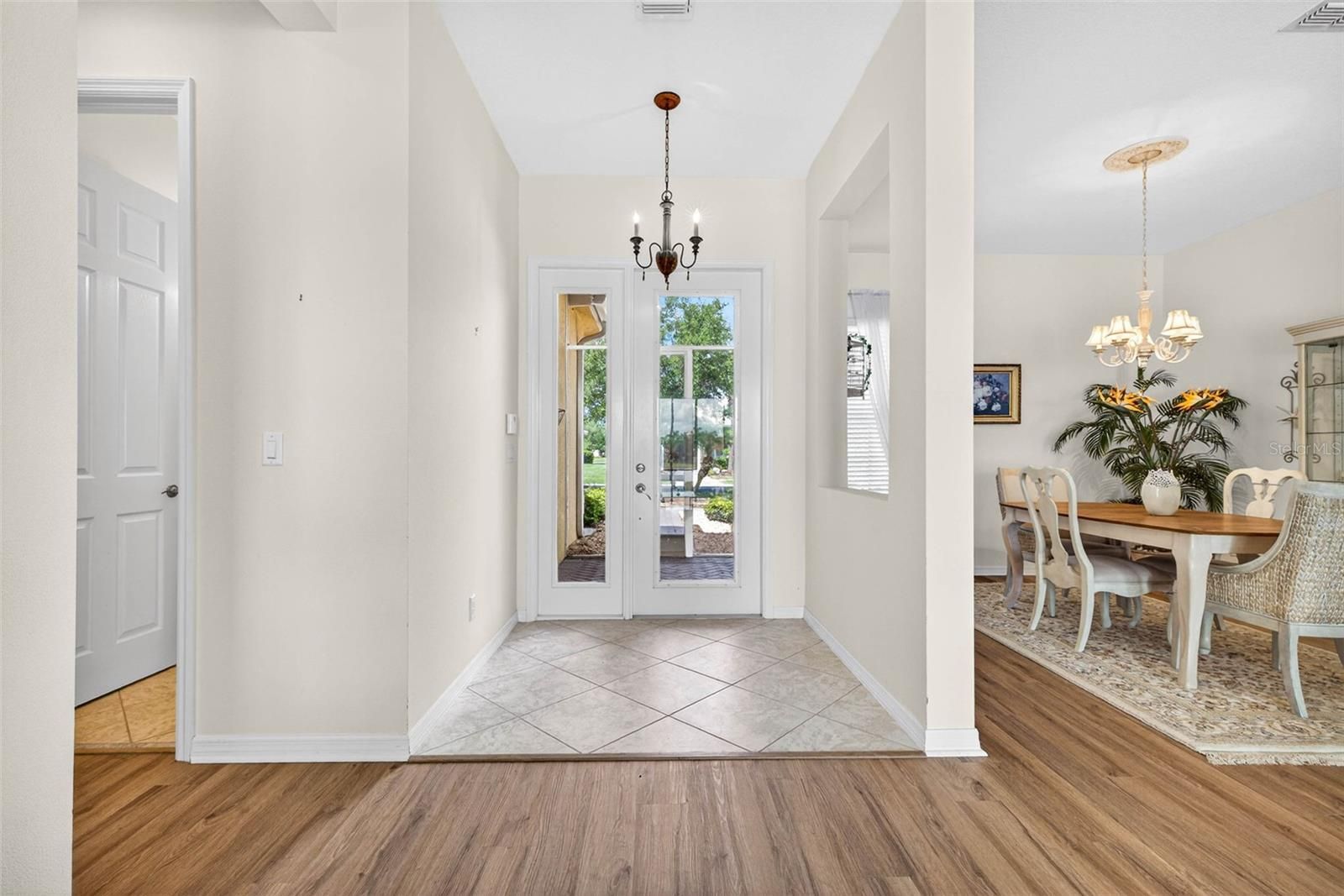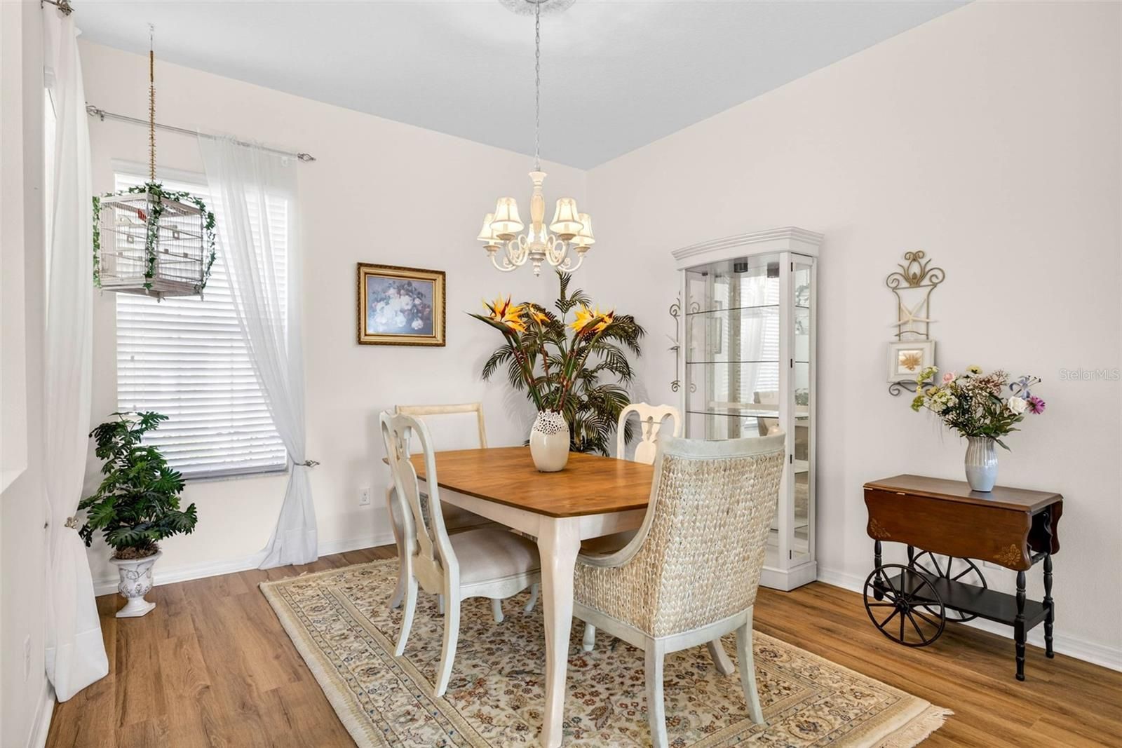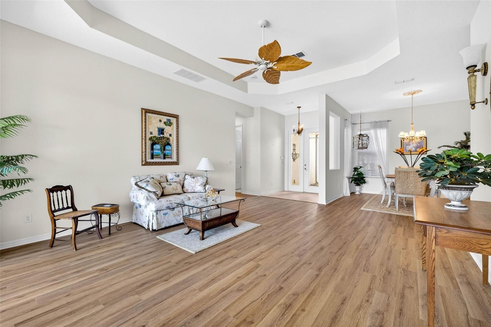 Bright, open, and inviting with 10 foot ceilings—this home captures the essence of relaxed Florida living. BRAND new upgraded Luxury Vynil Flooring in formal areas and bedrooms. Priced to sell! This home features double-pane windows and easy-close hurricane shutters for comfort and peace of mind. The true split floor plan offers three bedrooms, ensuring privacy for both owners and guests. The expansive primary suite showcases a coffered ceiling, large windows overlooking the pond and conservation area, two walk-in closets, and a generous en-suite bath with dual vanities and a large walk-in shower. The upgraded kitchen features custom-designed cabinetry, stone countertops, designer tile backsplash, and above- and below-cabinet lighting, including illuminated glass display cabinets. The popular Rialto floor plan offers an abundance of windows, perfectly positioned to capture tranquil views of the natural setting behind the home. The spacious 18' x 20' family room is filled with natural light and flows seamlessly into a large breakfast nook with oversized windows and a sliding glass door leading to the covered, screened lanai. An additional open patio provides the perfect spot to enjoy peaceful pond and wooded conservation views. Located in Valencia Lakes, HOA fees include yard maintenance, mowing, irrigation, cable TV, high-speed internet, and a monitored security system, allowing for truly carefree living. Just a short distance from the renovated 40,000-square-foot clubhouse and lifestyle center, residents enjoy three pools including a resort-style pool, resistance pool, and lap pool, an outdoor hot tub, sauna and steam rooms, ballroom, state-of-the-art fitness center, tennis courts, pickleball, bocce, softball, shuffleboard, basketball, recreation paths, RV and boat storage on premises, and a full calendar of clubs, crafts, and social activities. The community also features the Veterans Memorial Park, known as the Circle of Honor. Conveniently located minutes from shopping, dining, hospitals, and everyday conveniences, this home offers the best of resort-style, maintenance-free living—all that’s left to do is move in and enjoy.