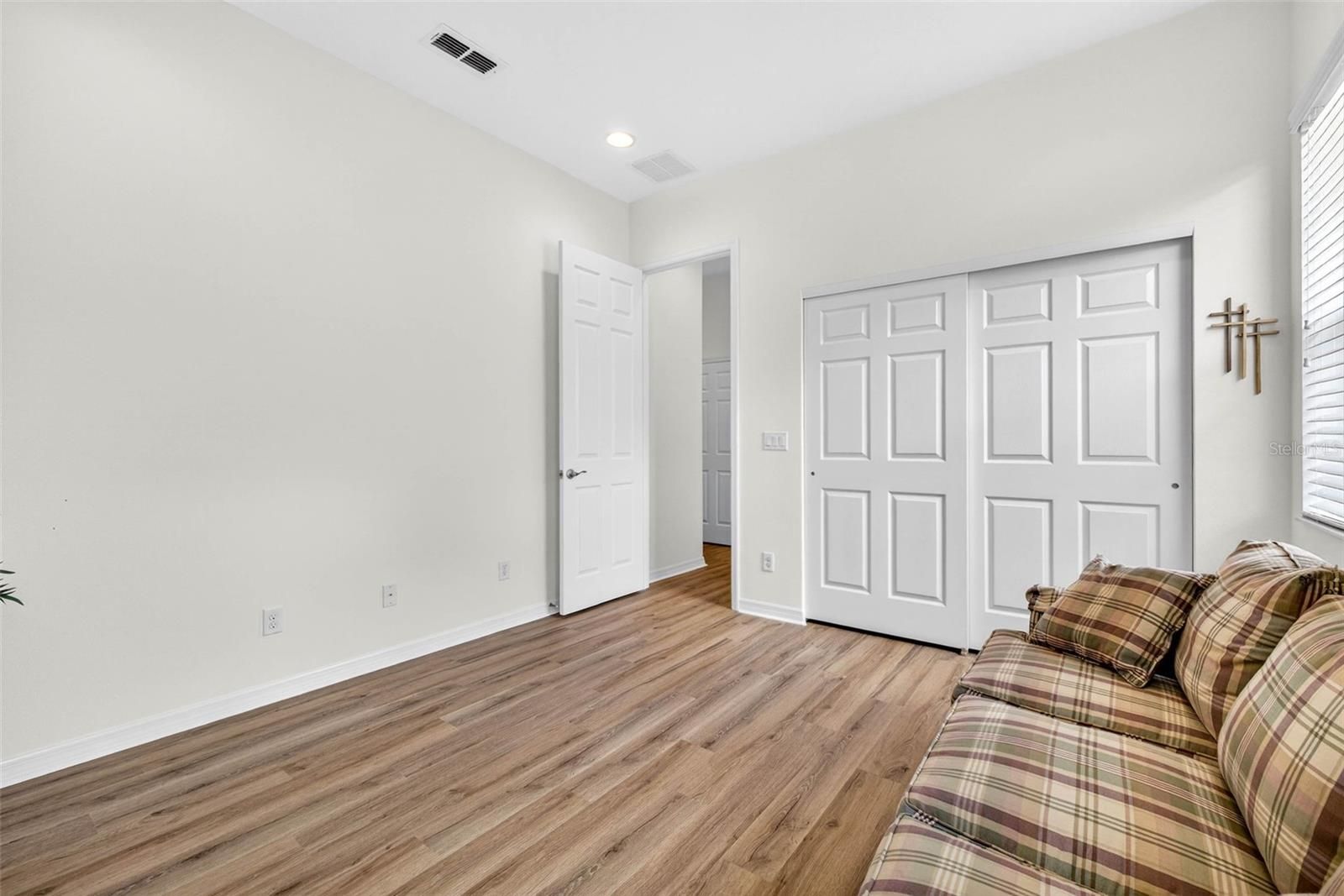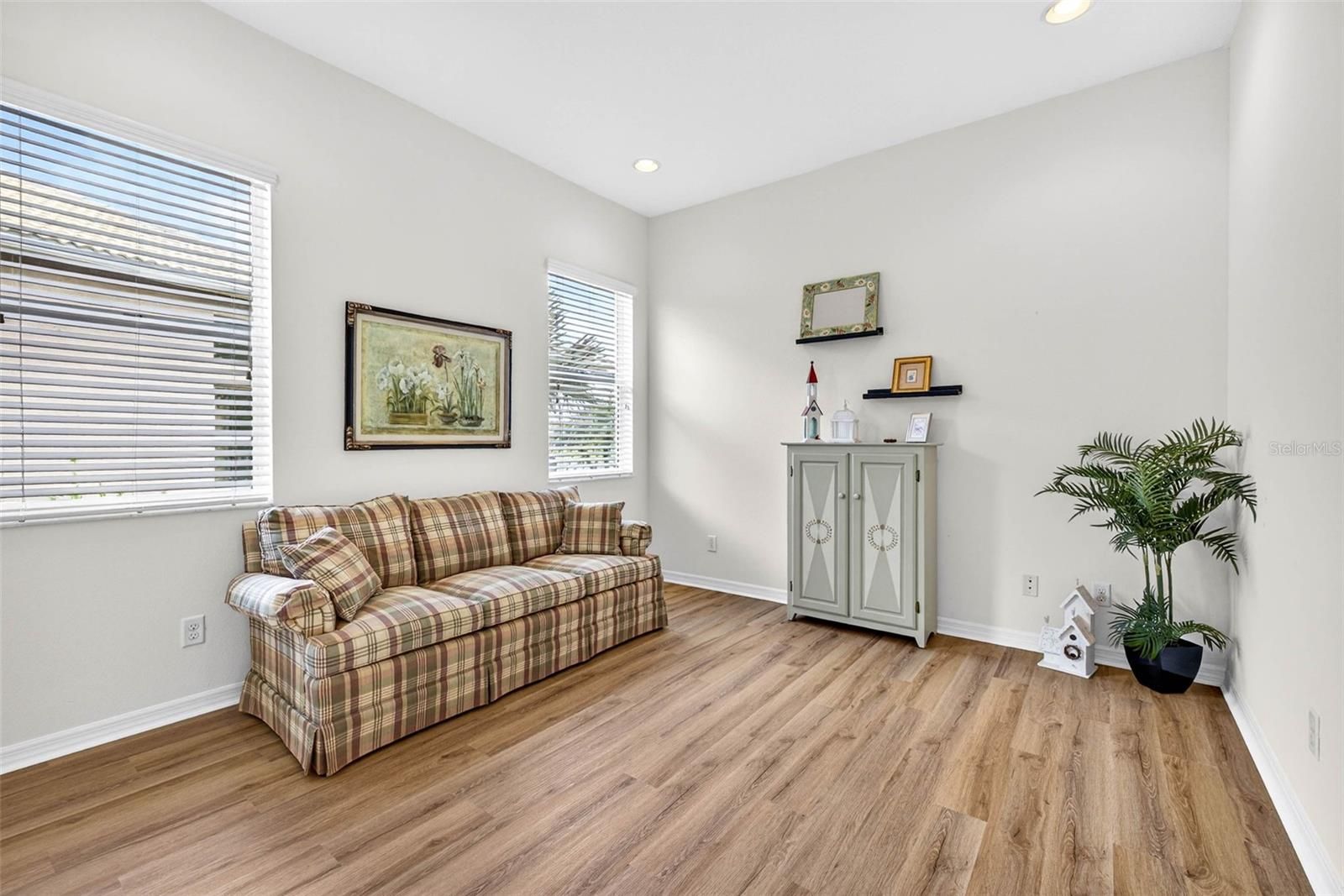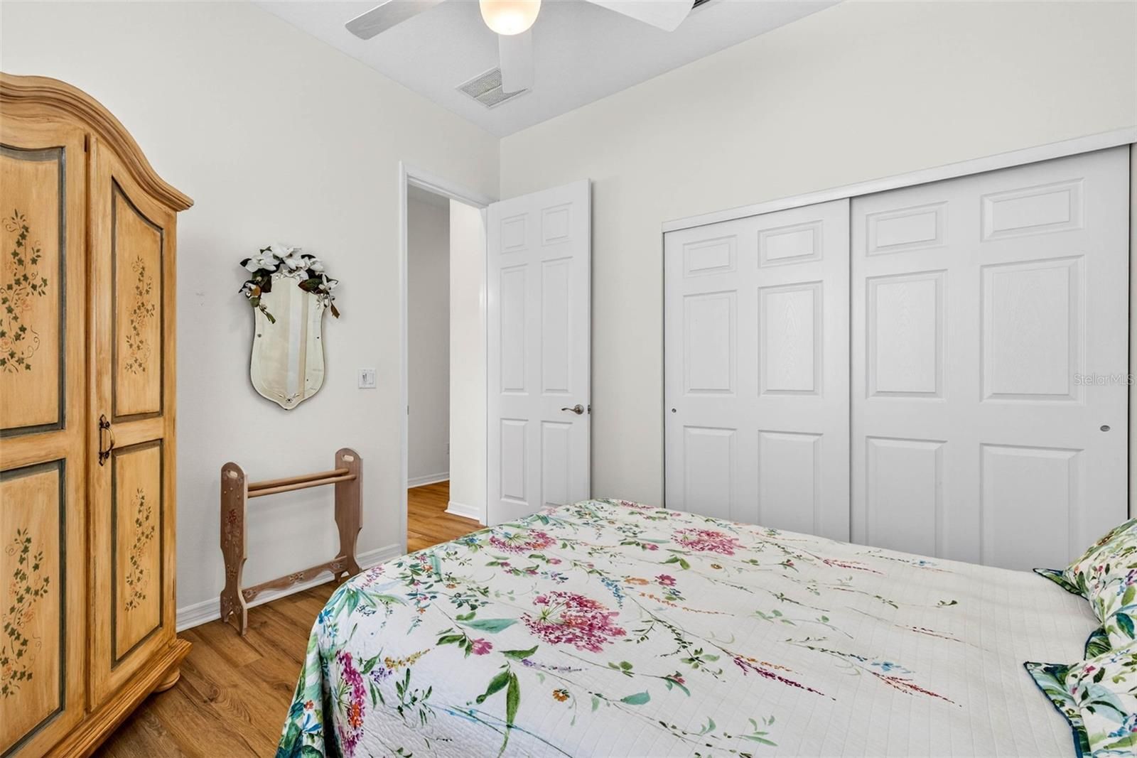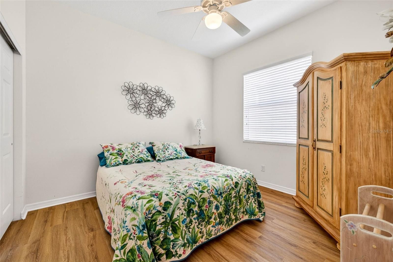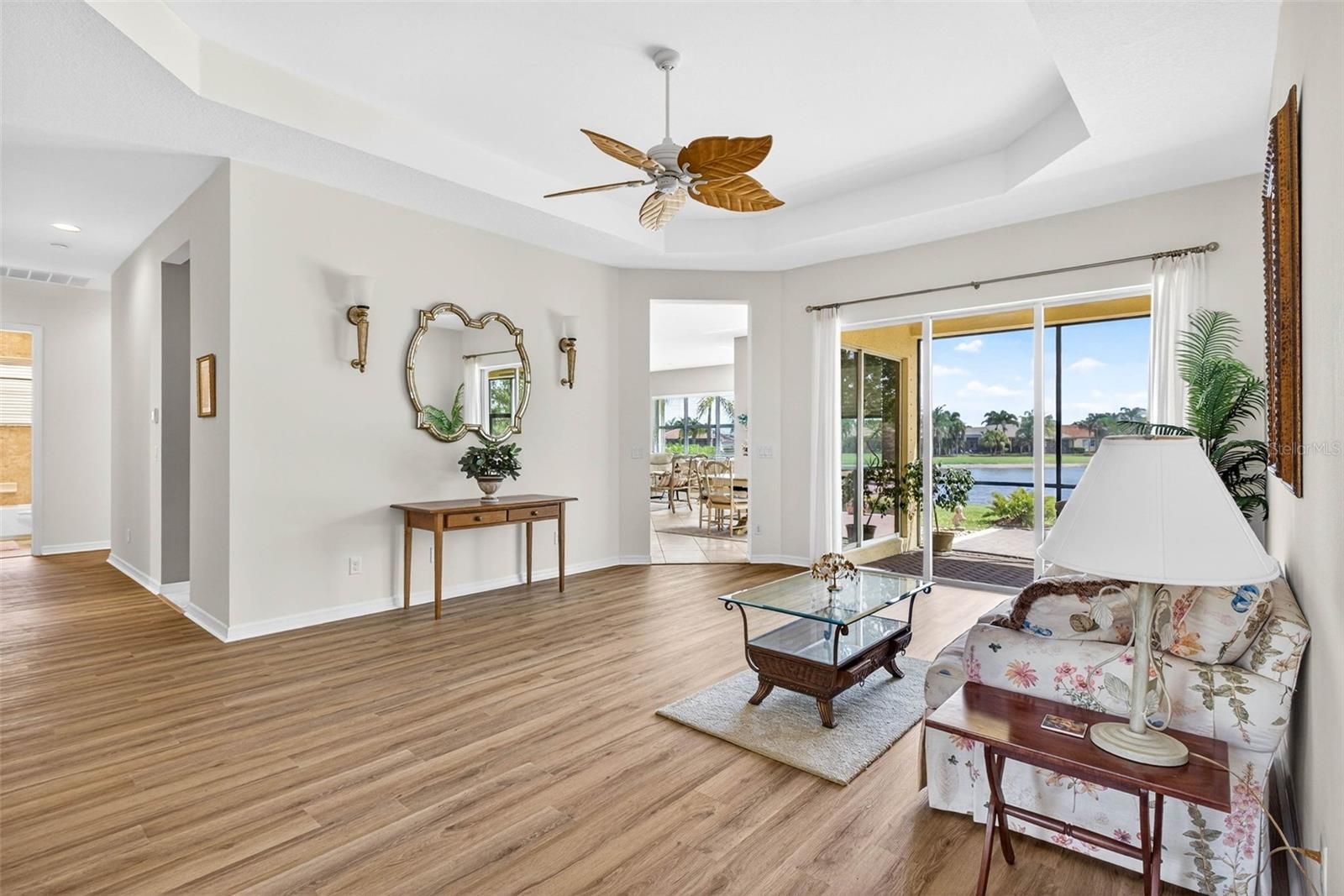 Bright, open, and inviting with 10 foot ceilings—this home captures the essence of relaxed Florida living. BRAND new upgraded Luxury Vynil Flooring in formal areas and bedrooms. Priced to sell! This home features double-pane windows and easy-close hurricane shutters for comfort and peace of mind. The true split floor plan offers three bedrooms, ensuring privacy for both owners and guests. The expansive primary suite showcases a coffered ceiling, large windows overlooking the pond and conservation area, two walk-in closets, and a generous en-suite bath with dual vanities and a large walk-in shower. The upgraded kitchen features custom-designed cabinetry, stone countertops, designer tile backsplash, and above- and below-cabinet lighting, including illuminated glass display cabinets. The popular Rialto floor plan offers an abundance of windows, perfectly positioned to capture tranquil views of the natural setting behind the home. The spacious 18' x 20' family room is filled with natural light and flows seamlessly into a large breakfast nook with oversized windows and a sliding glass door leading to the covered, screened lanai. An additional open patio provides the perfect spot to enjoy peaceful pond and wooded conservation views. Located in Valencia Lakes, HOA fees include yard maintenance, mowing, irrigation, cable TV, high-speed internet, and a monitored security system, allowing for truly carefree living. Just a short distance from the renovated 40,000-square-foot clubhouse and lifestyle center, residents enjoy three pools including a resort-style pool, resistance pool, and lap pool, an outdoor hot tub, sauna and steam rooms, ballroom, state-of-the-art fitness center, tennis courts, pickleball, bocce, softball, shuffleboard, basketball, recreation paths, RV and boat storage on premises, and a full calendar of clubs, crafts, and social activities. The community also features the Veterans Memorial Park, known as the Circle of Honor. Conveniently located minutes from shopping, dining, hospitals, and everyday conveniences, this home offers the best of resort-style, maintenance-free living—all that’s left to do is move in and enjoy.