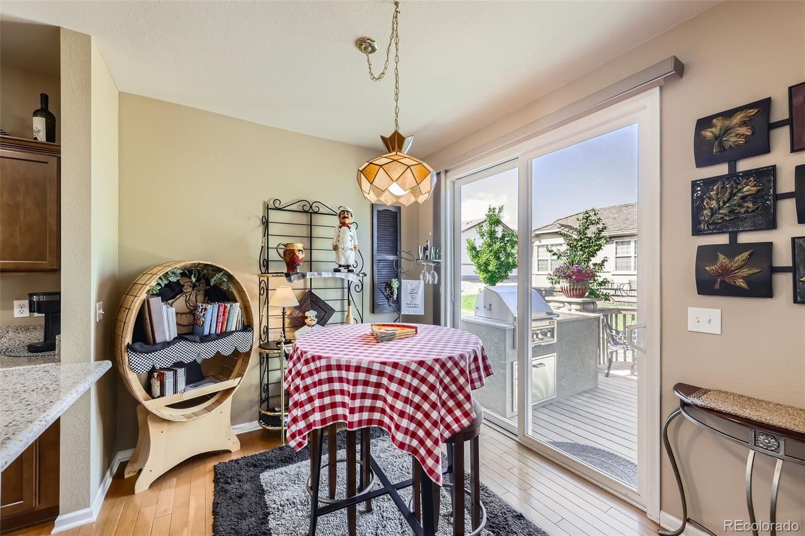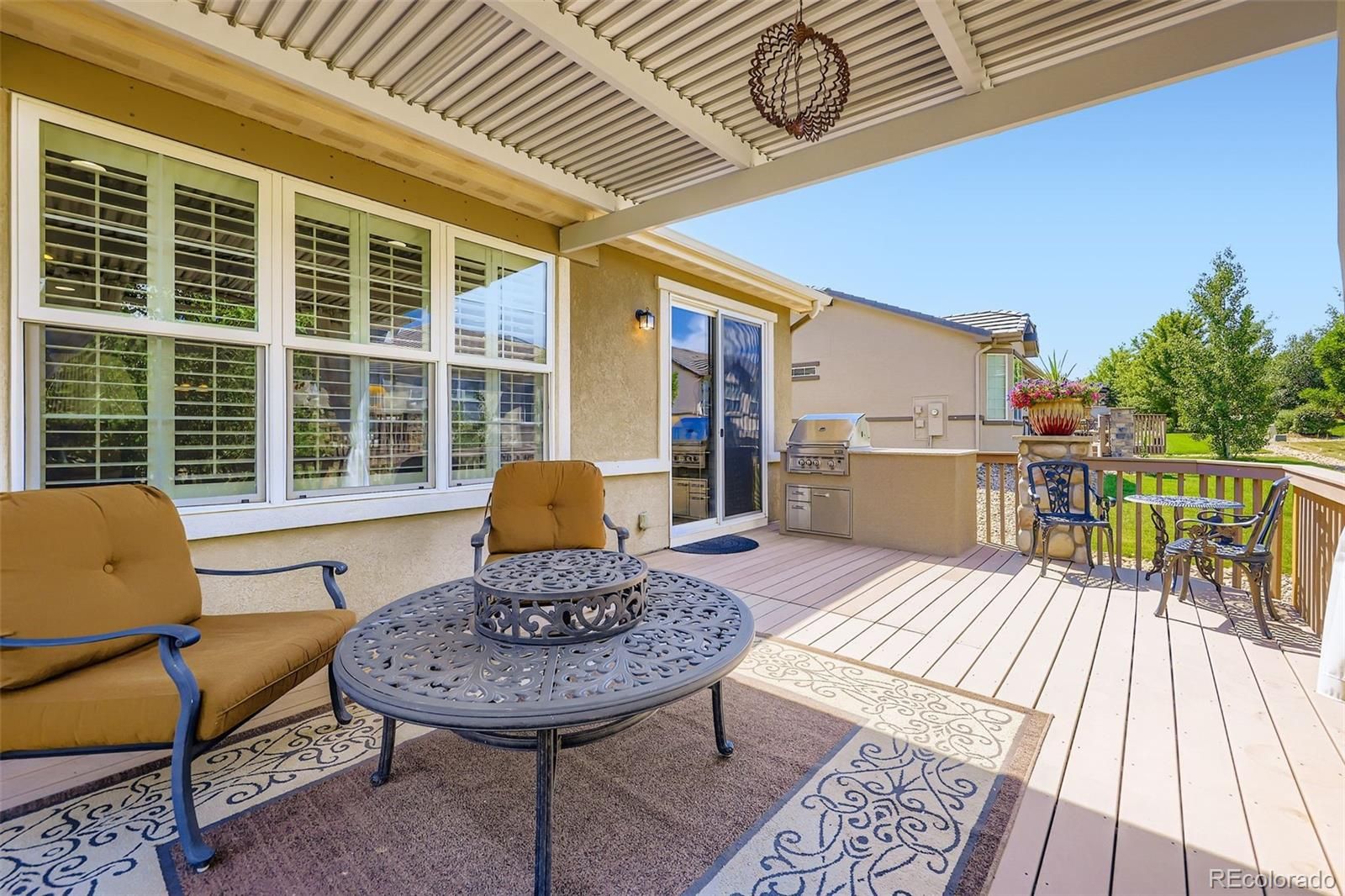 Colorado's resort lifestyle at Anthem Ranch, a 55+ community. This is the popular Copper home. This low-maintenance, generously sized 2-bedroom 2-full-bathroom home has all the comforts you expect. You'll love the Custom-built in-beverage center with a granite countertop and a custom stacked-stone fireplace that grace the open concept of the den and dining area. The bedrooms are generously sized. The Primary bedroom is an En-suite with a 5-piece double vanity counter with a luxury bathtub and shower, and a walk-in Closet off the bedroom. The kitchen includes newer stainless steel appliances, plenty of cabinet space, and beautiful granite throughout. You'll enjoy the central location of the kitchen and its eati in area. The open-concept dining and den area features the stunning stacked stone gas fireplace. Outside in the back is a large deck with a stainless steel built-in gas grill, with storage, and a work surface. The deck area includes a custom-built Pergola with luxury drapes and adjustable louvers, keeping you comfortable, no matter what time of day. The laundry room is complete with a washer and dryer. utility sink, plenty of cabinets, and generous work surfaces. This home has been well cared for and is ready for you to make this your forever home. The Aspen Lodge has all the amenities for the 55+ lifestyle. Exclusive to residents, the 32,000 sq ft facility serves as the heart of the community, with so much to offer: concerts, car shows, card clubs, dancing, fitness classes, holiday parties, and pickleball and tennis courts. Indoor and outdoor swimming lap pools and an indoor jogging track. Conveniently located just 15 miles north of Denver, 15 miles east of Boulder, and 25 minute commute to Denver International Airport. Buyer to pay .5% of home purchase price to HOA as a new member fee.