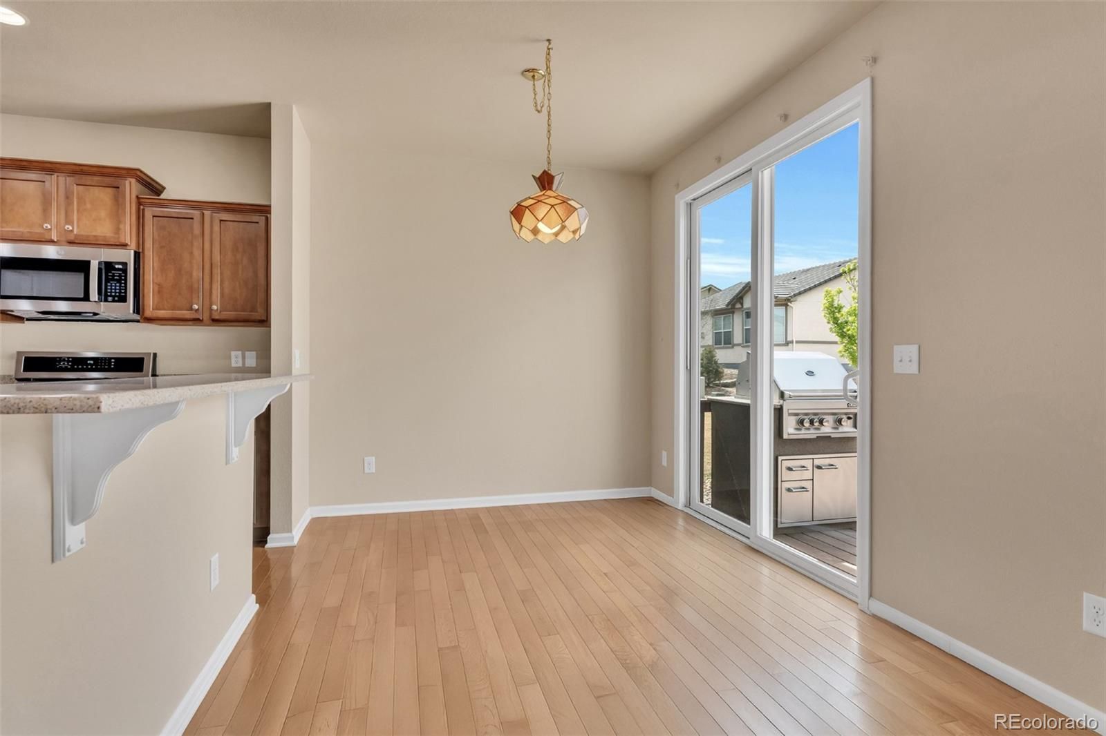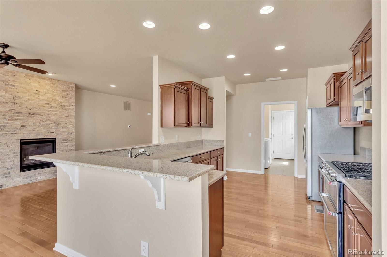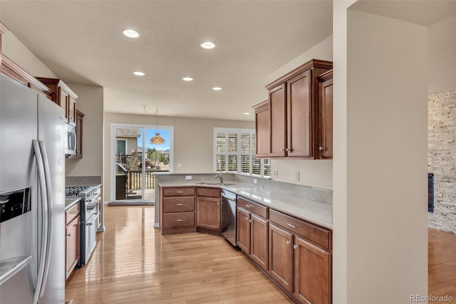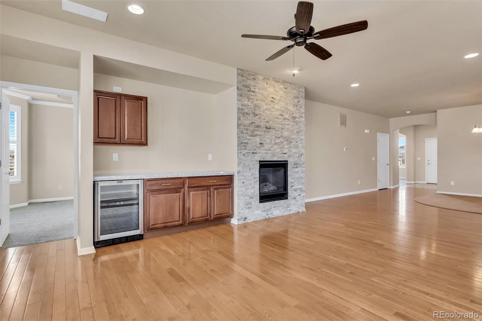 Freshly painted, move-in ready! Colorado's resort lifestyle at Anthem Ranch, a 55+ community. This is the popular Copper home. This low-maintenance, generously sized 2-bedroom 2-bathroom home has all the comforts you expect. You'll love the Custom-built in-beverage center with a granite countertop and a custom stacked-stone fireplace that grace the open concept of the den and dining area. The bedrooms are generously sized. The Primary bedroom is an En-suite with a double vanity counter, spacious shower, and a walk-in Closet. The kitchen includes newer stainless steel appliances, plenty of cabinet space, and beautiful granite throughout. You'll enjoy the central location of the kitchen and its eating area. The open-concept dining and den area features the stunning stacked stone gas fireplace. Outside in the back is a large deck with a stainless steel built-in gas grill, with storage, and a work surface. The deck area includes a custom-built Pergola with luxury drapes and adjustable louvers, keeping you comfortable, no matter what time of day. The laundry room is complete with a washer and dryer. utility sink, plenty of cabinets, and generous work surfaces. This home has been well cared for and is ready for you to make this your forever home. The Aspen Lodge has all the amenities for the 55+ lifestyle. Exclusive to residents, the 32,000 sq ft facility serves as the heart of the community, with so much to offer: concerts, car shows, card clubs, dancing, fitness classes, holiday parties, and pickleball and tennis courts. Indoor and outdoor swimming lap pools and an indoor jogging track. Conveniently located just 15 miles north of Denver, 15 miles east of Boulder, and a 25-minute commute to Denver International Airport. Buyer to pay .5% of the home purchase price to the HOA as a new member fee.