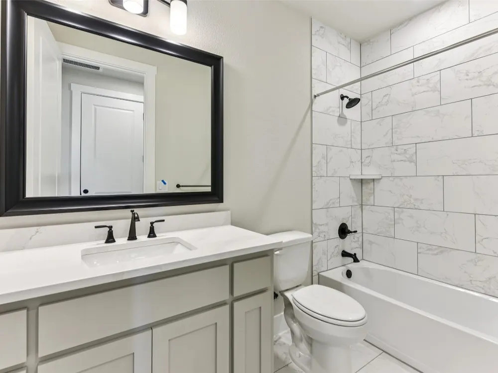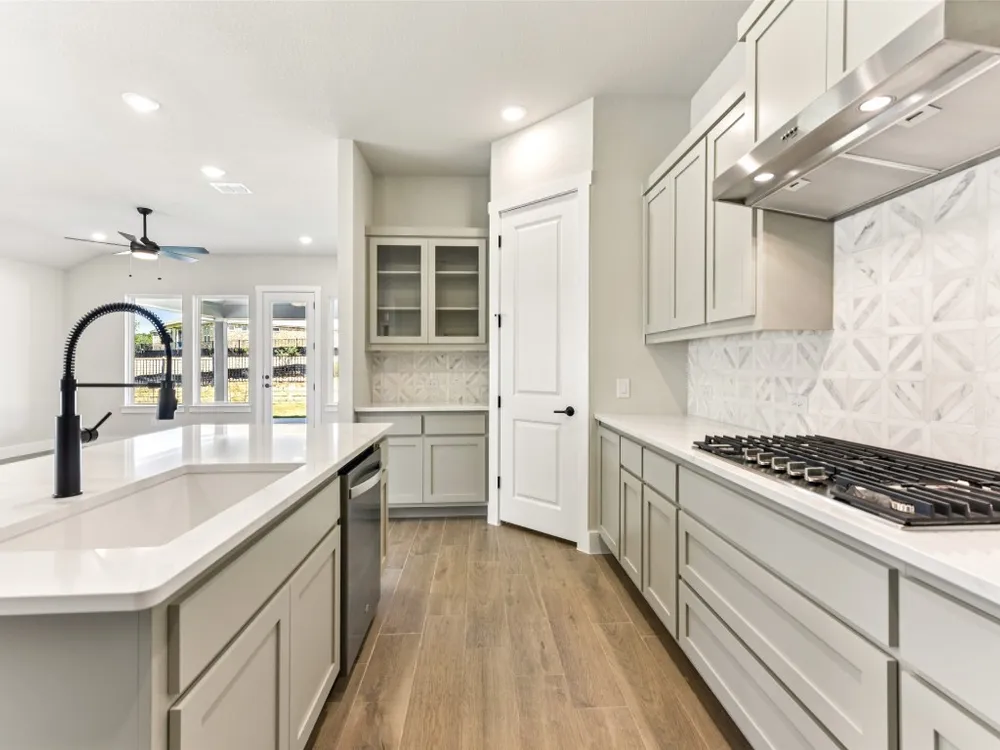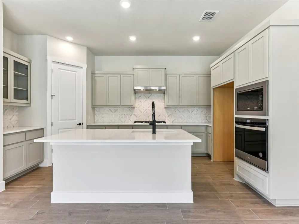 Emory plan with upgraded kitchen, quartz countertops, tile flooring throughout, optional 3rd bedroom, options cabinets in utility room with sink, enlarged covered patio