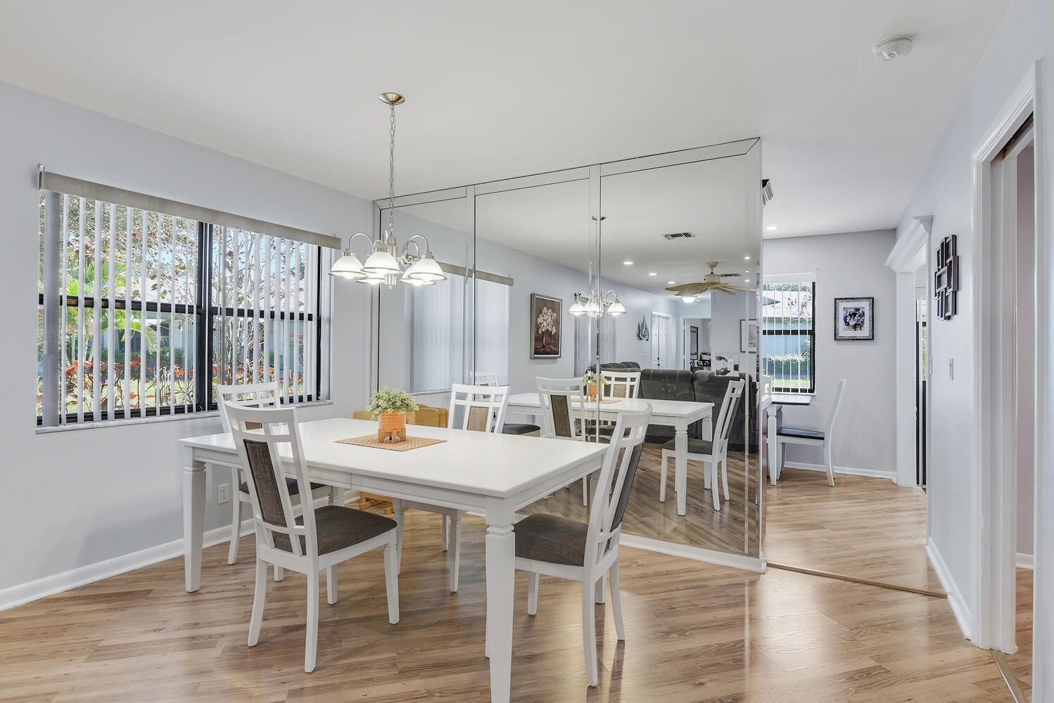 Beautifully updated corner villa with double door entry. Remodeled kitchen and bathrooms; neutral wood-like flooring through out; built in closet system in primary bedroom. Accordion shutters for hurricane protection, gutters and leaders all around. Roof 2024, A/C unit 2018, Hot water heater 2021. Lovely Florida room and patio with open space yard for green-scape and spacious atmosphere. The community is low density and an active 55+ with a clubhouse and pools. The maintenance fee includes water, cable, lawn care, roof maintenance, building insurance. and reserves.
