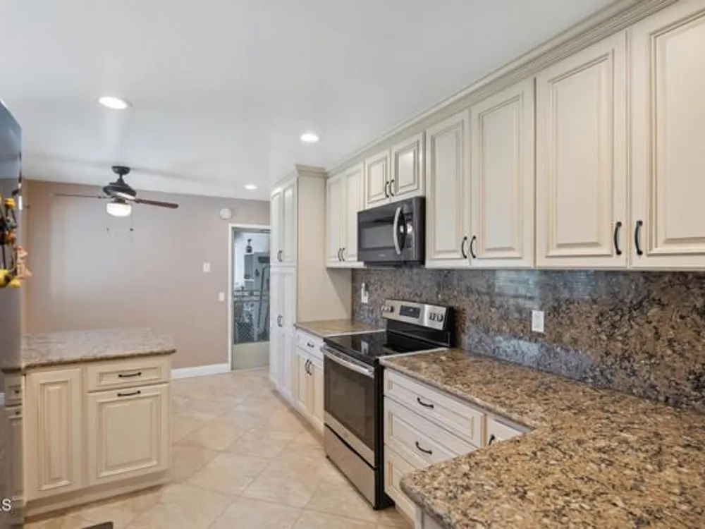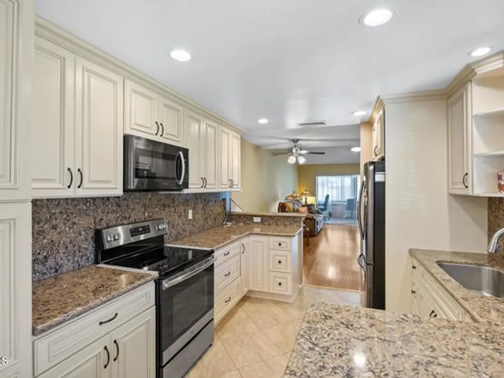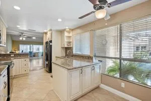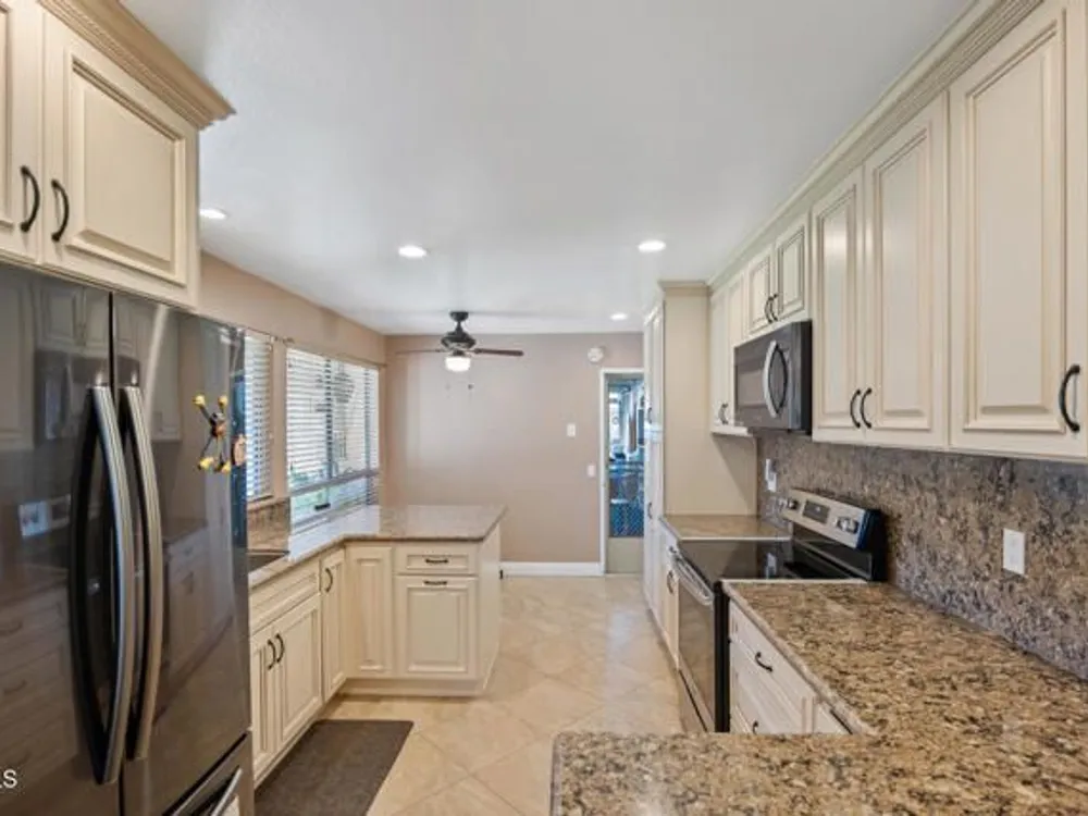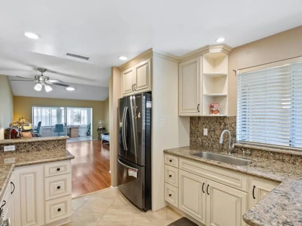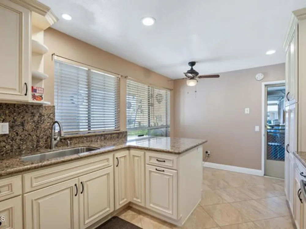 Beautifully Updated Coronado Model in Leisure Village 55+ Community!This inviting 2-bedroom, 2-bathroom home with an attached 1-car garage has been tastefully remodeled and is move-in ready. The spacious living room features vaulted ceilings, a solar tube for natural light, and part of the patio has been enclosed--perfect for a den, office, or hobby space. The gorgeous remodeled kitchen has been opened up to create an open-concept feel, showcasing granite countertops and backsplash, white cabinets, stainless steel appliances, recessed lighting, and a breakfast bar. Enjoy the updated primary bathroom with a walk-in shower, mirrored closet doors in both bedrooms, and wood-like flooring throughout. Ceiling fans in most rooms keep the home comfortable year-round. Step outside to the open patio with a block wall that offers a peaceful greenbelt view--ideal for relaxing or entertaining.Leisure Village is a secure, guard-gated 55+ community with endless amenities including a golf course, fitness center, swimming pool, spa, tennis and pickleball courts, woodshop, and clubs for every interest--from art to travel to volunteering. The HOA fee covers water, sewer, trash, cable TV, internet, landscaping, and 24-hour security patrol. Enjoy resort-style living in a friendly and active community where every day feels like a vacation!
