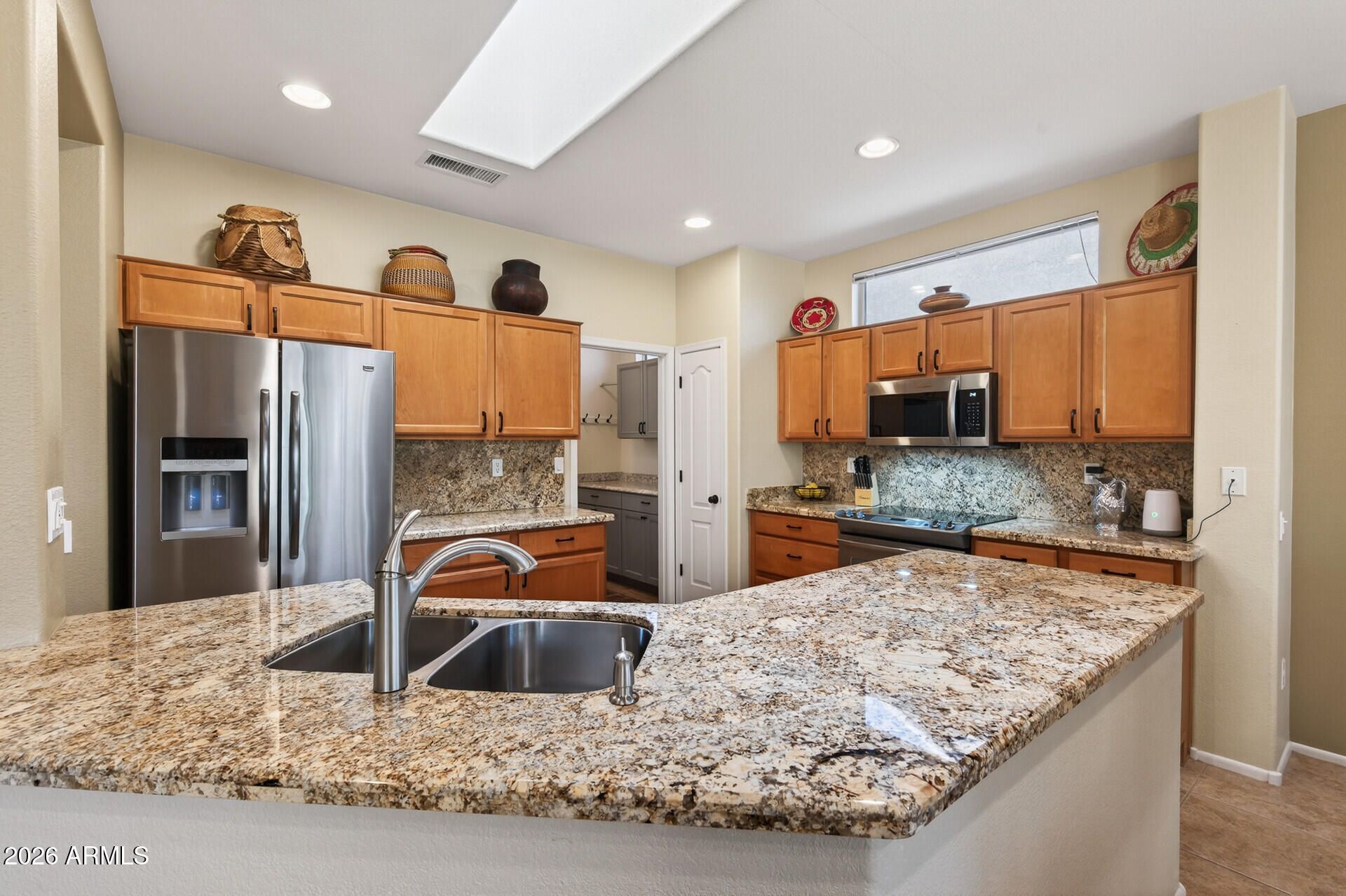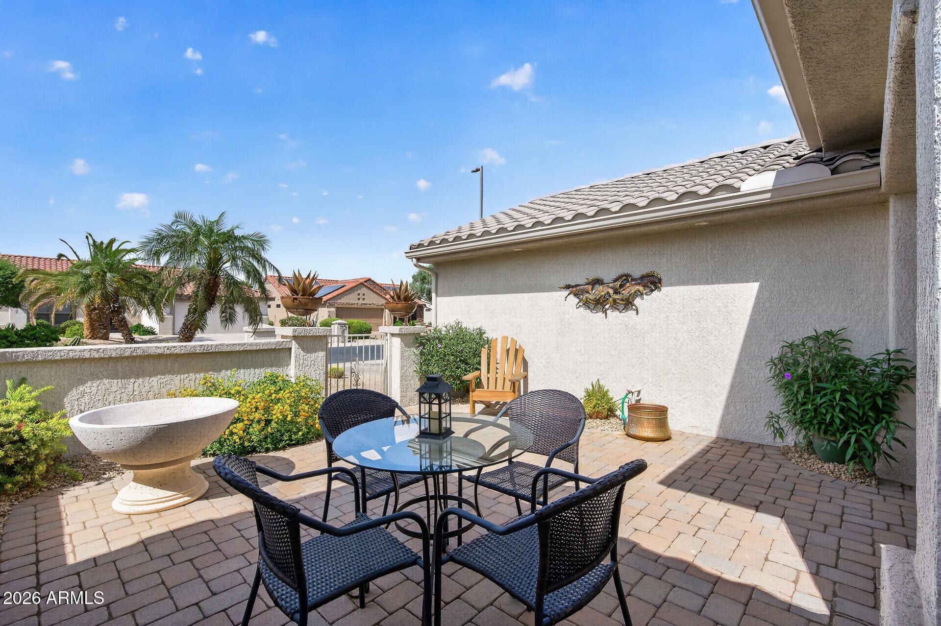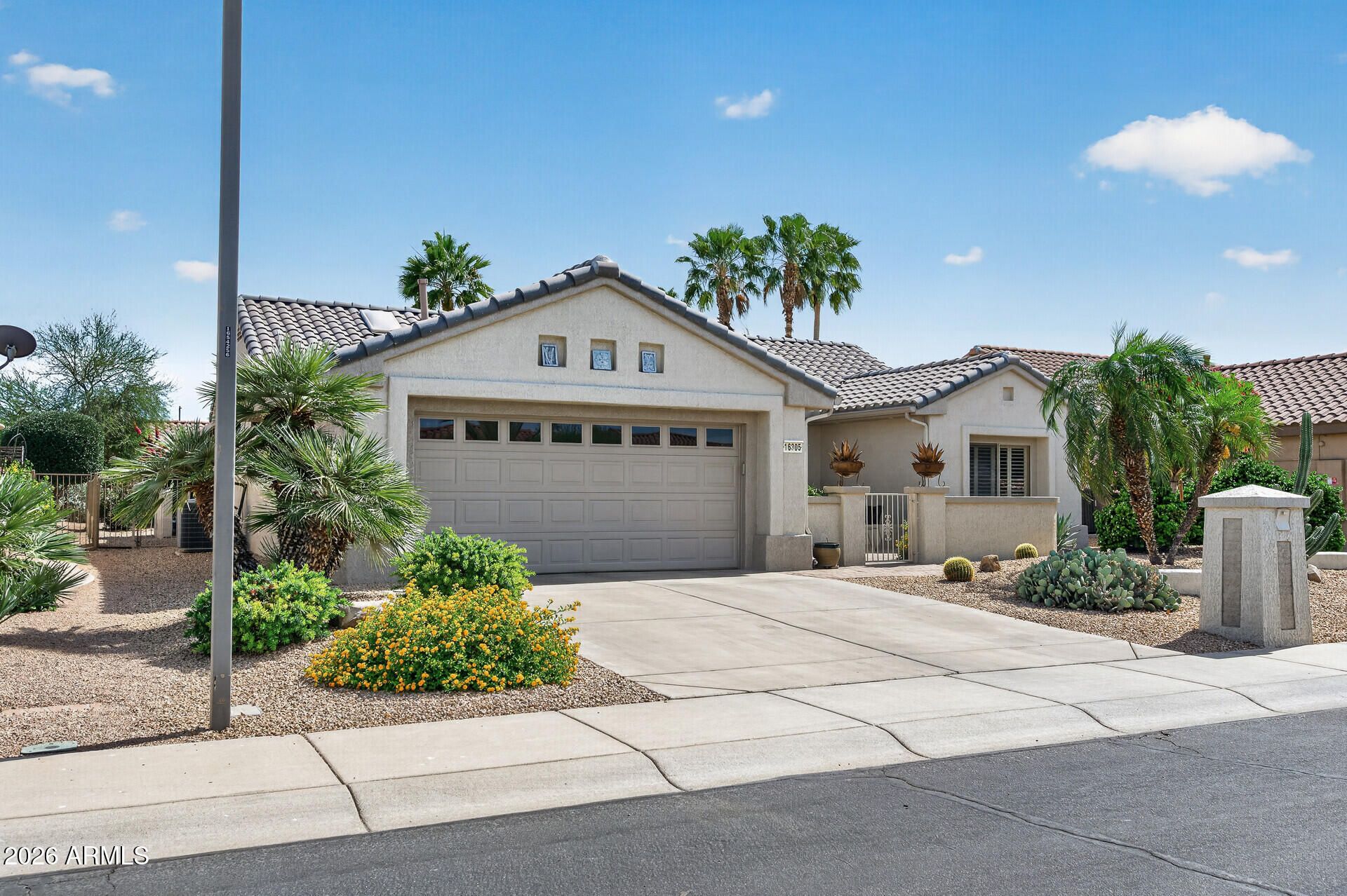 Welcome home to this beautifully upgraded residence featuring a charming PAVER FRONT COURTYARD w/gated entry & elegant LEADED GLASS door. Inside, enjoy 18'' tile flooring & some plantation shutters. NEW ROOF (2022) & fresh exterior paint (2025). The kitchen shines w/single-level granite counters, maple cabinetry, skylight & stainless steel appliances including newer refrigerator & microwave. The owner's suite offers spa-like feel w/raised vanity, granite counter & UPDATED TILED SHOWER w/TRAVERTINE FLOORING. Refreshed Great Room features ELECTRIC FIREPLACE & floating shelves. Updated hall bath has tiled shower + raised vanity w/granite. Laundry w/cabinets. Garage w/epoxy floors, cabinets, 2019 Water Heater + sink. OUTDOOR OASIS has S-facing paver patio w/pergola, fenced yard & privacy!!!