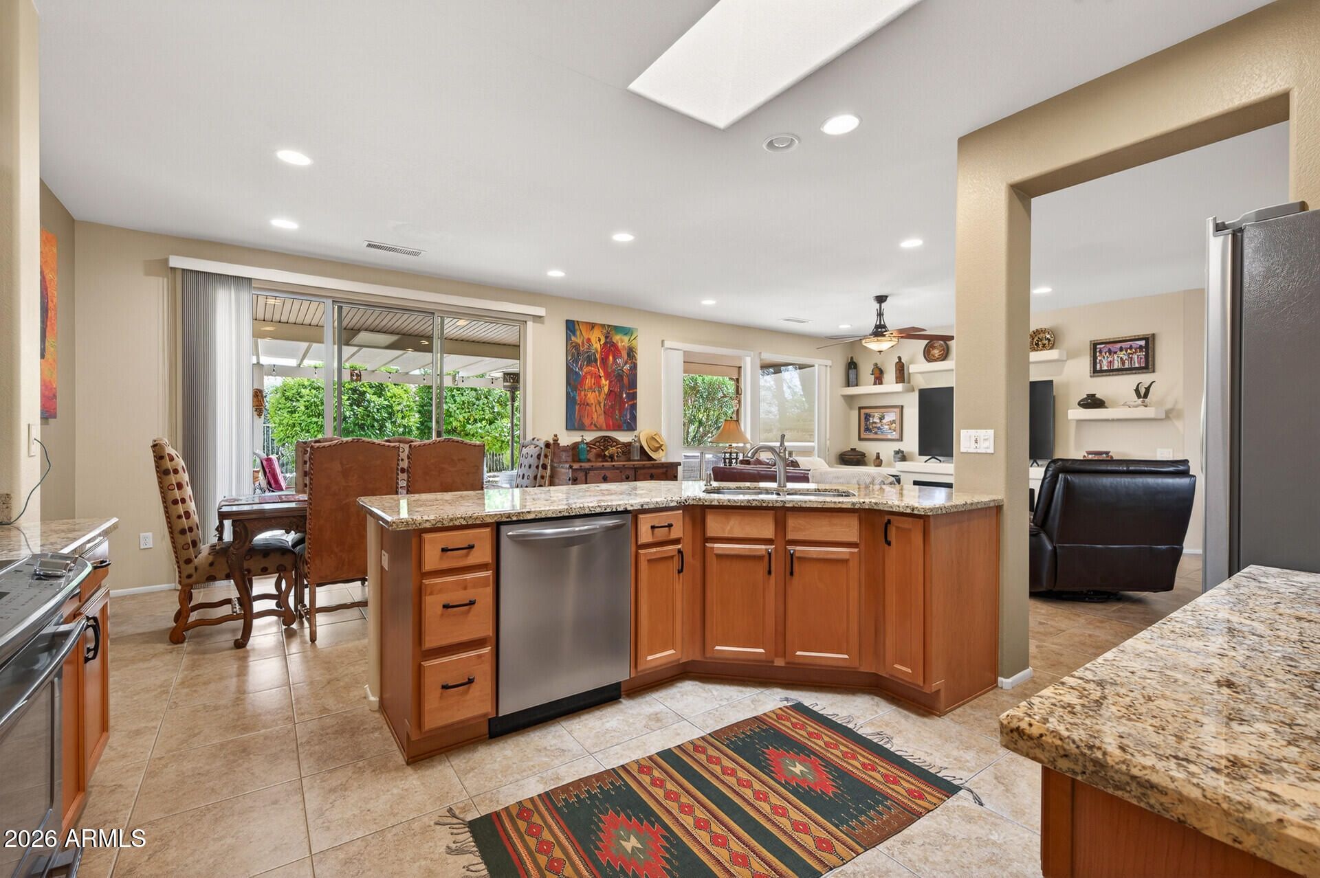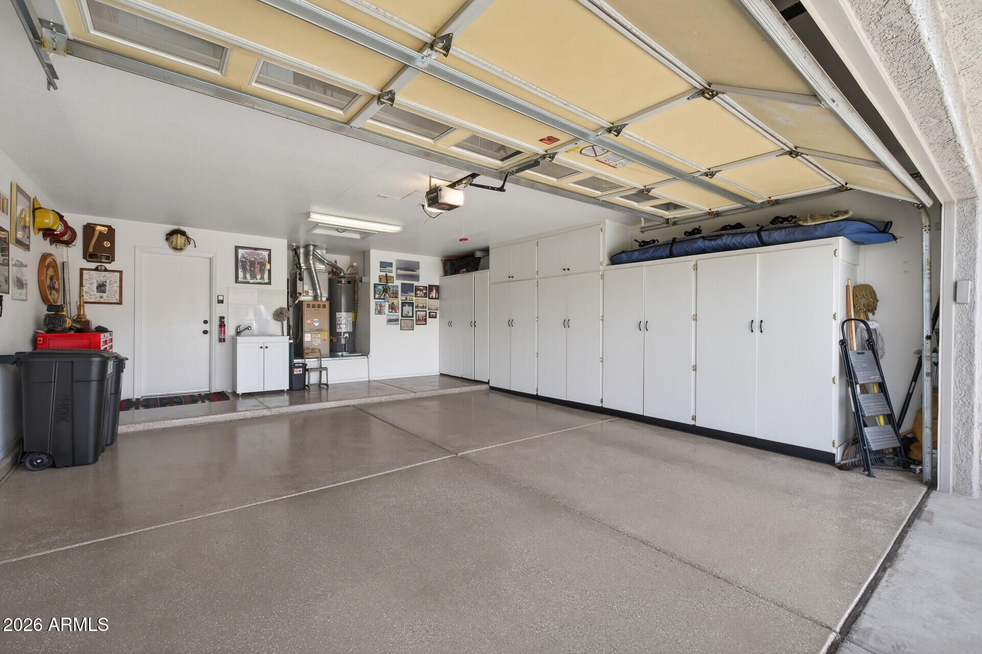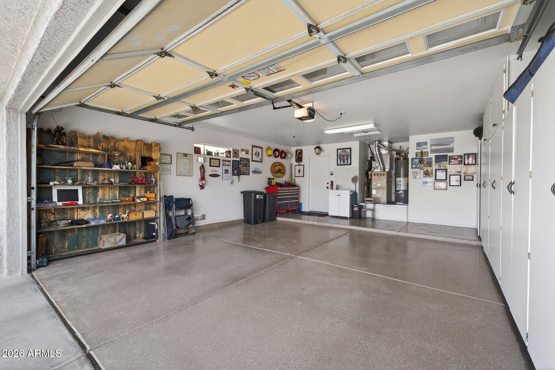 Welcome home to this beautifully upgraded residence featuring a charming PAVER FRONT COURTYARD w/gated entry & elegant LEADED GLASS door. Inside, enjoy 18'' tile flooring & some plantation shutters. NEW ROOF (2022) & fresh exterior paint (2025). The kitchen shines w/single-level granite counters, maple cabinetry, skylight & stainless steel appliances including newer refrigerator & microwave. The owner's suite offers spa-like feel w/raised vanity, granite counter & UPDATED TILED SHOWER w/TRAVERTINE FLOORING. Refreshed Great Room features ELECTRIC FIREPLACE & floating shelves. Updated hall bath has tiled shower + raised vanity w/granite. Laundry w/cabinets. Garage w/epoxy floors, cabinets, 2019 Water Heater + sink. OUTDOOR OASIS has S-facing paver patio w/pergola, fenced yard & privacy!!!