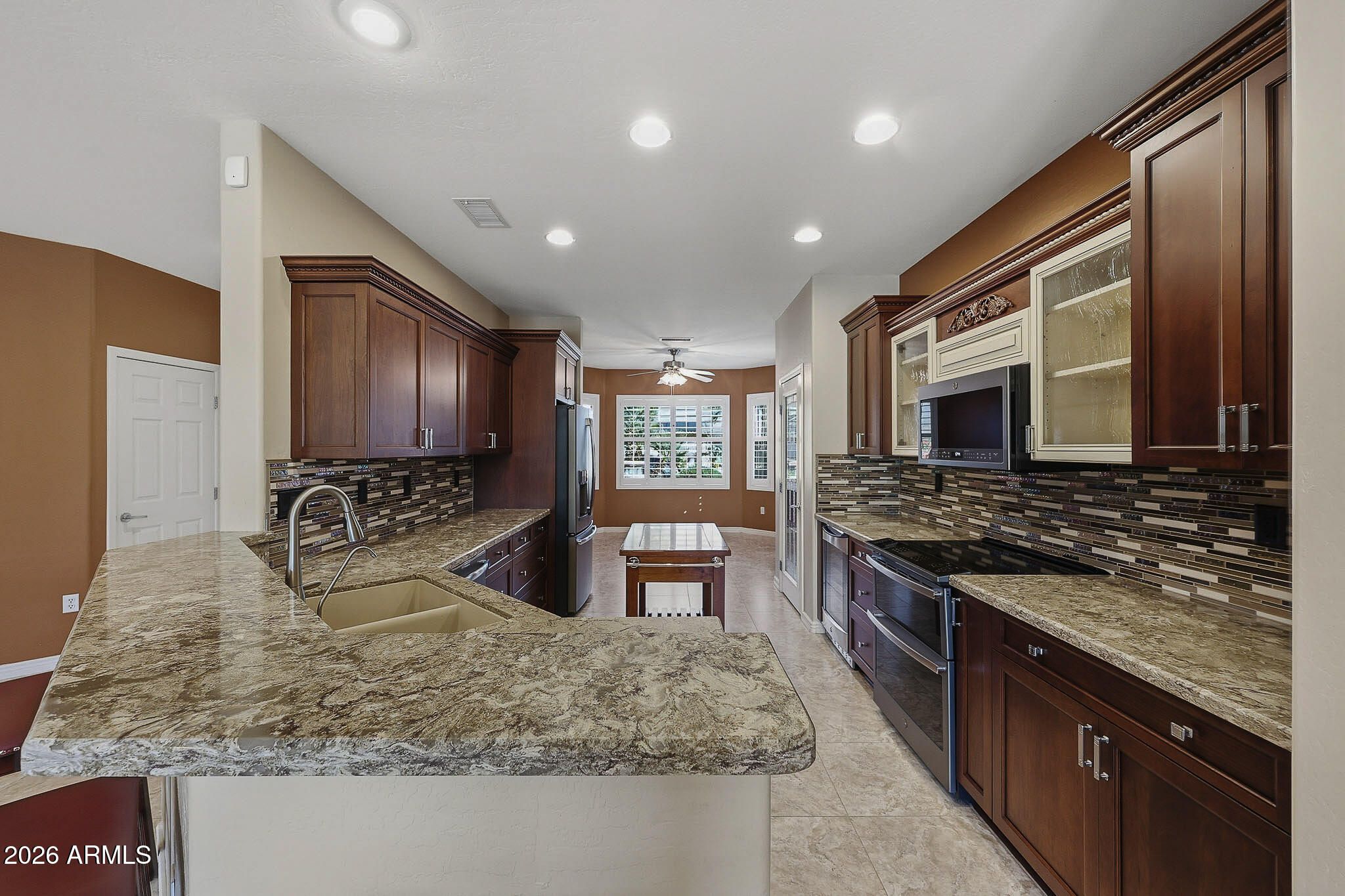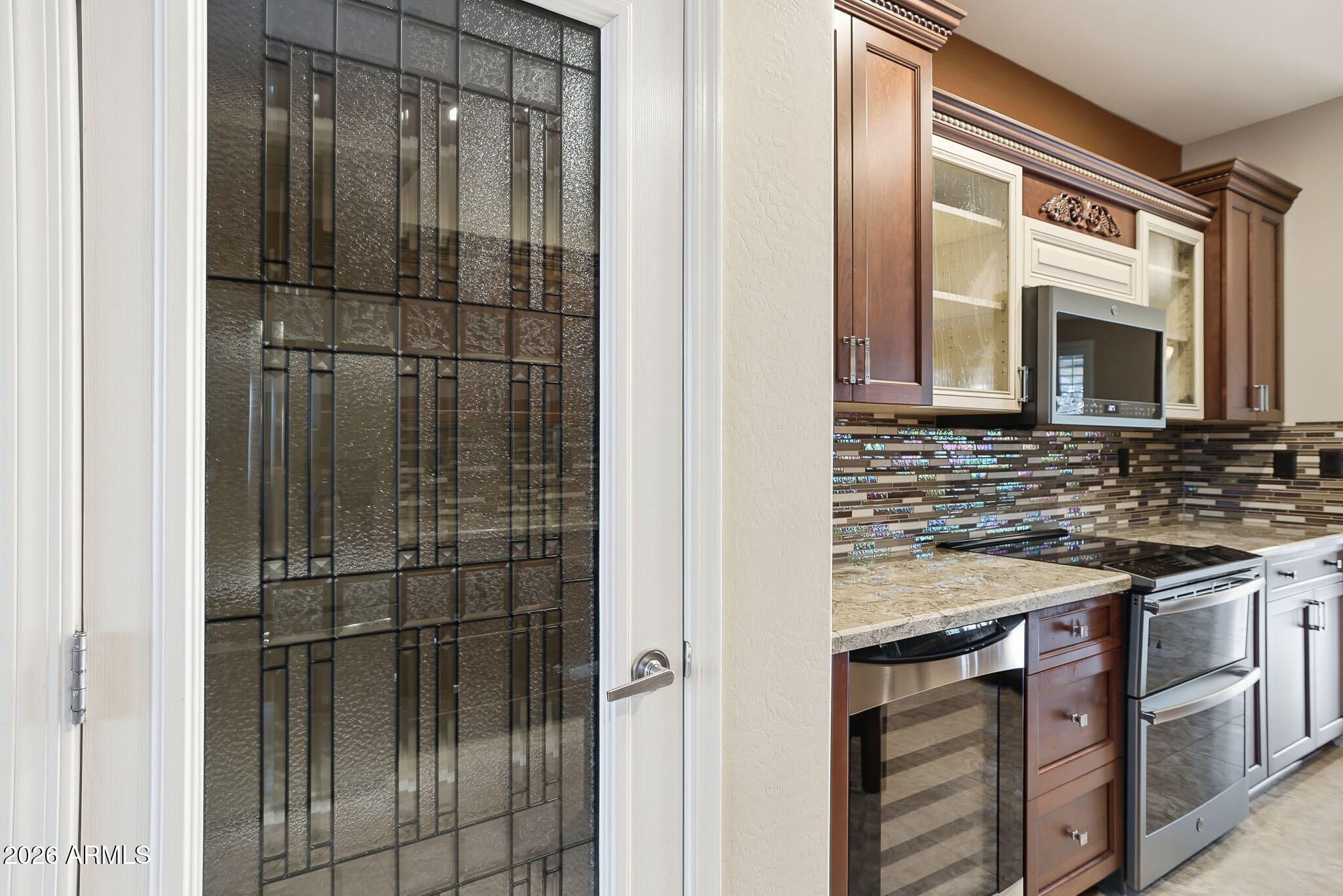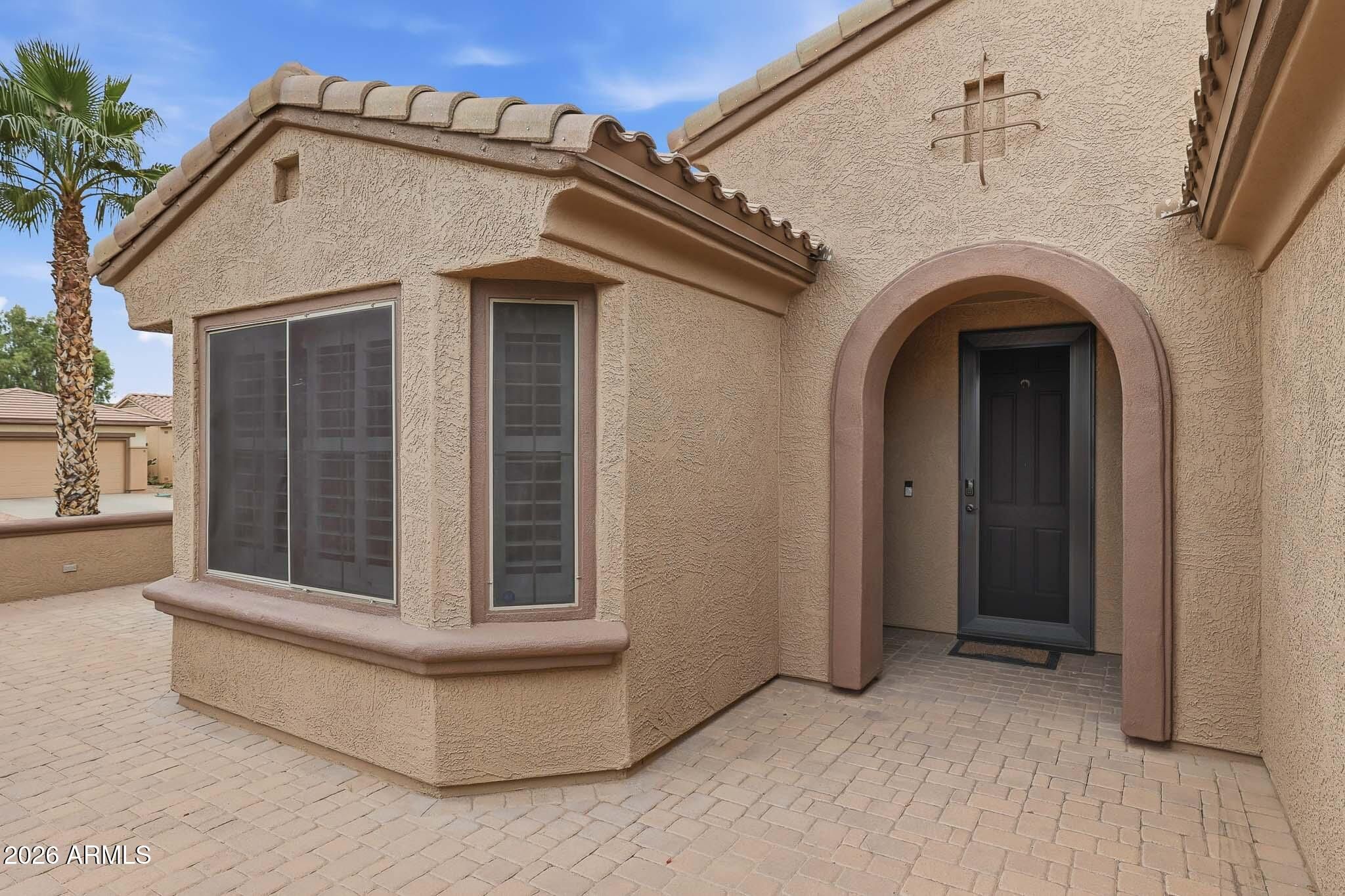 Truly exquisite! This highly desirable Borgata is beyond special. Brilliant curb appeal greets guests as they step up to door through the expansive front courtyard with artistically set pavers. Heavy-weight upgraded screen door leads to open floor plan and elegant kitchen which will satisfy even the most particular of tastes. Quartz counters, GE Profile stainless appliances, RO, leaded glass pantry door, wine fridge, and highly upgraded cabinetry all contribute to the kitchen's beauty. Bathrooms thoughtfully renovated in 2018 and 2019 featuring rainfall shower heads and walk in shower in primary bedroom. LG Washer and Dryer in laundry with upgraded cabinets. Plantation shutters, 20 inch tile and wood flooring with wide base molding. New roof underlayment in 2024. (More....) New HVAC in 2020, 3 car garage with epoxy floor, insulation, and mini split. Robust Pella Sliding door with in-window blinds and retractable screen opens to backyard paradise with pavers, built in BBQ, lush plantings, solar shades for windows and (motorized) sun shades for patio. Electronic door locks and many other upgrades. This home is an entertainers dream. Don't miss this showplace with something for everyone.