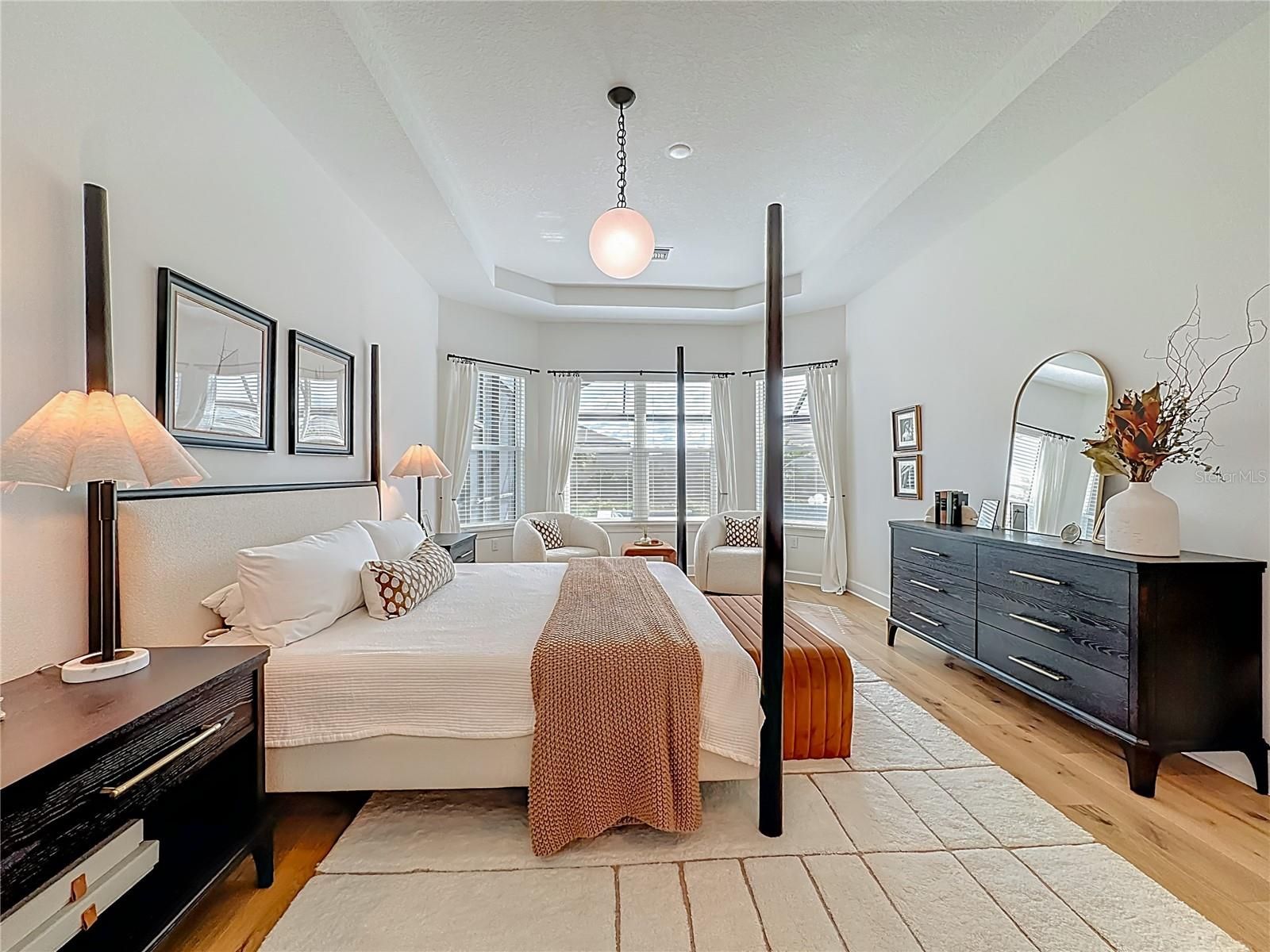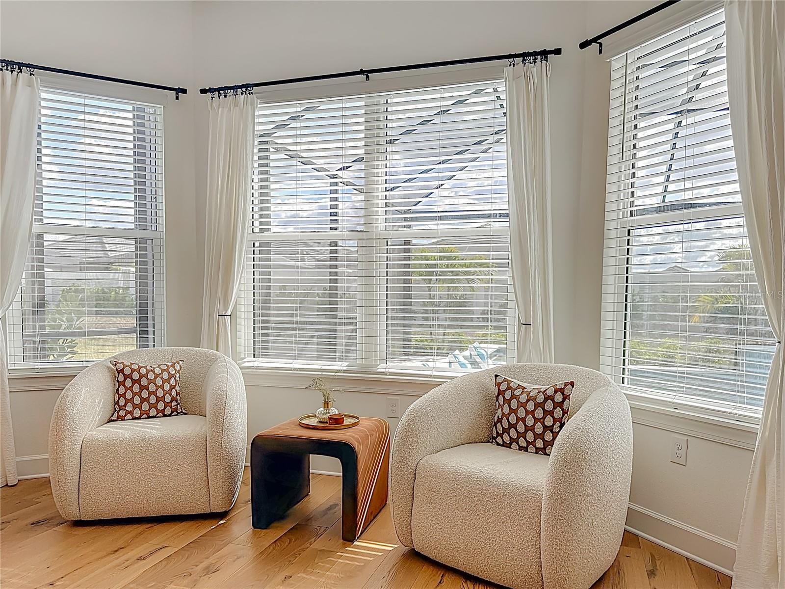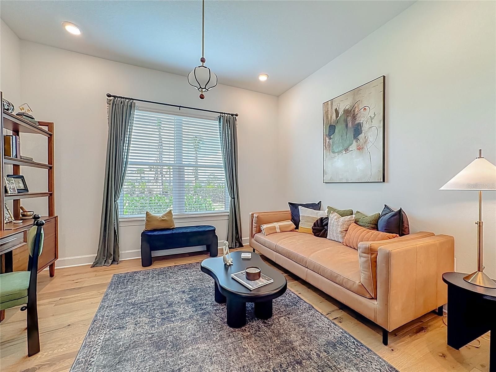 Located in the sought-after Esplanade at Azario in Lakewood Ranch, this professionally decorated single-family home on a corner lot, offers luxury living with an open, entertainer-friendly design. The home features three bedrooms, three full bathrooms, an over sized garage, and a versatile flex room/office that easily serve as a fourth bedroom. The gourmet kitchen showcases quartz countertops, upgraded cabinetry, stainless steel appliances, tile backsplash, and an oversized island with prep sink and built-in bar refrigerator. The open floor plan flows into the eat-in dining area and spacious family room with tray ceilings and large sliders that flood the home with natural light. Enjoy seamless indoor-outdoor living on the private lanai featuring a built-in outdoor kitchen, fireplace, and a heated pool and spa with sun shelf and waterfall features. The home offers two primary suites with walk-in closets and spa inspired baths with double quartz vanities and porcelain tile. Additional highlights include upgraded hardwood floors, hurricane impact windows and doors, custom window treatments and decorative wallpaper. Residents enjoy resort-style amenities including a golf course, spa, fitness center, tennis and pickleball courts, community pools, culinary center with formal and casual dining, social clubs, coffee shop, and dog parks.