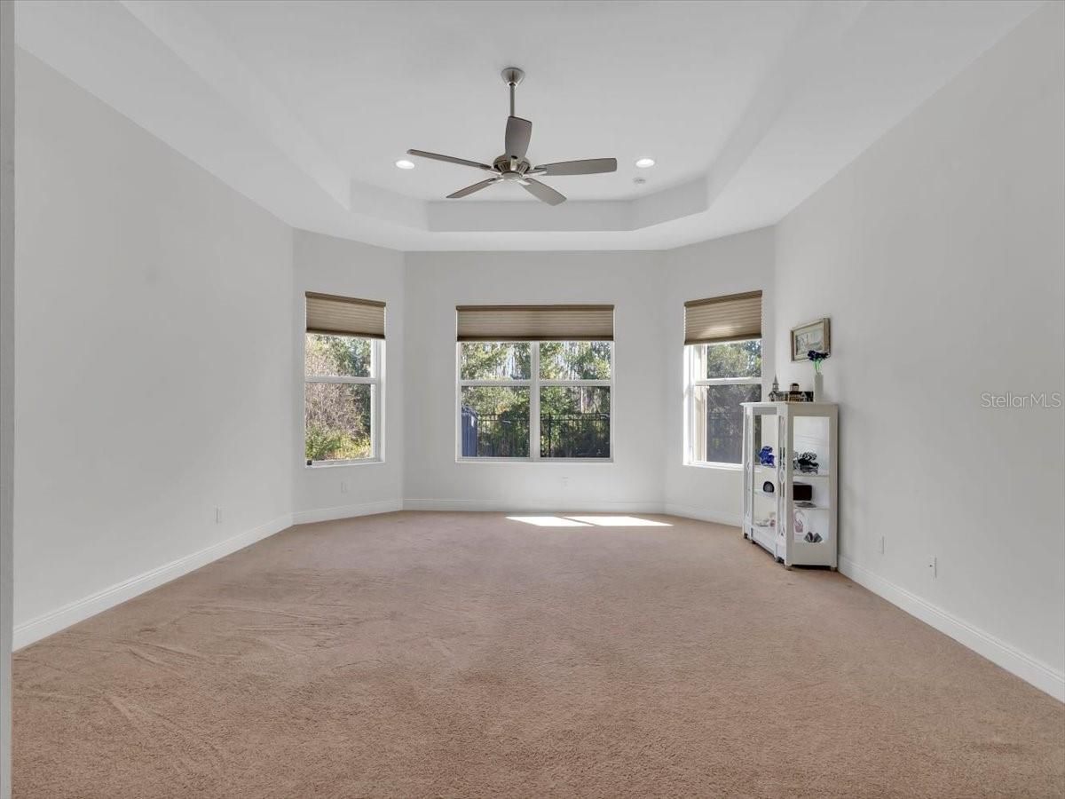 Welcome to this exquisite 2,720-square-foot Vizcaya model by GL Homes, nestled in the highly desirable Valencia Lakes 55+ active lifestyle community. From the moment you arrive, this residence radiates sophistication and comfort. A screened portico and impressive French double doors open to a grand foyer with soaring 14–15-foot tray ceilings, crown molding, and diagonally laid porcelain tile floors that immediately set the tone for the elegance throughout. Designed for both everyday living and entertaining, the open layout includes three spacious bedrooms—each with its own ensuite bath—plus a private office, expansive great room, gourmet kitchen, formal dining space, and casual breakfast nook overlooking the lanai. The chef’s kitchen is a showpiece with rich espresso cabinetry, quartz countertops, mosaic tile backsplash, stainless-steel appliances, double ovens, and a vented cooktop hood, offering both beauty and function. The 26’x20’ great room feels bright and inviting, enhanced by a dramatic tray ceiling, 72-inch Monte Carlo ceiling fan, recessed lighting, and a 12-foot sliding glass door that leads to a tropical outdoor escape. The luxurious primary suite is a true retreat featuring a 19’x16’ bedroom with a bay window view of the peaceful Cypress Preserve, dual walk-in closets, and a spa-like bathroom complete with two vanities, quartz counters, a garden soaking tub, and a separate walk-in shower. Two additional guest suites each feature generous storage and tastefully appointed bathrooms for ultimate privacy. Step outside to the 21’x10’ lanai and enjoy the sparkling 13’x27’ saltwater pool within a screened enclosure and fenced backyard—perfect for relaxing or hosting friends. The three-car garage is equally impressive with epoxy floors, custom storage, insulated belt-drive doors, and a dedicated 20 AMP circuit. Added peace of mind comes with accordion hurricane shutters, a 4-ton HVAC system, and a 200 AMP electrical panel with an Eaton home surge protector. Living in Valencia Lakes means access to world-class amenities including pools, tennis and pickleball courts, a state-of-the-art fitness center, café, and a variety of clubs and events. This home offers refined design, low-maintenance luxury, and the ultimate Florida lifestyle in one of Tampa Bay’s most desirable active adult communities.