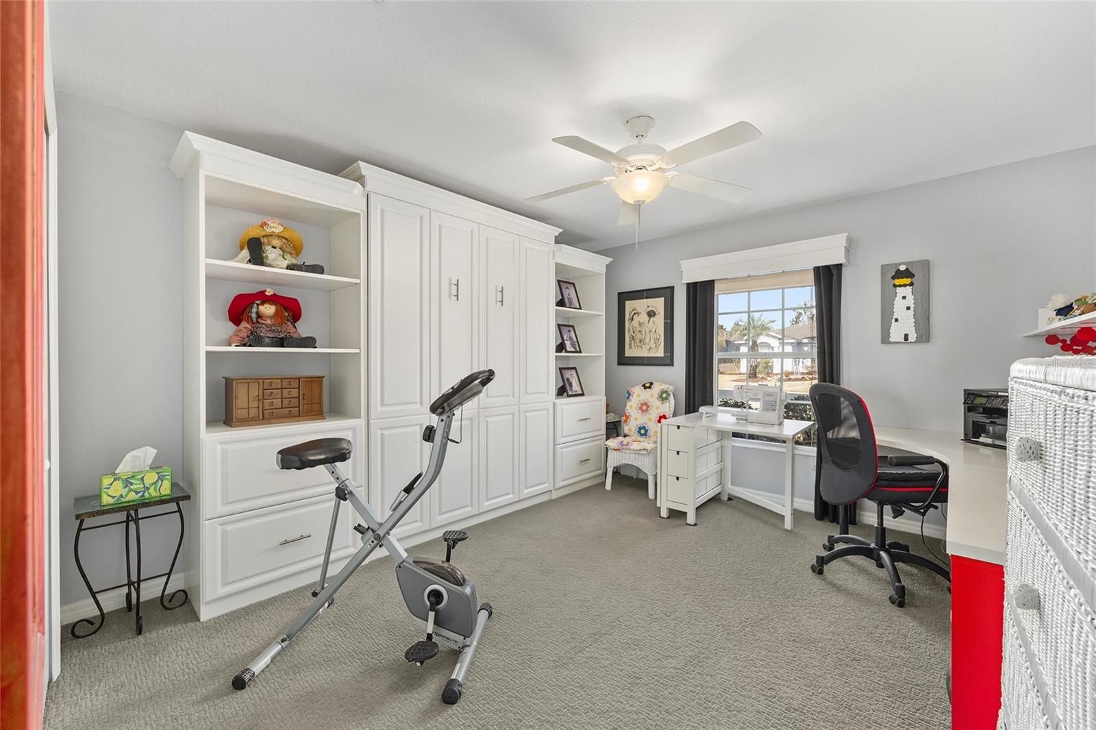 Perfectly Priced Home in Summerglen- 55+ Gated Community! Discover this pristine 2-bedroom, 2-bath home with an additional room perfect for a den, office, or extra bedroom in the highly sought-after Summerglen subdivision, a secure, gated 55+ community. Located close to shopping and in an area undergoing exciting improvements, this home shows true pride of ownership. Step inside to find tiled flooring in the main living areas, a functional kitchen oasis with Corian countertops, cabinets with pull-out drawers, a newer disposal, and a spacious breakfast area with large windows overlooking lush green space. Three solar tubes and custom wood valances add charm and natural light throughout. A Murphy bed in the guest room adds flexibility, while the main bedroom features a walk-in closet and separate his-and-her sinks. Enjoy evenings in your lovely lanai with decorative painted floors and an extended 15x25 birdcage-perfect for relaxing or entertaining. The home faces north, one of the most desirable exposures. Additional highlights include Professional landscaping with underground sprinkler system, Decorative painted driveway and walkway, Front door with hideaway screen, Two-car attached garage with sliding screen, water softener, and extra storage. The low HOA fee covers cable with hundreds of channels, lawn maintenance, trash pickup twice weekly, internet, and Wi-Fi-making for truly low-maintenance living. This home offers both comfort and style-buy it while you can! Priced to sell, think carefully, but act fast.