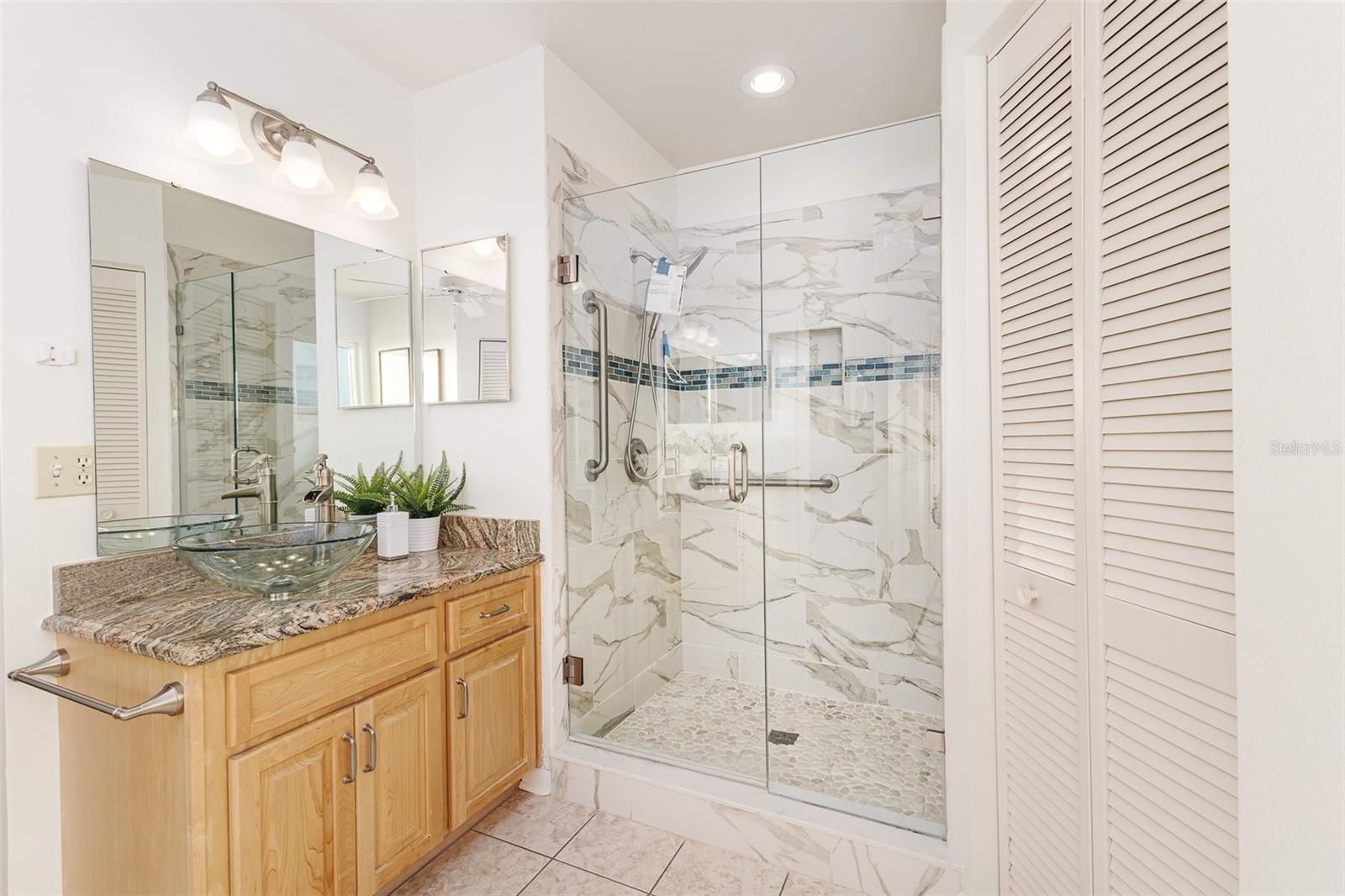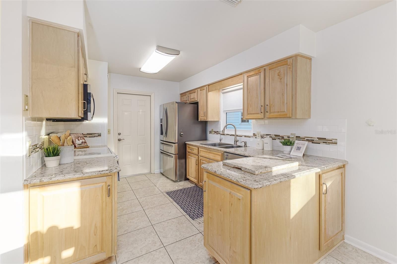 Beautifully Updated 2-Bedroom, 2-Bath Home with Premium Upgrades Throughout Step into modern comfort and efficiency in this beautifully remodeled 2-bedroom, 2-bath home offering 1,751 sq. ft. of heated living space including a heated and cooled garage with dual air ducts—perfect for a workshop, gym, or additional living area. Enjoy peace of mind with a newer roof (2020), new AC installed February 2025, and all-new UV-protected windows and exterior doors, including elegant French doors opening from both the kitchen and living room leading to your screened in back lanai. Inside, the home features new LVP flooring, custom-built maple cabinetry with custom pull-out drawers in the pantry and quartz countertops in the kitchen. The bathrooms boast granite countertops, vessel sinks, modern toilets, and a newly tiled walk-in shower in the en suite primary bath. The kitchen is a chef’s delight with a new refrigerator, top-of-the-line dishwasher, and reverse osmosis water filtration under the sink. A water softener system and energy-efficient Platinum Rheem electric water heater (approx. 2 years old) with compressor to pull hot air from the room to further enhance comfort and sustainability. Outdoor living shines with two screened lanais—one large lanai overlooking the backyard and a second at the front entry—ideal for relaxing or entertaining and to enjoy both sunsets and sunrises. The attractive widened paver driveway adds great curb appeal, and the attic’s double insulation boosts energy efficiency year-round. Additional highlights include automatic window blinds in the kitchen and living room and thoughtful, high-quality finishes throughout. This home truly blends modern style, energy efficiency, and meticulous craftsmanship—ready for you to move right in and enjoy! This gated 55+ community both a large clubhouse, Olympic size, swimming pool, hot tub, sauna, shuffleboard courts, a fitness room, a small library, and billiards room! Plenty of activities and community events throughout the year. Golf carts are welcome! The low HOA cost includes Internet and cable, grounds maintenance to your property and all common ground property, along with common property amenities. Welcome to your new home!!