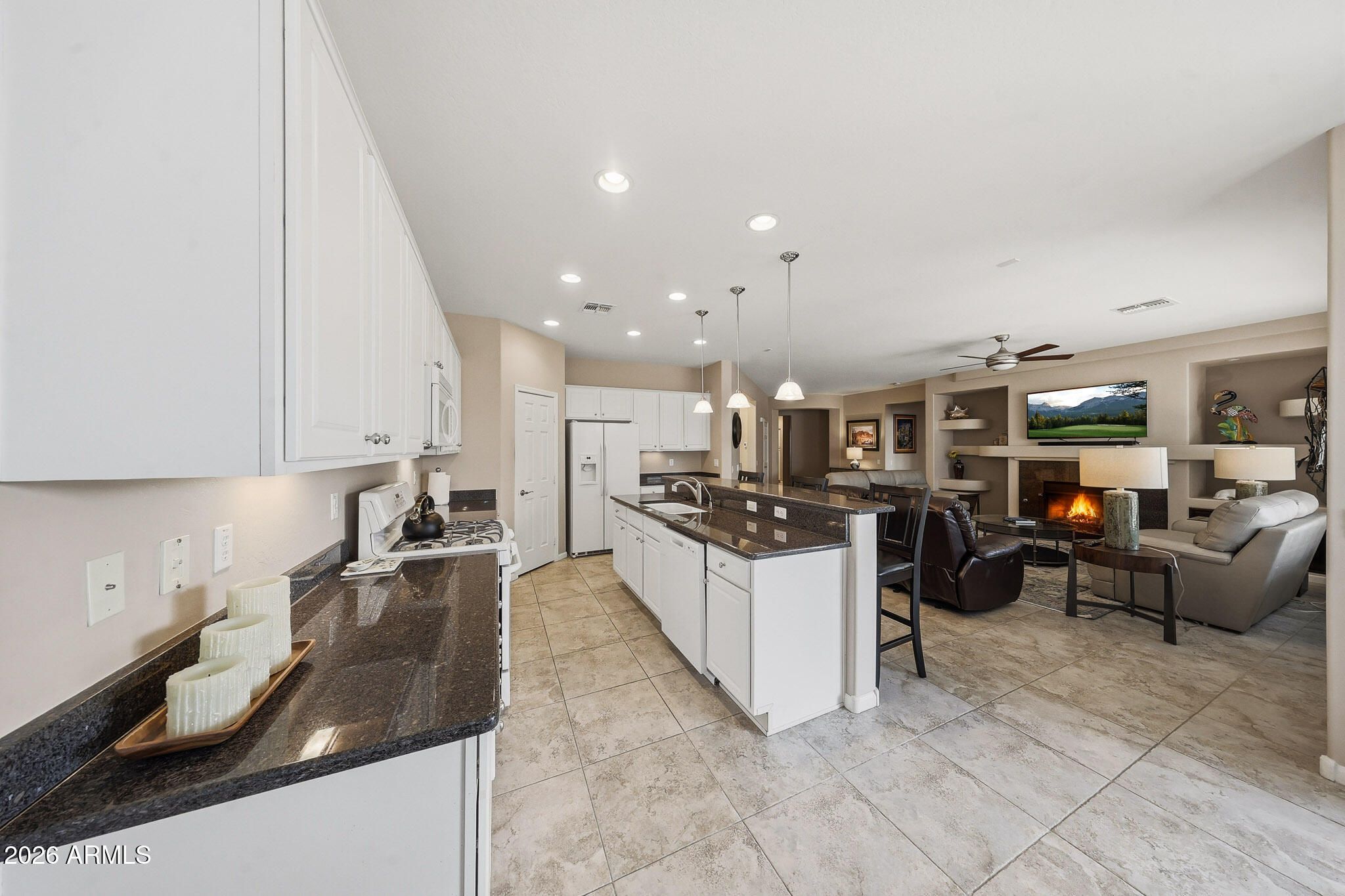 Welcome home to this beautifully upgraded Newport model, nestled on a premium oversized common-area lot with peaceful, park-like views that invite you to relax and unwind. Offered fully furnished, this home is truly move-in ready—just bring your suitcase and start enjoying the lifestyle. The south-facing patio is a favorite gathering spot, featuring an extended paver patio and a thoughtfully designed outdoor cooking area with a gas grill—perfect for slow mornings with coffee, evening dinners under the stars, or entertaining friends and family. Inside, the inviting foyer welcomes you with soft, neutral travertine tile accented by an elegant medallion inlay, setting a warm and refined tone. The heart of the home is the charming chef's kitchen, complete with and a private ensuite with upgraded countertops and a beautifully finished shower with bench. Additional highlights include an extended garage with built-in cabinetry, a great room wired for surround sound, upgraded carpet, ceiling fans throughout, and a smart home system. This exceptional home combines comfort, style, and convenience in a highly desirable setting. Located in the guarded Pebblecreek Golf Resort community in the City of Goodyear, offering an ideal location that's close to everything. Pebblecreek is a Master Planned Retirement Community for Active Adults and offers the following amenities: *Gated/Guarded Entry *54 holes of championship golf & pro shop *20 Pickleball courts, tennis complexes & bocce *Clubhouses, fitness centers, pools & restaurants *332-seat Performance Theater *Creative Arts Center & walking paths *Over 100 clubs, activities & classes *Softball field, dog park & more