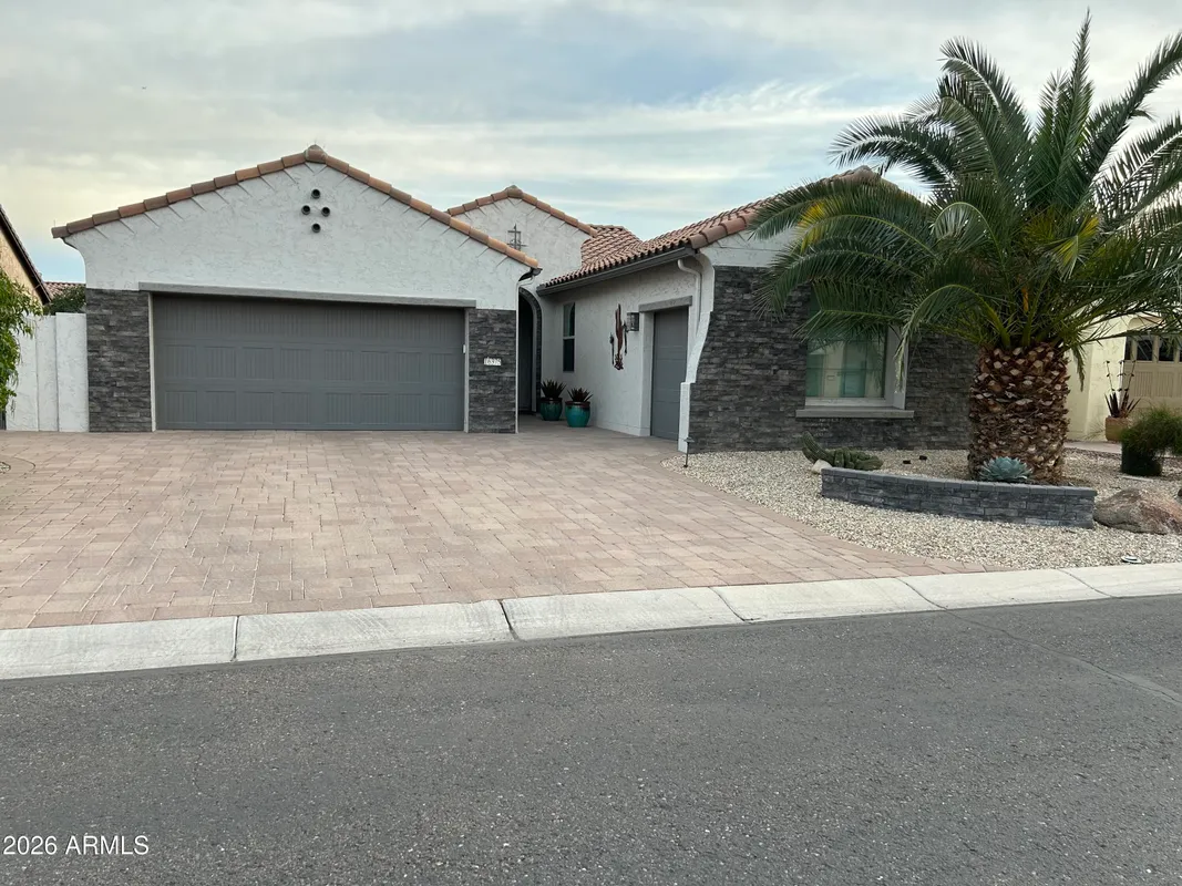 This stunning Vita model delivers high-end finishes beginning at curb appeal with Stone faced front facade and entry, expansive paver driveway, Upgraded landscaping with stone trimmed raised bed, and exterior lighting. Step inside through the Steel Shield Screen Door, Elegant coffered entry with crown molding, and more crown molding in den and dining room. Custom lighted media wall has stone faced fireplace and storage cabinets. Open kitchen with modern glass tile backsplash, 42'' cabinets, pull out shelves throughout (kitchen, baths and laundry/hobby room), quartz counters. Under counter lighting, SS Appliances, gas range, tile and luxury vinyl floors. The garage and oversized golf cart garage have high-end attached cabinets, a workbench in garage. Whole house Nuvo H2O water filter Laundry/Office/Hobby Room also has mounted glass and wine racks. Custom Primary Suite Closet with desk, bank of drawers, laundry bin and jewelry drawers. Beautiful backyard landscape complete with mature citrus trees, artificial turf, pergola and expanded paver patio, you'll love maximizing time outdoors year-round. Patio furniture, outdoor water feature with remote & control for color changing lights, Entry Copper Cactus Wall Art, Wine Cooler with 6 1/2 shelves, Etagere in dining room and Kitchen counter stools all available outside escrow via separate Bill of Sale. Select decorator pieces are staging.