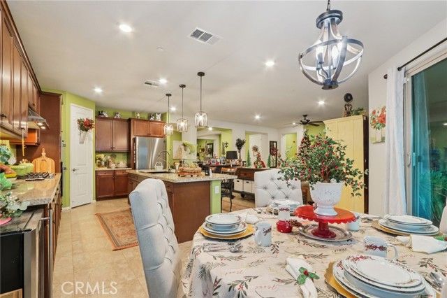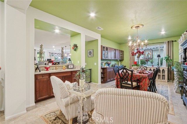 Location, location, location! Sellers are motivated and willing to consider all offers! This beautifully upgraded home is just around the corner from the Del Webb clubhouse, giving you effortless access to world-class amenities, social activities, and the vibrant 55+ lifestyle—just steps from your front door. Step inside to a bright and airy open-concept floorplan that blends spacious living with modern elegance. The main living areas feature 20-inch tile flooring, while all bedrooms boast upgraded laminate wood flooring and enhanced cabinet hardware and fixtures throughout. Ceiling fans, custom paint, custom faucets and custom lighting throughout. Entertaining is effortless in the formal dining room with custom built-in cabinetry and a stylish bar area, while the kitchen’s cozy breakfast nook provides the perfect spot for morning coffee with views of the backyard. This 3-bedroom, 3-bath home offers flexible living options. The third bedroom serves as a private suite with a walk-in closet and private step-in shower. The primary suite opens directly to the backyard patio through a security screen door and boasts an ensuite bath with brass fixtures and an upgraded vanity. Enjoy low-maintenance outdoor living with drought-tolerant landscaping and artificial turf in both the front and back yards, complemented by a California-style Alumawood patio cover with ceiling fan and two can lights—perfect for relaxing or entertaining year-round. Two storage sheds transfer with the property. Both the front entry and primary bedroom patio access feature security screen doors for comfort and airflow. The garage is a standout, with built-in cabinets, a workbench, overhead storage, and a tankless water heater, making organization and functionality a breeze. Inside, a private laundry room with sink and ample storage adds even more convenience. With its unbeatable location near the clubhouse, resort-style amenities at your doorstep, thoughtful upgrades, and beautiful drought-tolerant landscaping, this home is truly turnkey and ready for you to enjoy the best of Del Webb living.