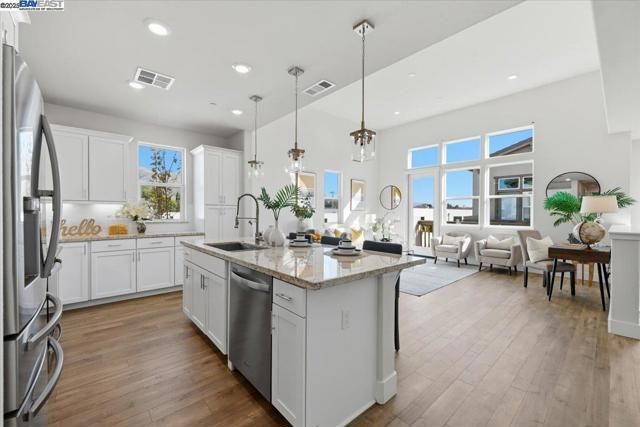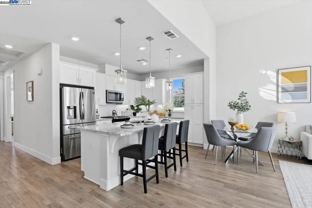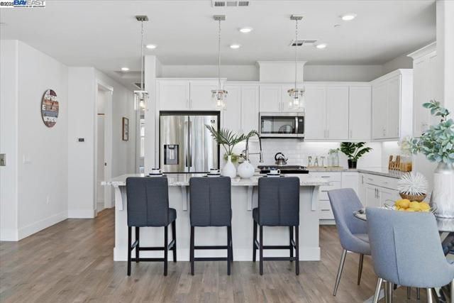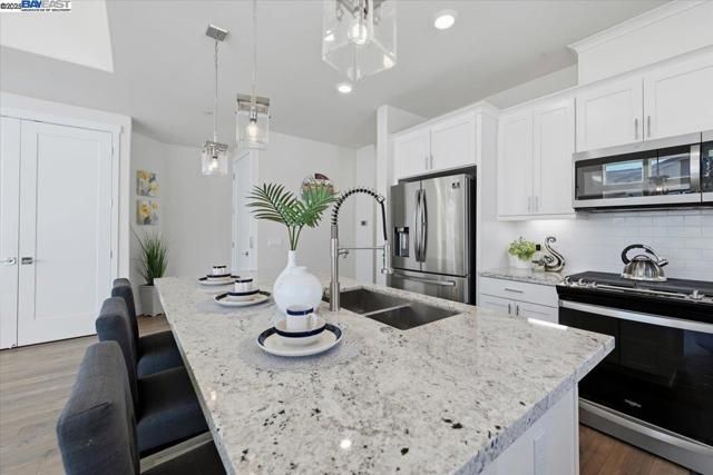 Contemporary Townhome-Style Condo in Prime Warmspring Fremont Location Experience modern elegance and everyday comfort in this beautifully designed 2-bedroom, 2-bath home offering 1,515 sq ft of bright and airy living space. All living areas are thoughtfully located on the top floor, easily accessible by stairs or your own private elevator — a true rare find! The open-concept layout features high ceilings, abundant natural light, and a gourmet kitchen with quartz countertops, stainless-steel appliances, and a spacious island perfect for cooking and entertaining. Retreat to a serene primary suite with a walk-in closet and spacious bathroom, while the second bedroom offers the flexibility for guests or a home office. Enjoy peaceful evenings on your private covered deck. Additional upgrades include LED recessed lighting, a tankless water heater, and a fully paid-off solar system plus paid off water softener for energy efficiency and comfort. Located in the highly desirable Mission Falls community of Fremont. Just minutes from BART, Highways 680 & 880, shopping, dining, and top-rated Irvington schools, this home combines style, convenience, and an exceptional location for today’s modern lifestyle.