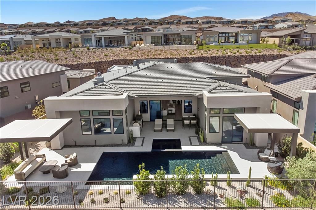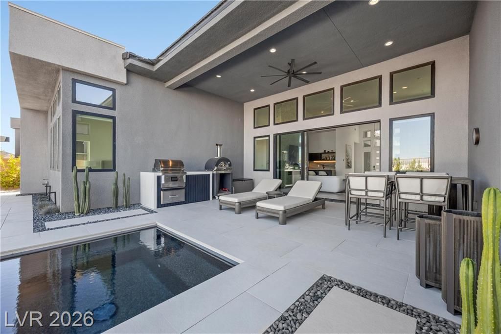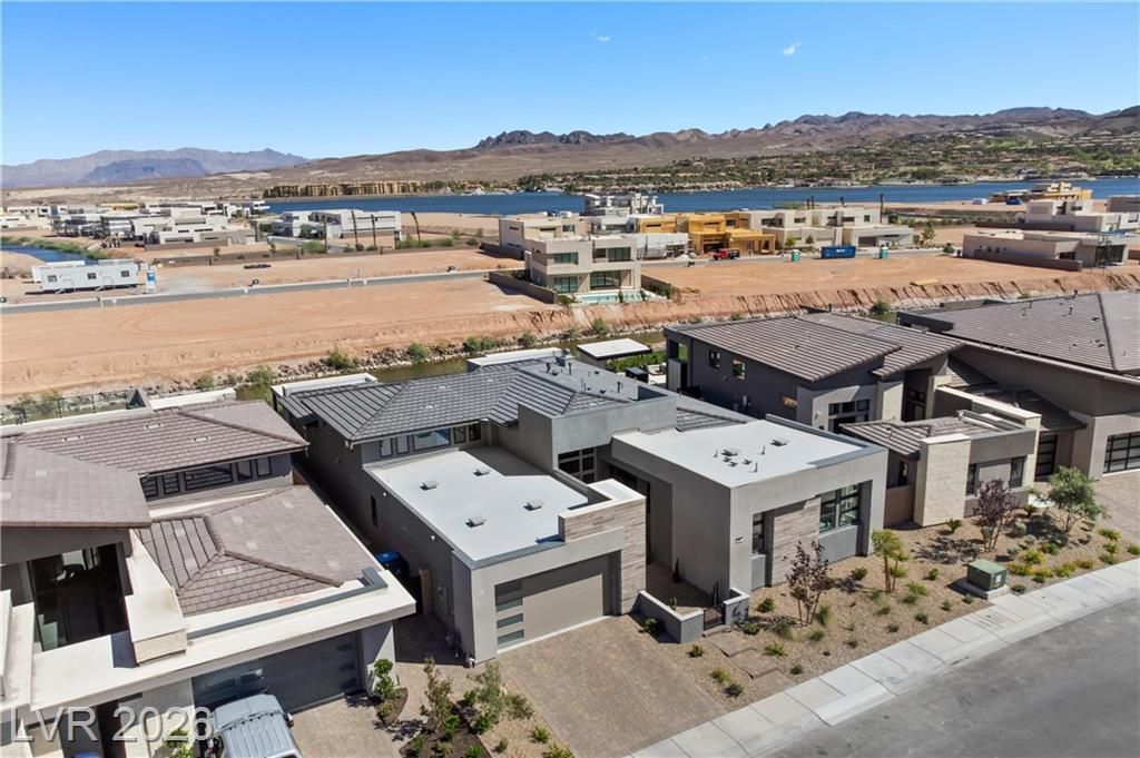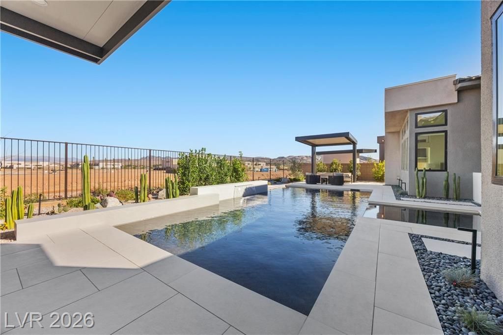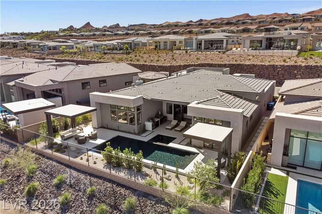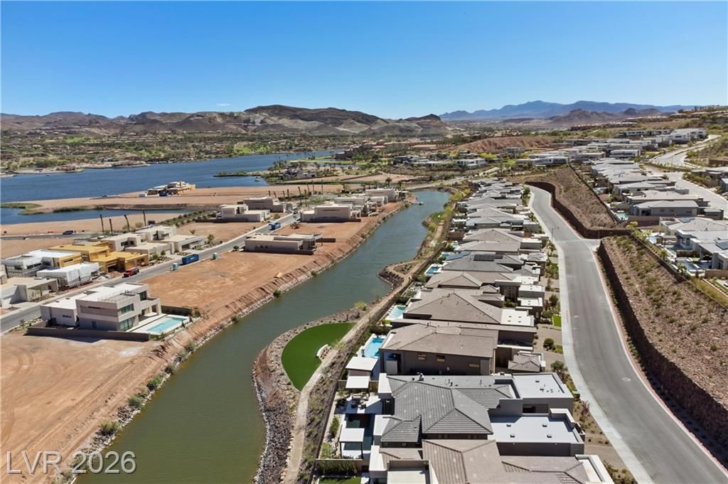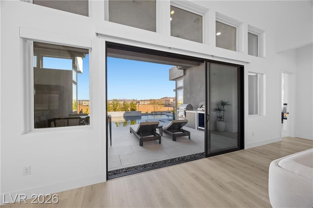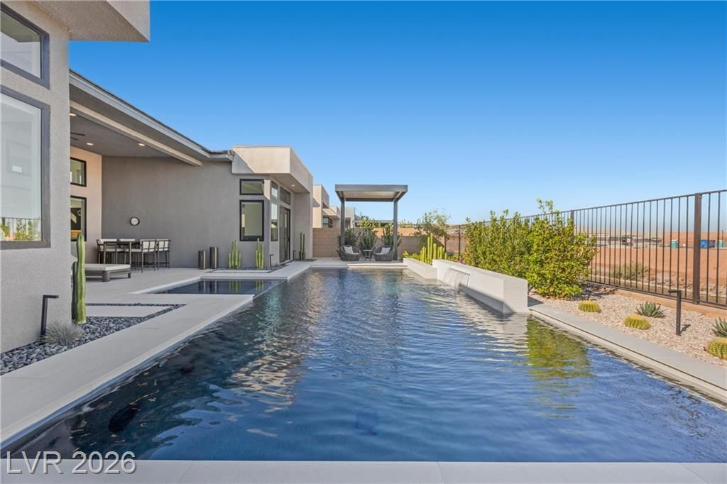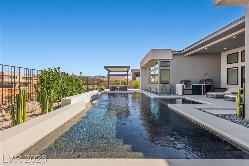 Nearly new Toll Brothers home in the gated Bella Strada community of Lake Las Vegas, backing to a tranquil water canal. Spanning 3,459 SF, this modern design features 4 bedrooms, including 3 en-suite bedrooms with private baths and a luxurious primary retreat with fireplace, spa-inspired bath, and custom walk-in closet. Soaring 16’ ceilings and expansive windows create an open, light-filled living environment. The chef’s kitchen is thoughtfully designed with Wolf and Sub-Zero appliances, quartz and marble countertops, sleek cabinetry, a walk-in pantry, dedicated prep/drop zone, and a built-in bar with wine fridge, creating a seamless space for both everyday living and entertaining. Step out back to your private oasis featuring a PebbleTec pool and spa, waterfall, cabanas, covered patio, and outdoor kitchen with built-in barbecue and pizza oven, all set against the serene canal backdrop.