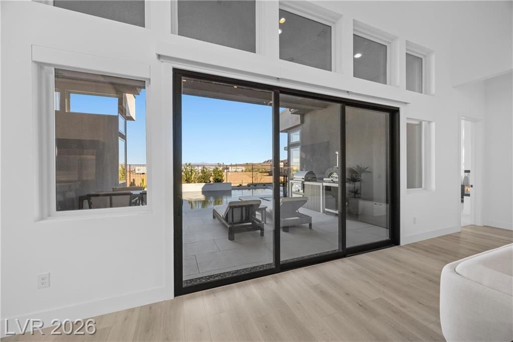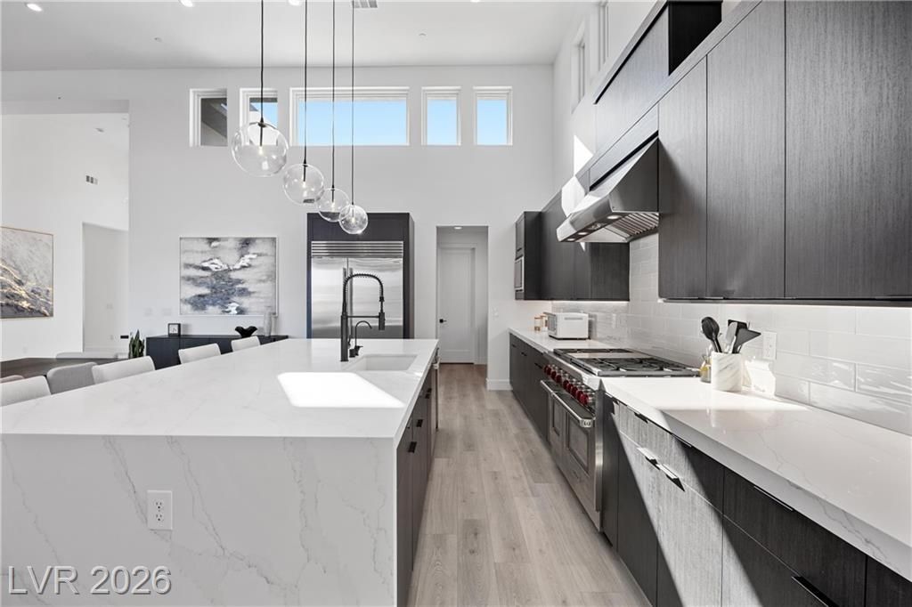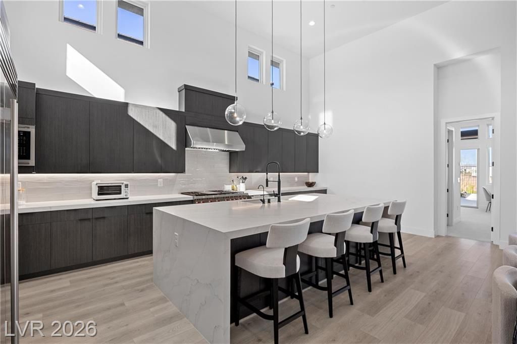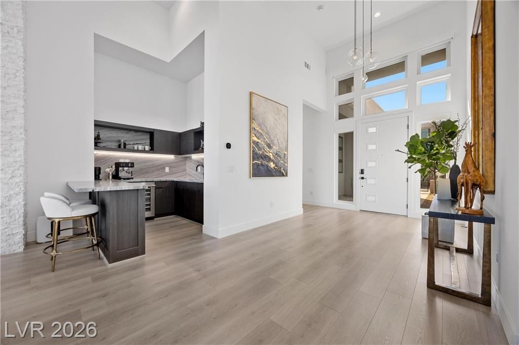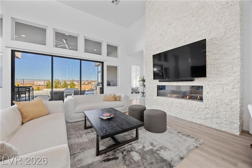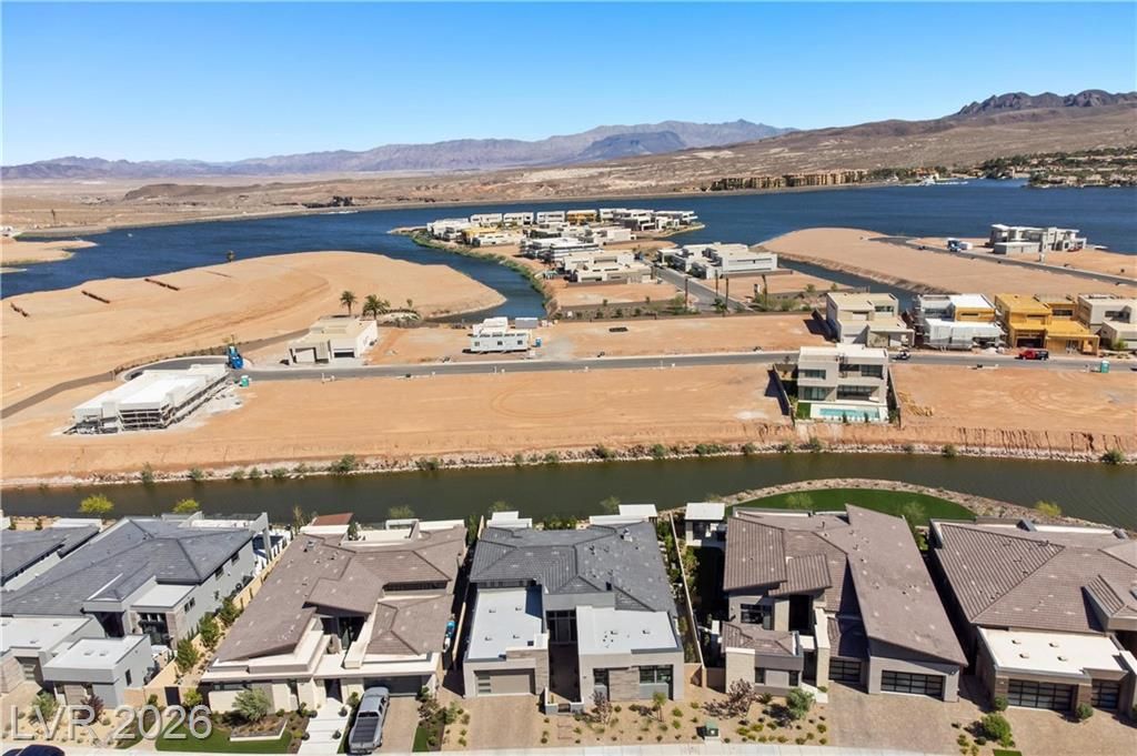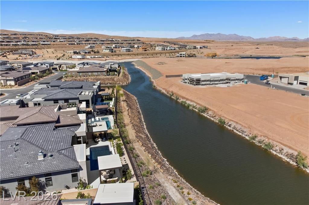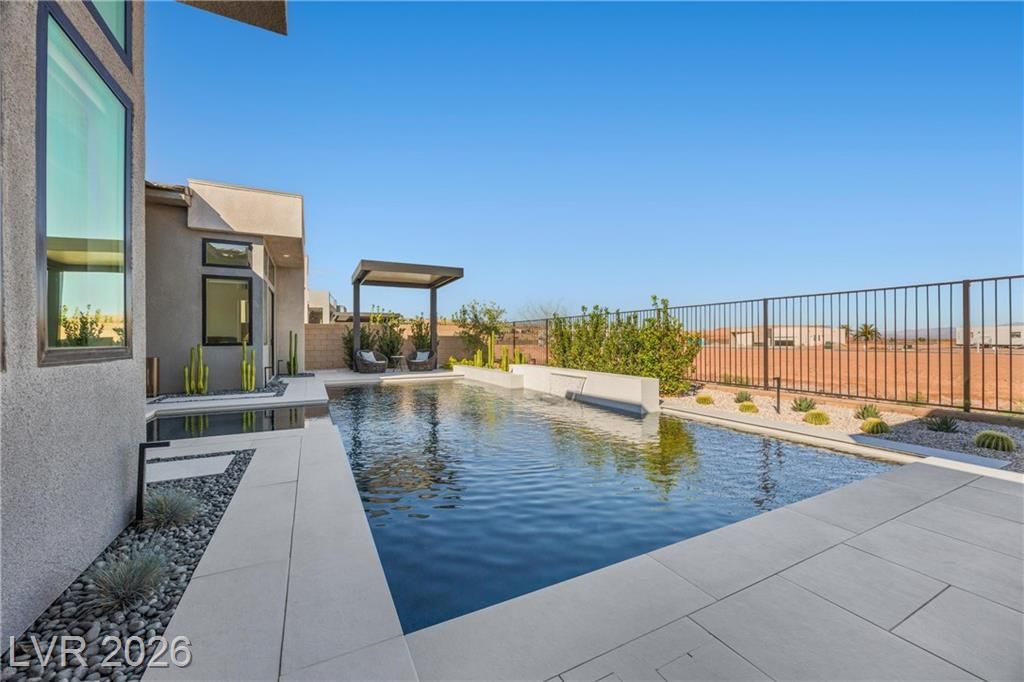 Nearly new Toll Brothers home in the gated Bella Strada community of Lake Las Vegas, backing to a tranquil water canal. Spanning 3,459 SF, this modern design features 4 bedrooms, including 3 en-suite bedrooms with private baths and a luxurious primary retreat with fireplace, spa-inspired bath, and custom walk-in closet. Soaring 16’ ceilings and expansive windows create an open, light-filled living environment. The chef’s kitchen is thoughtfully designed with Wolf and Sub-Zero appliances, quartz and marble countertops, sleek cabinetry, a walk-in pantry, dedicated prep/drop zone, and a built-in bar with wine fridge, creating a seamless space for both everyday living and entertaining. Step out back to your private oasis featuring a PebbleTec pool and spa, waterfall, cabanas, covered patio, and outdoor kitchen with built-in barbecue and pizza oven, all set against the serene canal backdrop.