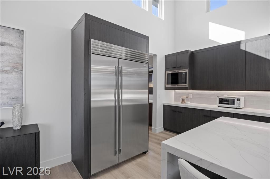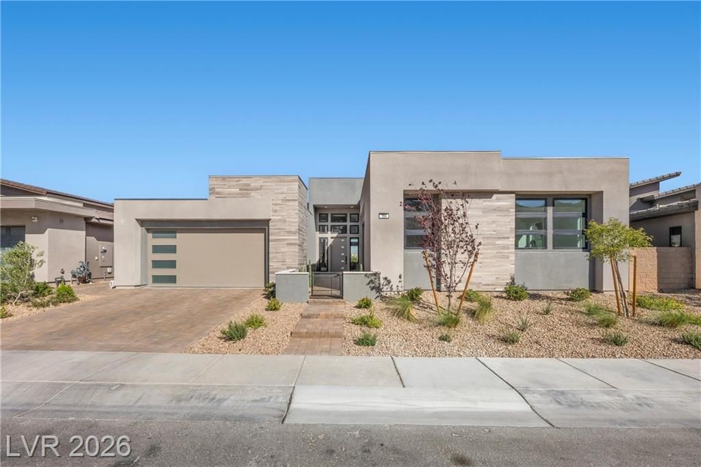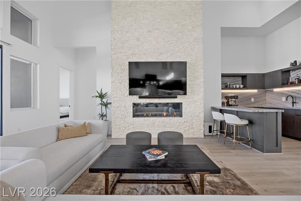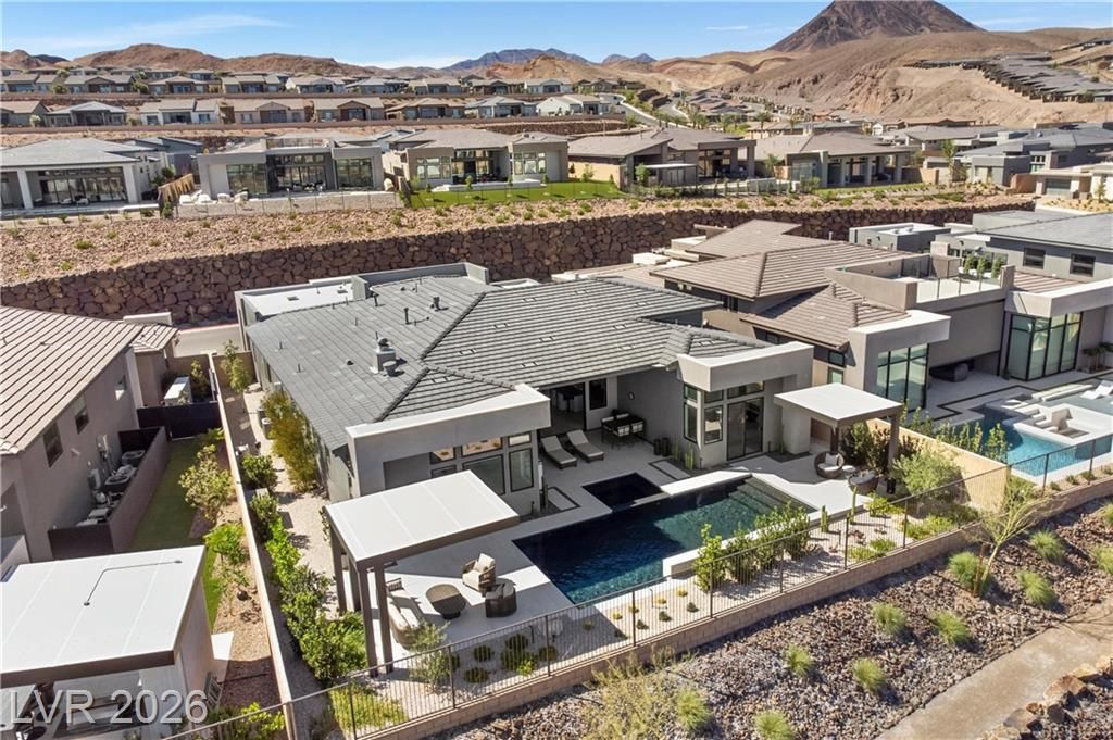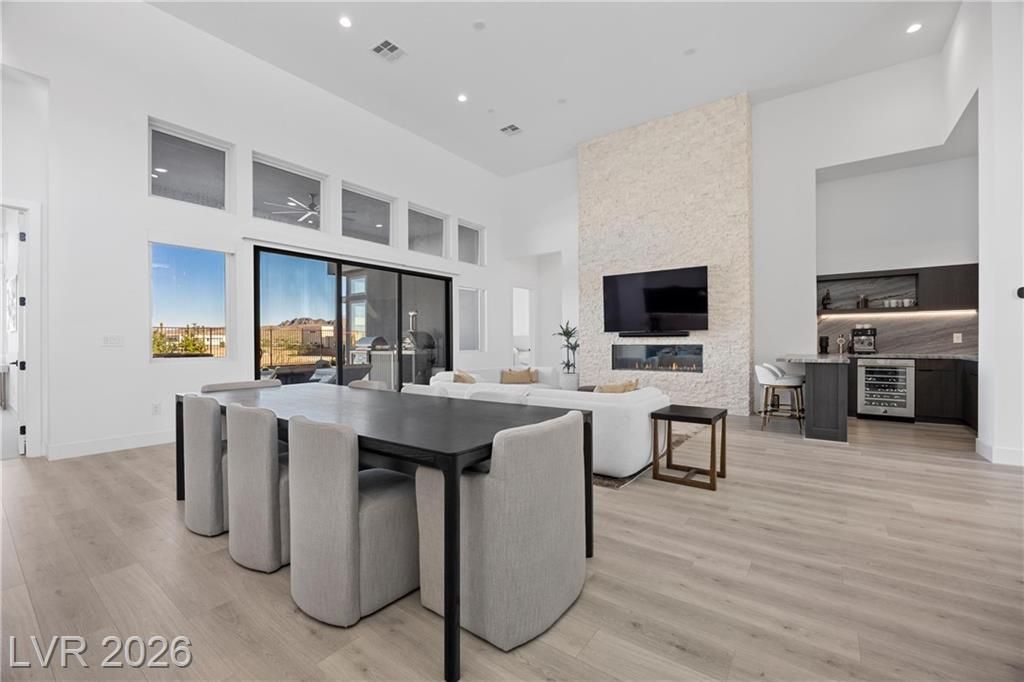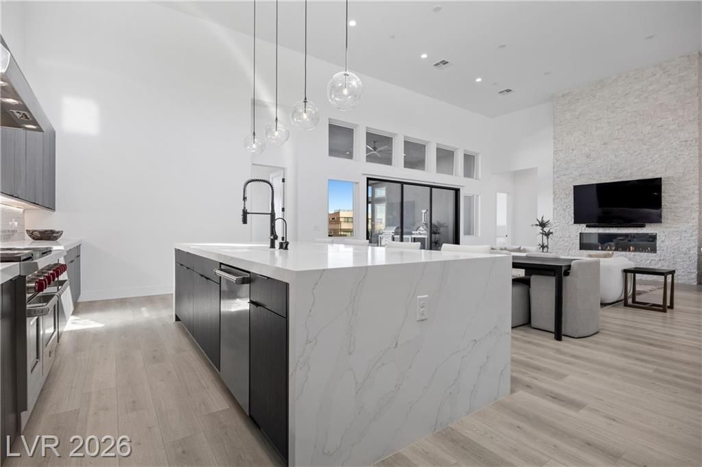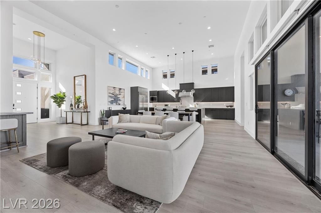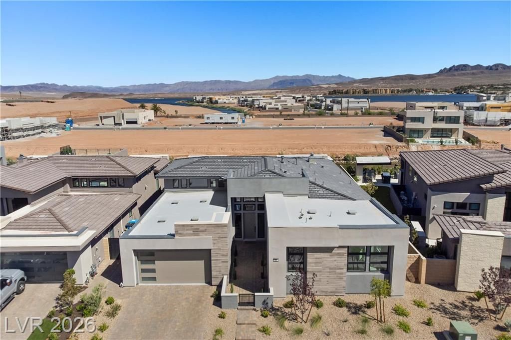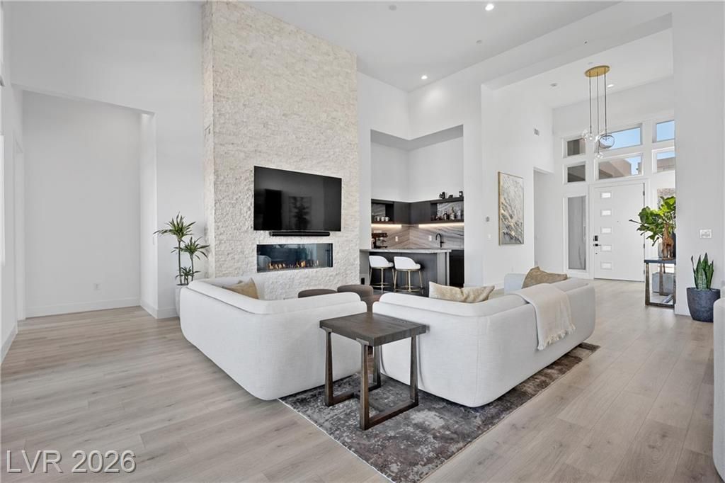 Nearly new Toll Brothers home in the gated Bella Strada community of Lake Las Vegas, backing to a tranquil water canal. Spanning 3,459 SF, this modern design features 4 bedrooms, including 3 en-suite bedrooms with private baths and a luxurious primary retreat with fireplace, spa-inspired bath, and custom walk-in closet. Soaring 16’ ceilings and expansive windows create an open, light-filled living environment. The chef’s kitchen is thoughtfully designed with Wolf and Sub-Zero appliances, quartz and marble countertops, sleek cabinetry, a walk-in pantry, dedicated prep/drop zone, and a built-in bar with wine fridge, creating a seamless space for both everyday living and entertaining. Step out back to your private oasis featuring a PebbleTec pool and spa, waterfall, cabanas, covered patio, and outdoor kitchen with built-in barbecue and pizza oven, all set against the serene canal backdrop.