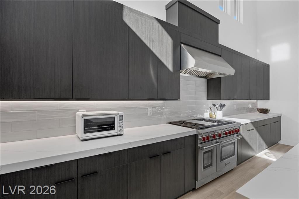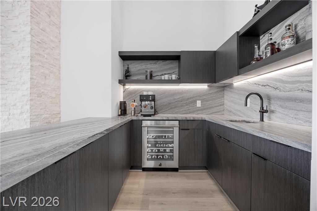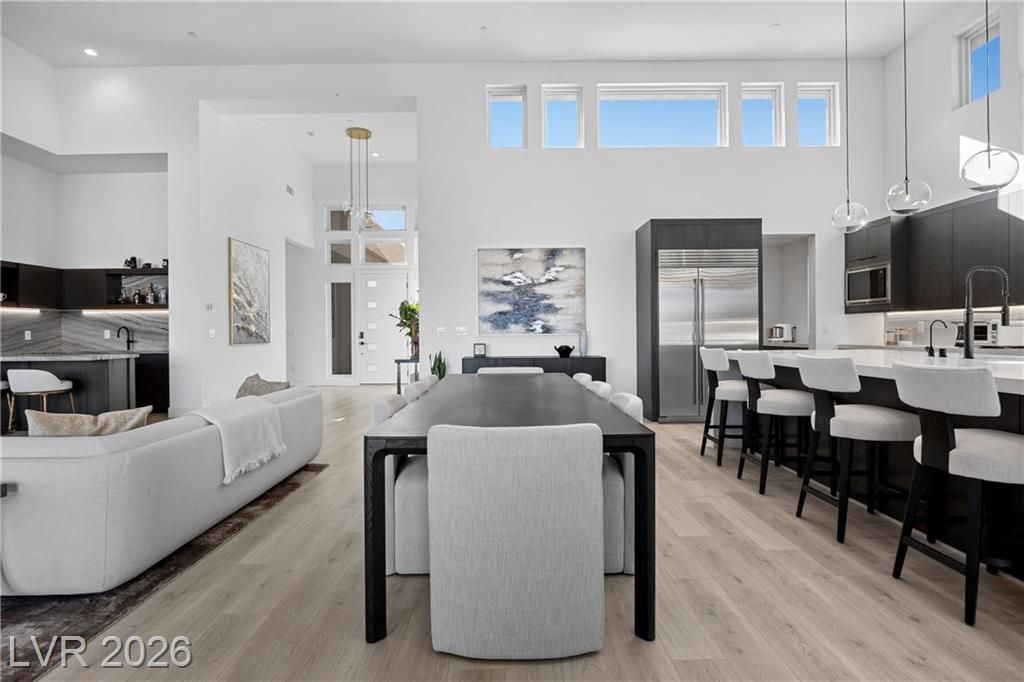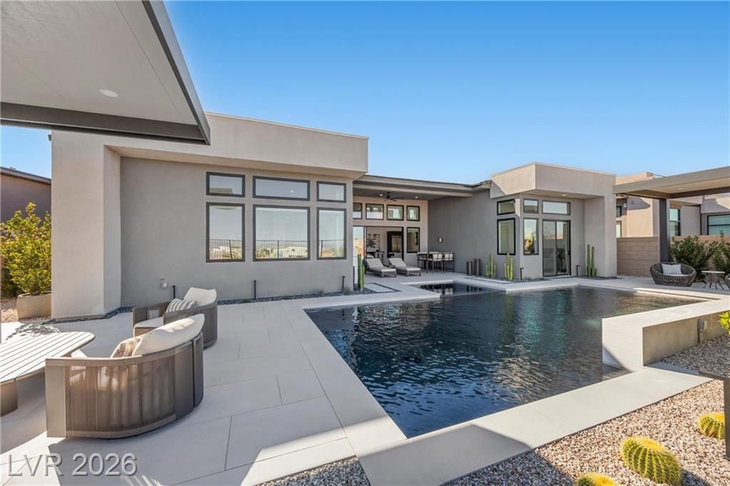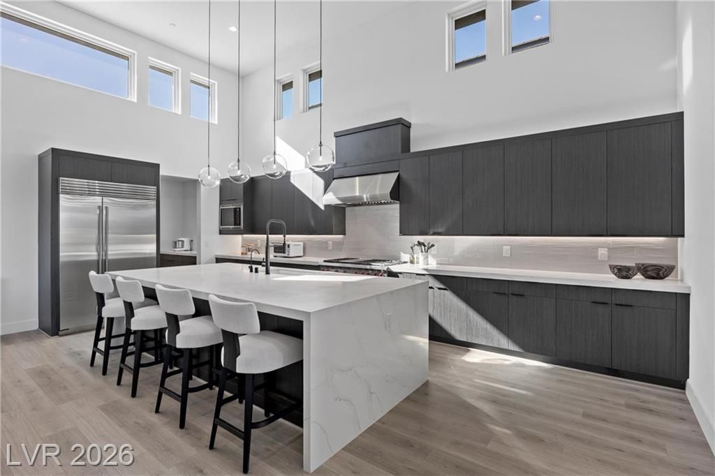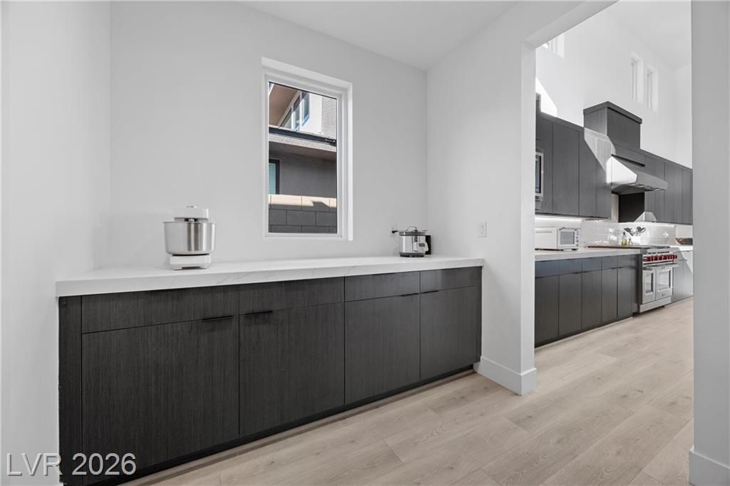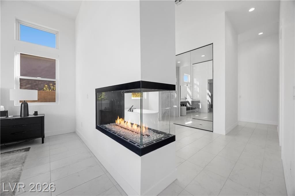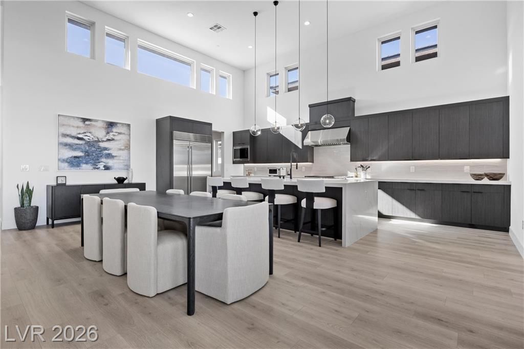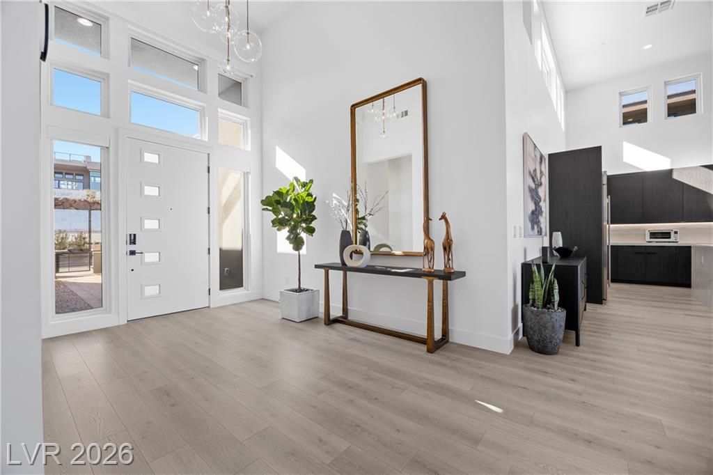 Nearly new Toll Brothers home in the gated Bella Strada community of Lake Las Vegas, backing to a tranquil water canal. Spanning 3,459 SF, this modern design features 4 bedrooms, including 3 en-suite bedrooms with private baths and a luxurious primary retreat with fireplace, spa-inspired bath, and custom walk-in closet. Soaring 16’ ceilings and expansive windows create an open, light-filled living environment. The chef’s kitchen is thoughtfully designed with Wolf and Sub-Zero appliances, quartz and marble countertops, sleek cabinetry, a walk-in pantry, dedicated prep/drop zone, and a built-in bar with wine fridge, creating a seamless space for both everyday living and entertaining. Step out back to your private oasis featuring a PebbleTec pool and spa, waterfall, cabanas, covered patio, and outdoor kitchen with built-in barbecue and pizza oven, all set against the serene canal backdrop.