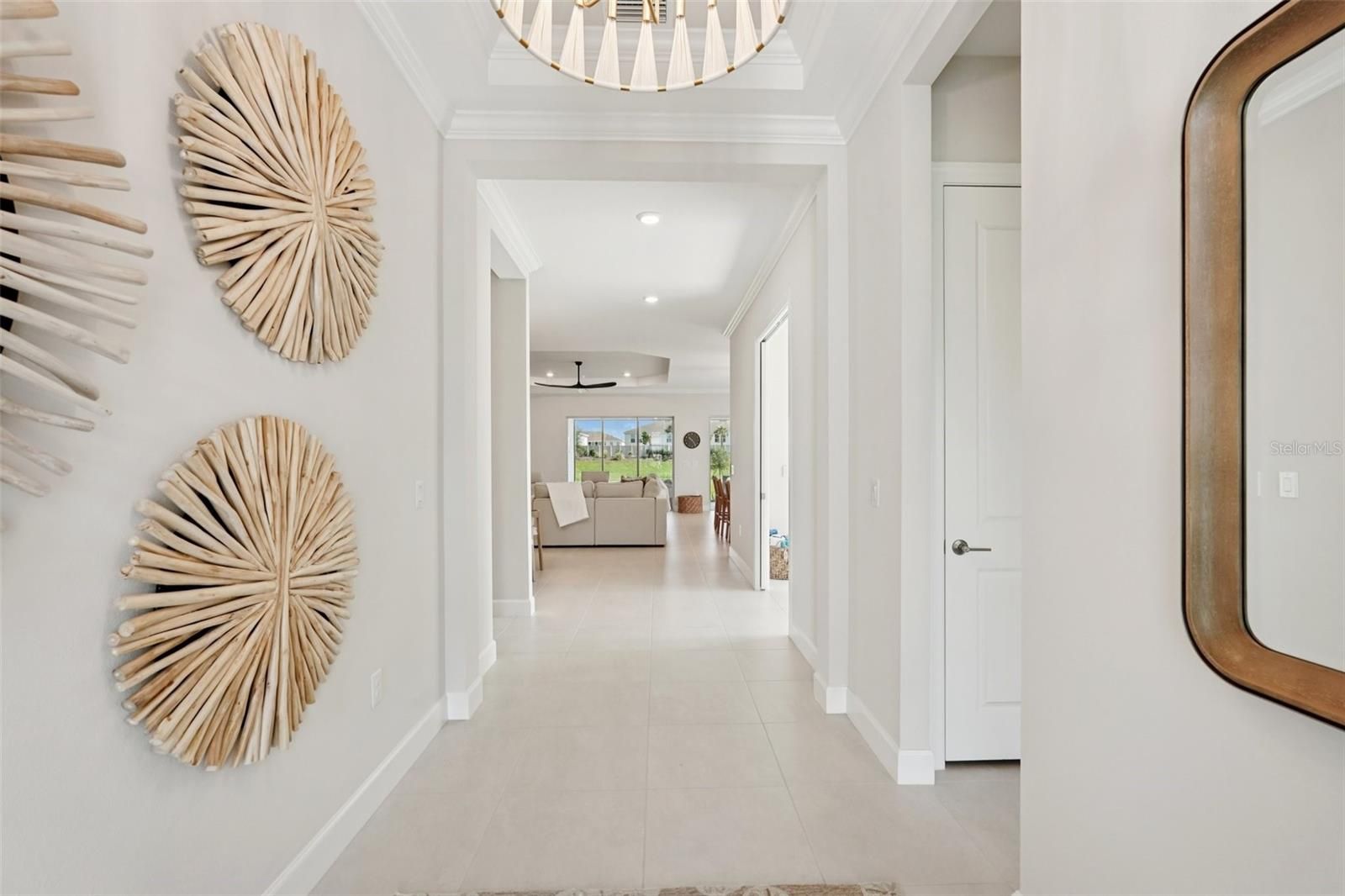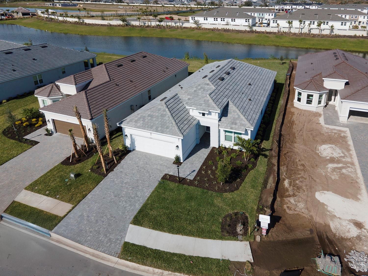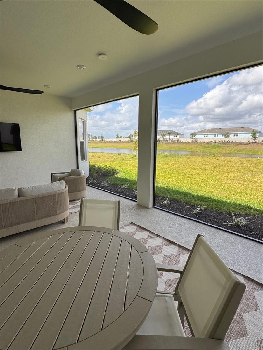 Welcome to this stunning, upgraded water-view — a 3-bedroom, 3-bathroom single-family home with a den, nestled on a premium cul-de-sac lake lot in the highly sought-after Esplanade at Azario at Lakewood Ranch. Enjoy breathtaking lake views and, all just steps from world-class resort amenities. This beautifully designed residence features a tandem 3-car garage and an impressive list of upgrades throughout. The gourmet kitchen is a chef's dream, complete with a range hood, gas cooktop, 56-bottle wine fridge, and 42" soft-close cabinets. Soaring 10' tray ceilings with double crown molding, 8' closet doors, and designer-upgraded lighting throughout create an atmosphere of refined elegance at every turn. The south-facing extended covered lanai is perfectly positioned to keep you cool and comfortable — no harsh direct sun beating in — while the backyard basks in gorgeous natural sunlight, making it ideal for outdoor entertaining. The lanai is pre-plumbed and pre-wired for outdoor entertaining and a future pool, giving you the opportunity to customize your own backyard oasis. Additional enhancements include epoxy-coated garage floors, full landscape lighting with pathway, flower bed, and palm tree uplighting, and prewiring for front and rear security cameras. Lawn maintenance is included in the HOA for true lock-and-leave convenience. While golf is not deeded to the property, independent golf memberships are available through the community pro shop. Location & Community Features Situated within the exclusive gated community of Esplanade at Azario, this home offers unparalleled privacy alongside resort-style living. Community highlights include an 18-hole championship golf course, pro shop and bunker bar, aqua driving range, resort-style pool with poolside Bahama Bar, spa and wellness center, culinary center with teaching kitchen, state-of-the-art fitness center, clubhouse, 16 pickleball courts, 6 Har-Tru tennis courts, bocce ball, walking trails, dog park, a full-time activities director, and flexible space for gaming and meetings. This exceptional home and vibrant community deliver the perfect blend of luxury, comfort, and active Florida living!