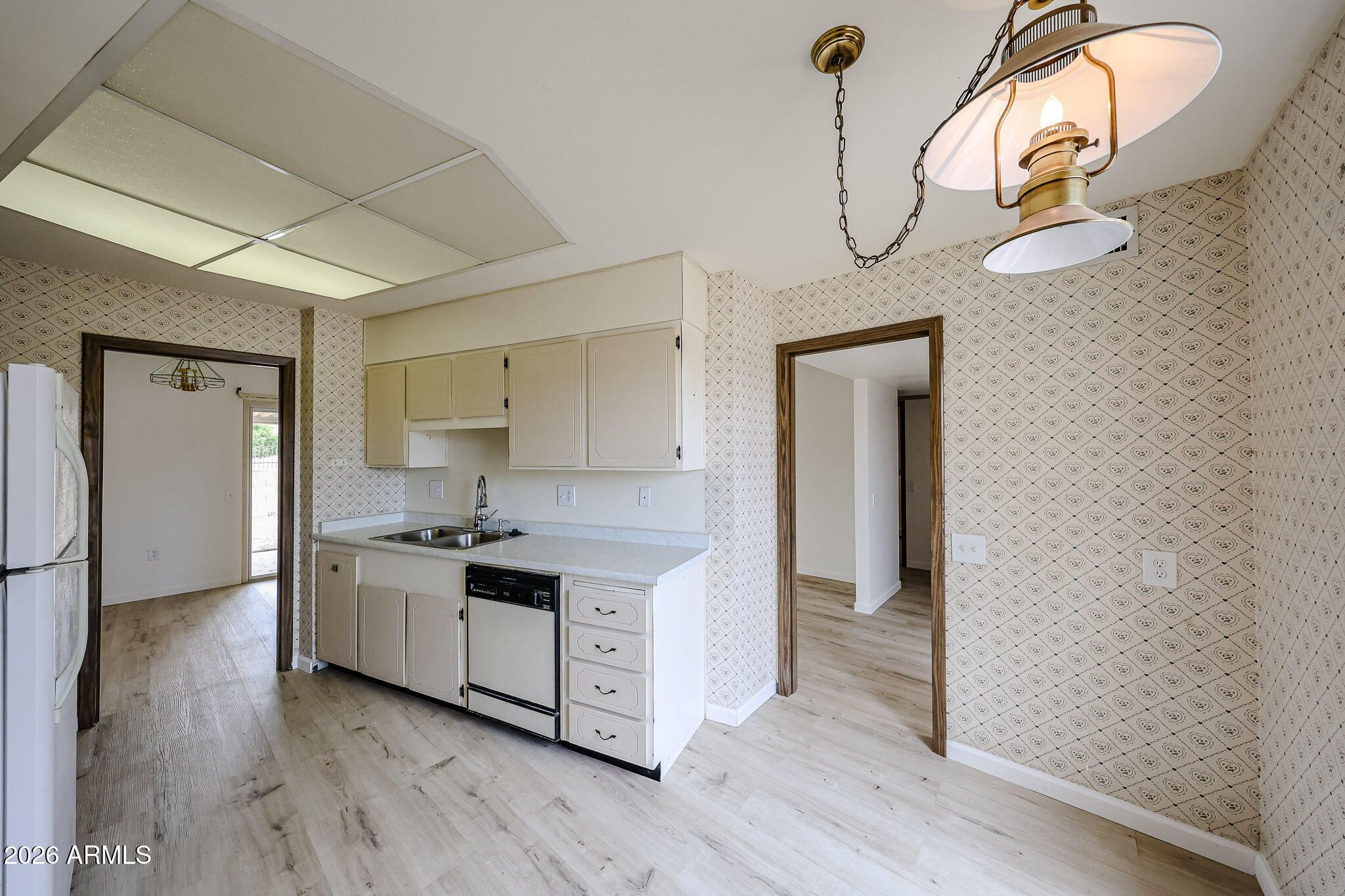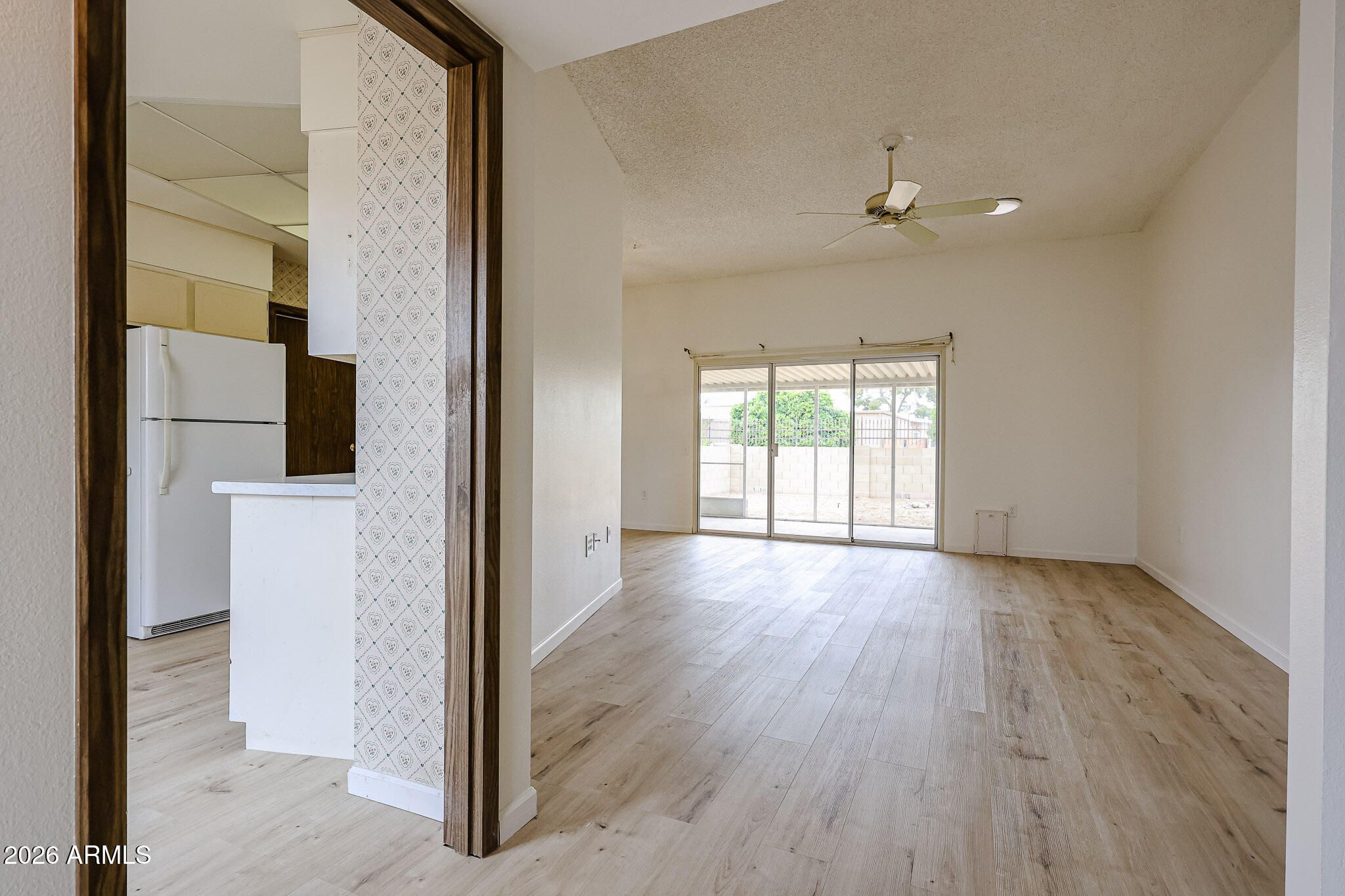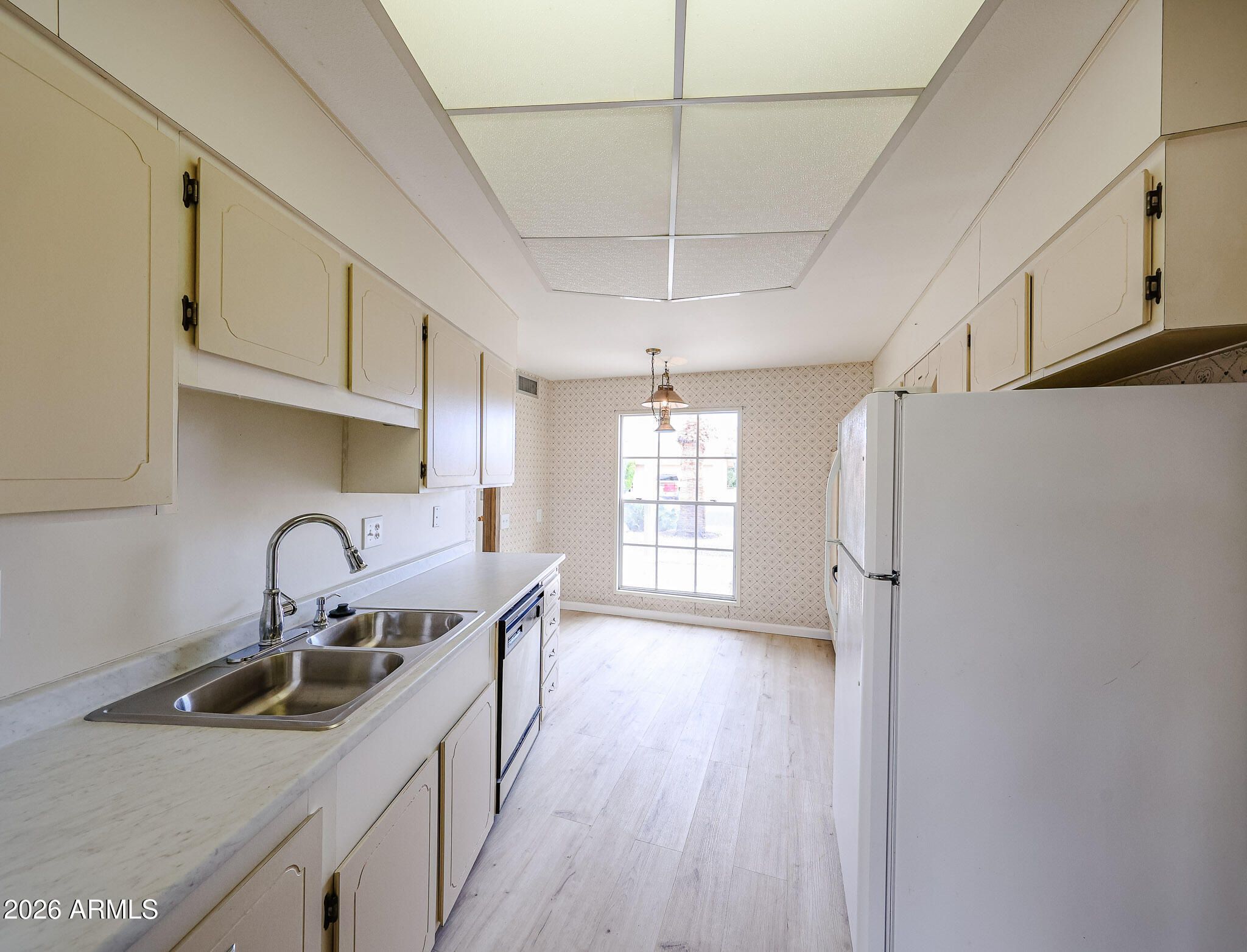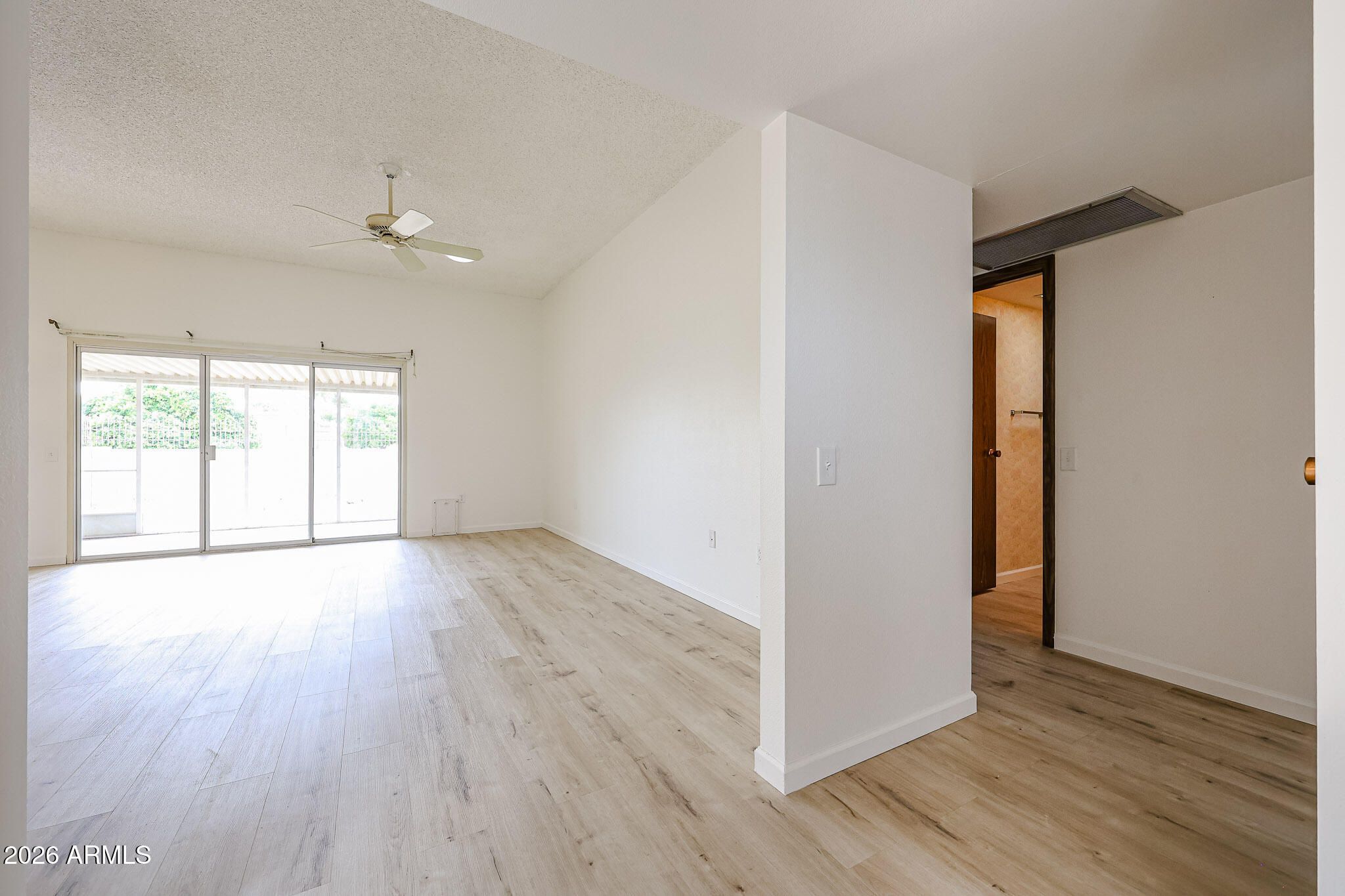 Quaint 2bs/1ba home in quiet Adult neighborhood. Home features new laminate flooring through out and fresh neutral paint inside and out. A large living room with open concept dining. Kitchen is dated but clean and functional. Bedrooms are large with large closets. Bathroom has walk in tub. Large yard with fenced in area and doggie door for your pets, Covered patio for early morning coffee or entertaining. Extra Large garage with cabinets, Desert and gravel landscaping for easy maintenance. Close to amenities and the 101. Just waiting for your personal touch to make it a home