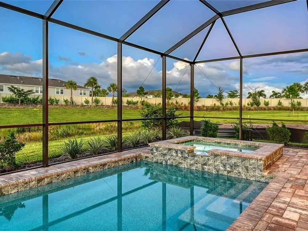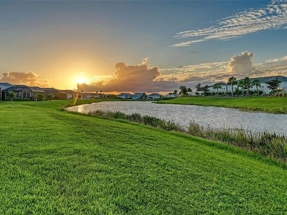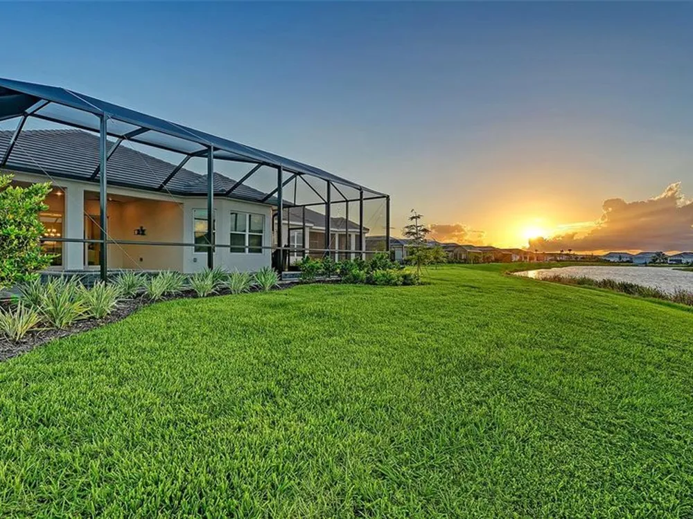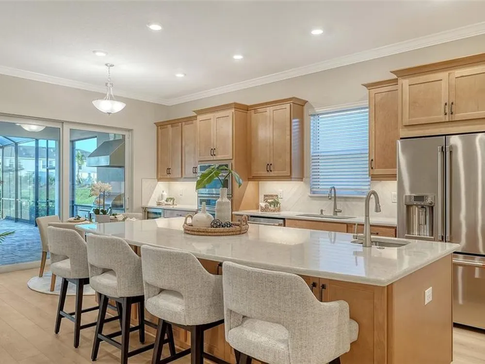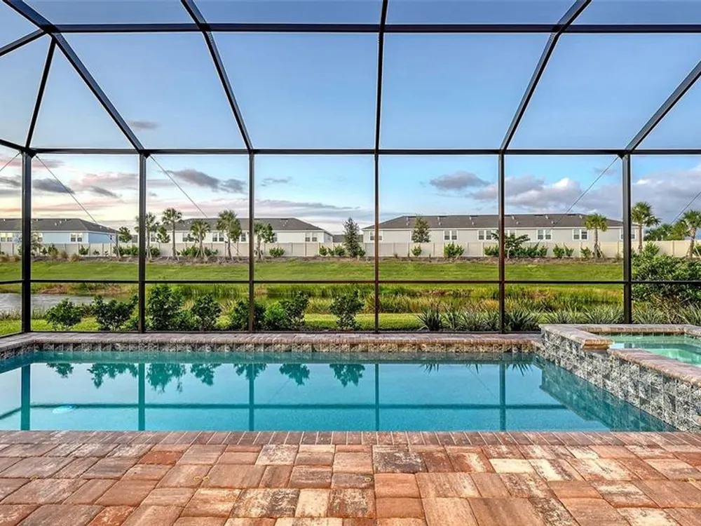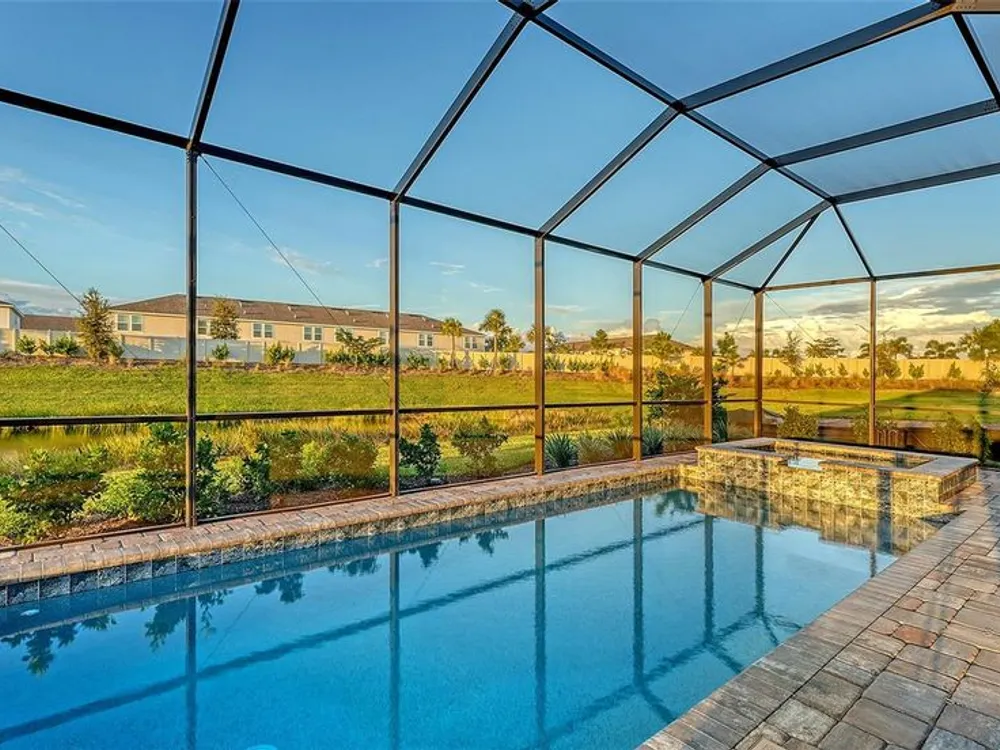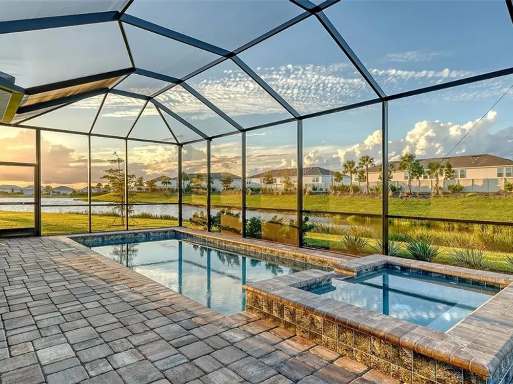 Discover resort-style living at its finest in this fully loaded 3-bedroom, 3-bath plus office Lazio floor plan, located in the highly sought-after Esplanade at Azario in Lakewood Ranch. This exceptional, non-golf deeded home showcases impact glass windows and doors, designer finishes, and a stunning water view that sets the tone for luxury and relaxation. Step inside and experience effortless elegance with tray ceilings, crown molding, luxury vinyl plank flooring throughout, and an abundance of natural light. The gourmet kitchen is a chef’s dream, featuring Quartz countertops, a large center island, GE Monogram stainless appliances including a gas cooktop and range hood, wall-mounted oven and microwave, extended cabinetry with wine refrigerator, soft-close drawers, tile backsplash, and a spacious walk-in pantry. The open-concept great room flows seamlessly to the covered lanai with a heated saltwater pool and spa and a fully equipped outdoor kitchen, creating the perfect space for entertaining or quiet evenings watching the sunset. The primary suite is a true retreat, offering peaceful water views, a spacious walk-in closet, and a luxurious en-suite bath featuring a large walk-in shower with frameless glass, dual sink vanity, quartz countertops, and beautiful tile extending to the ceiling. Designed for modern living, the home also includes a laundry room with utility sink and cabinetry, epoxy garage flooring, glass front door with sidelights, and a tandem 3rd bay garage. Exterior enhancements include landscape lighting and bay window extensions that elevate the home’s curb appeal and livability. Located within Esplanade at Azario, residents enjoy world-class amenities—a resort-style pool and Bahama bar, full-service spa, state-of-the-art fitness center, sports courts, culinary center with teaching kitchen, on-site dining, and a full-time lifestyle director. Additional offerings include pickleball, tennis, bocce, walking trails, a dog park, community garden, and fire pit—all just minutes from Lakewood Ranch’s premier shopping, dining, and Gulf Coast beaches. This home offers the perfect blend of luxury, privacy, and low-maintenance living. Schedule your private showing today and experience the Esplanade lifestyle!