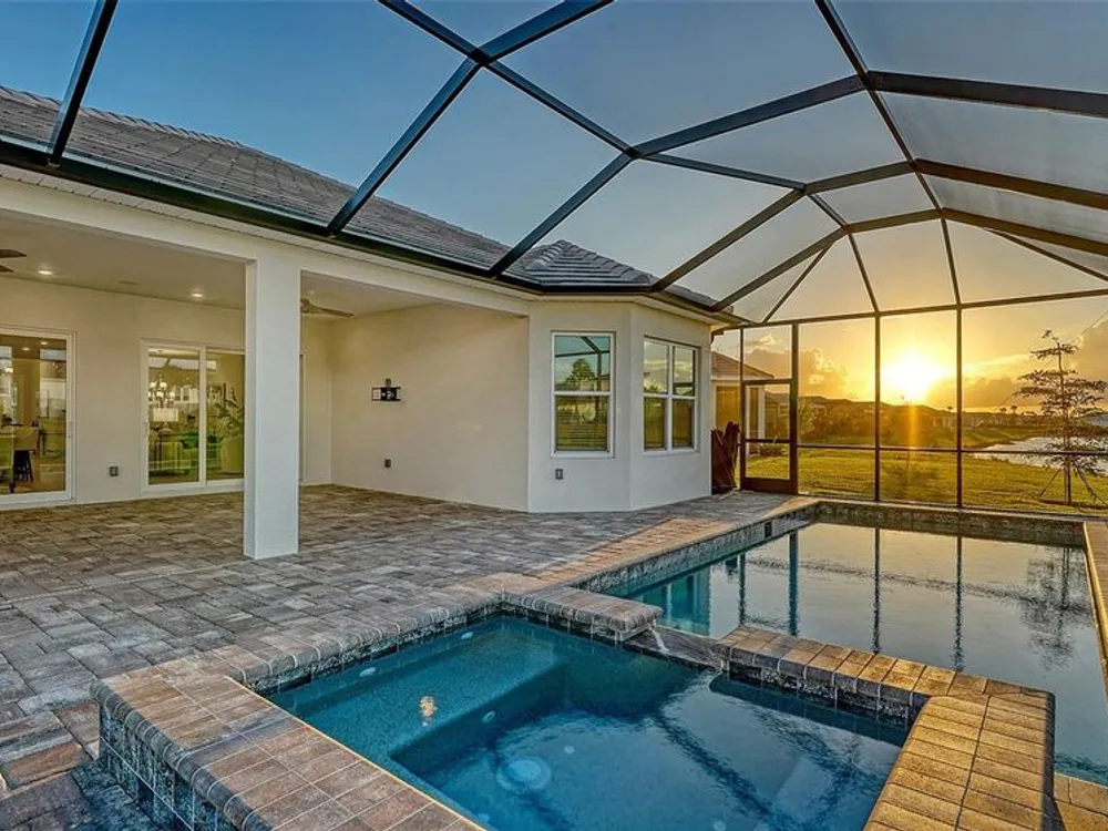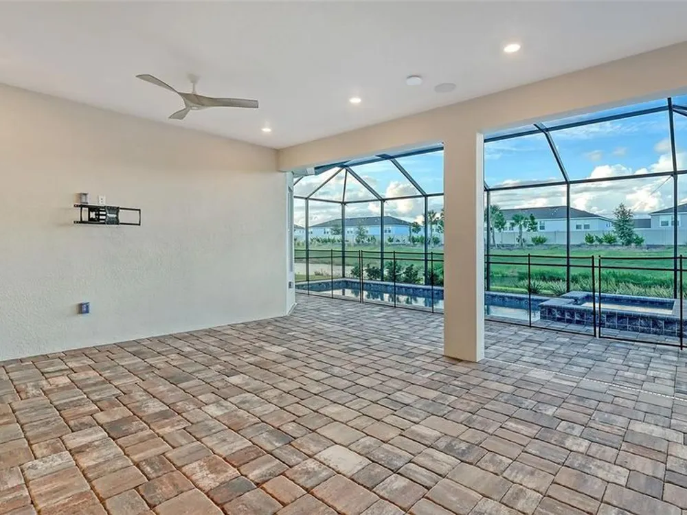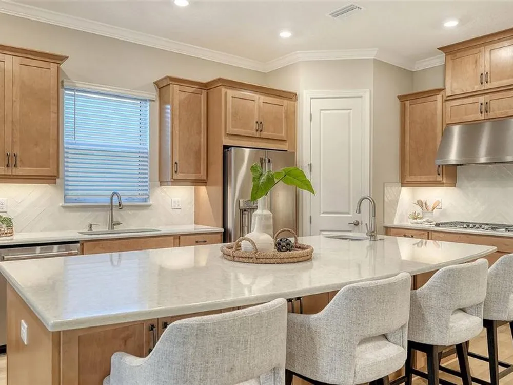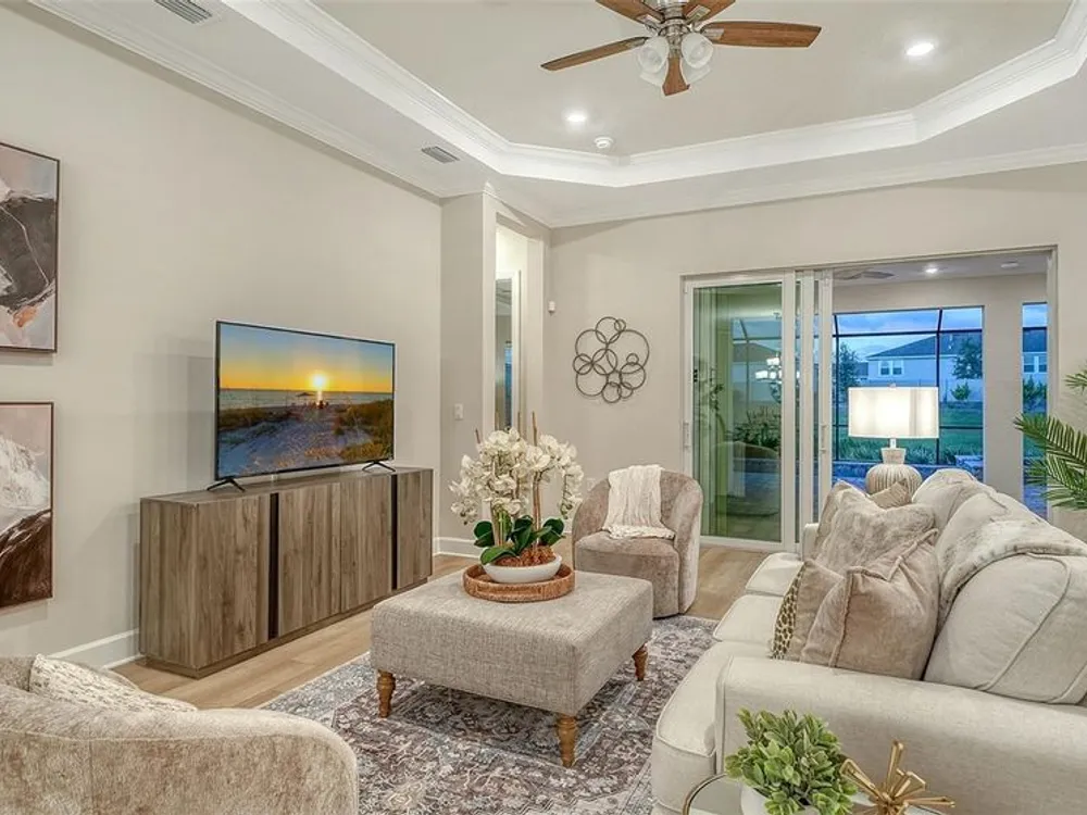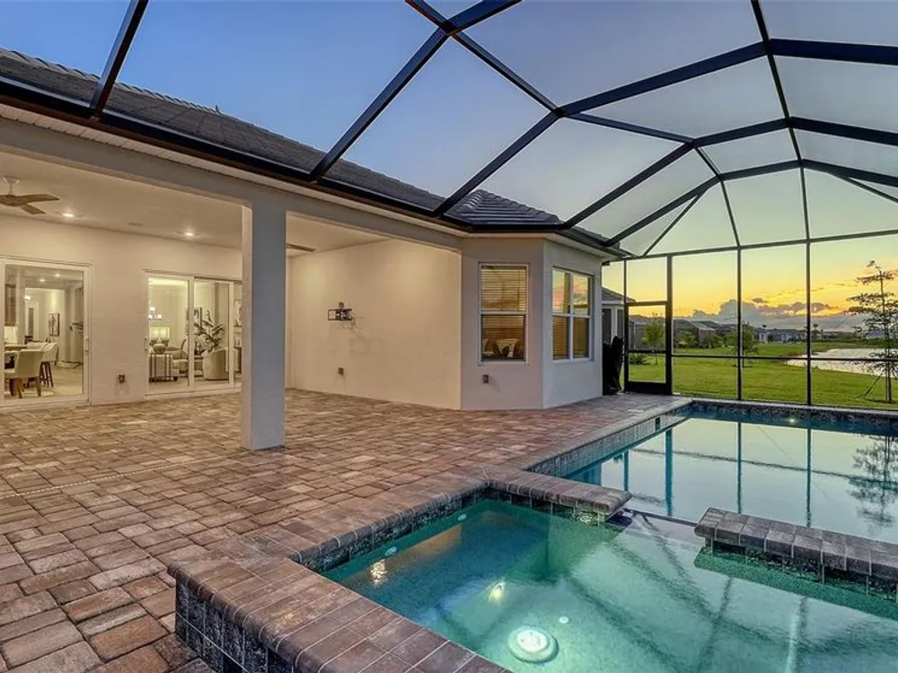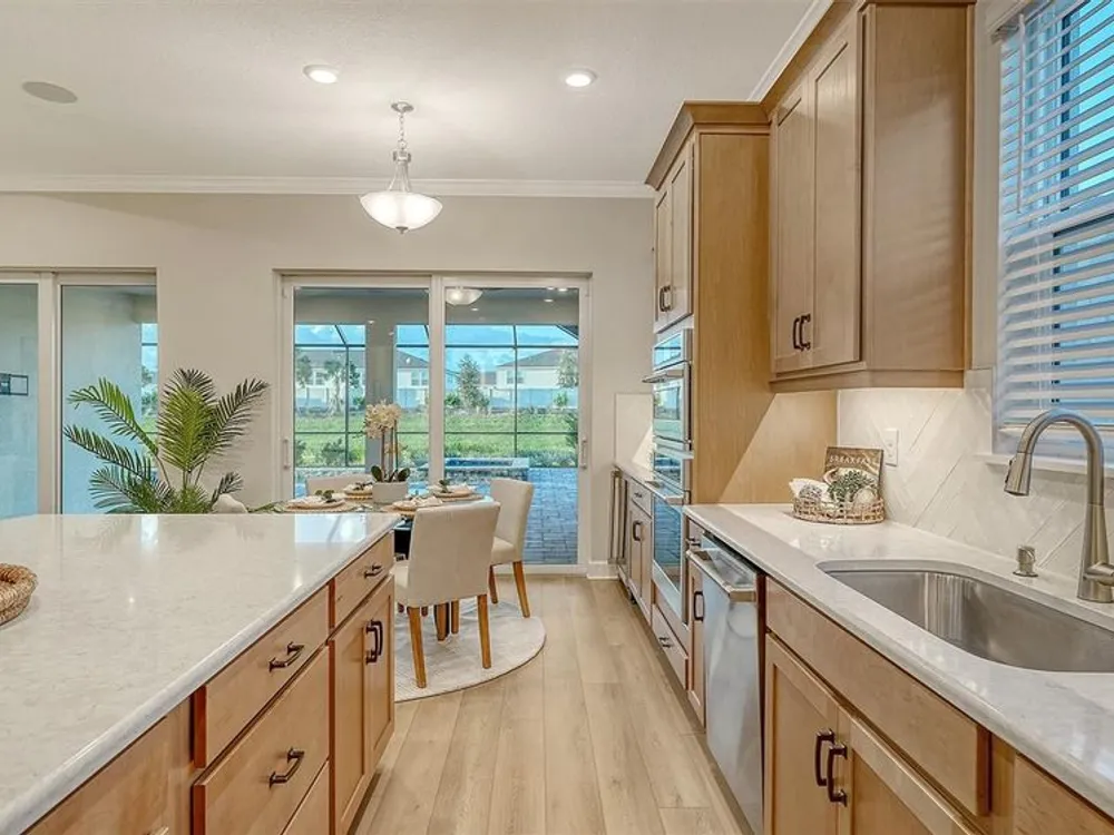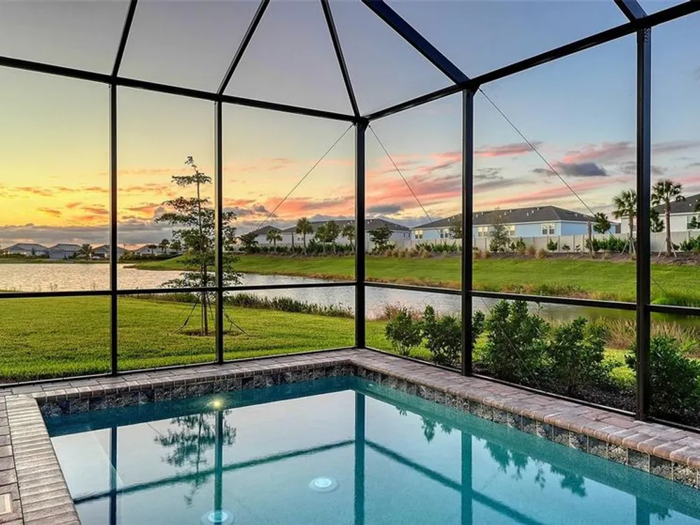 Discover resort-style living at its finest in this fully loaded 3-bedroom, 3-bath plus office Lazio floor plan, located in the highly sought-after Esplanade at Azario in Lakewood Ranch. This exceptional, non-golf deeded home showcases impact glass windows and doors, designer finishes, and a stunning water view that sets the tone for luxury and relaxation. Step inside and experience effortless elegance with tray ceilings, crown molding, luxury vinyl plank flooring throughout, and an abundance of natural light. The gourmet kitchen is a chef’s dream, featuring Quartz countertops, a large center island, GE Monogram stainless appliances including a gas cooktop and range hood, wall-mounted oven and microwave, extended cabinetry with wine refrigerator, soft-close drawers, tile backsplash, and a spacious walk-in pantry. The open-concept great room flows seamlessly to the covered lanai with a heated saltwater pool and spa and a fully equipped outdoor kitchen, creating the perfect space for entertaining or quiet evenings watching the sunset. The primary suite is a true retreat, offering peaceful water views, a spacious walk-in closet, and a luxurious en-suite bath featuring a large walk-in shower with frameless glass, dual sink vanity, quartz countertops, and beautiful tile extending to the ceiling. Designed for modern living, the home also includes a laundry room with utility sink and cabinetry, epoxy garage flooring, glass front door with sidelights, and a tandem 3rd bay garage. Exterior enhancements include landscape lighting and bay window extensions that elevate the home’s curb appeal and livability. Located within Esplanade at Azario, residents enjoy world-class amenities—a resort-style pool and Bahama bar, full-service spa, state-of-the-art fitness center, sports courts, culinary center with teaching kitchen, on-site dining, and a full-time lifestyle director. Additional offerings include pickleball, tennis, bocce, walking trails, a dog park, community garden, and fire pit—all just minutes from Lakewood Ranch’s premier shopping, dining, and Gulf Coast beaches. This home offers the perfect blend of luxury, privacy, and low-maintenance living. Schedule your private showing today and experience the Esplanade lifestyle!
