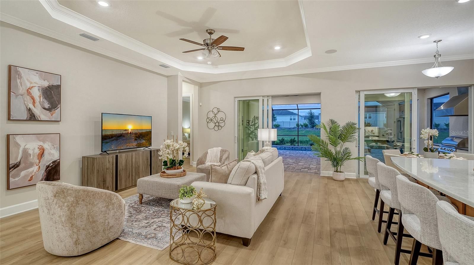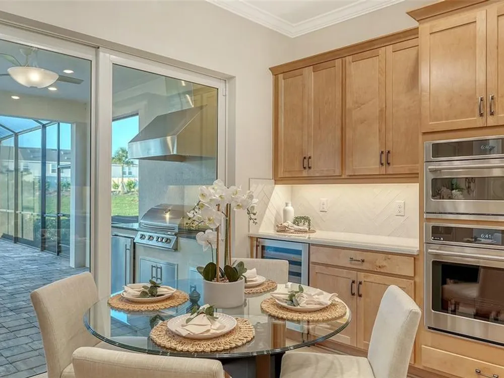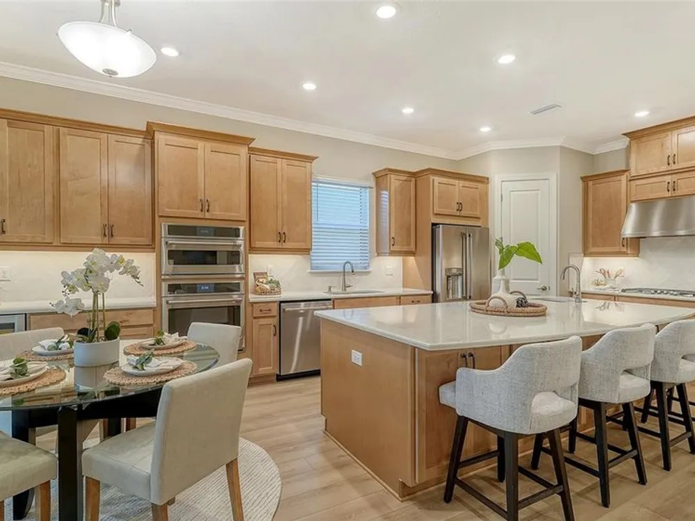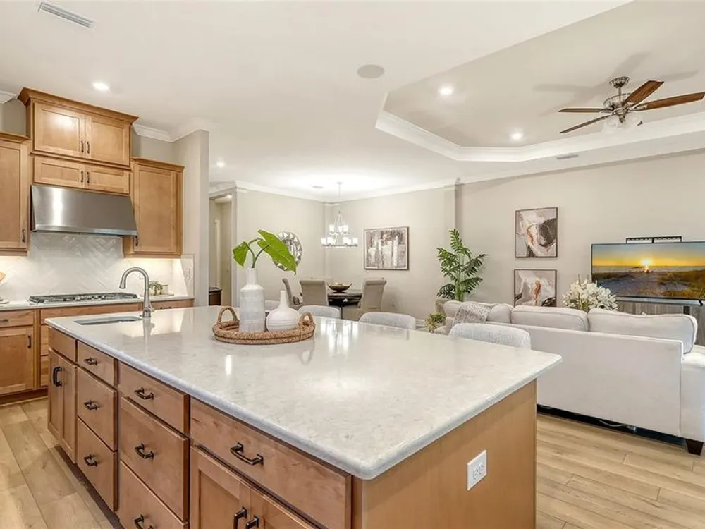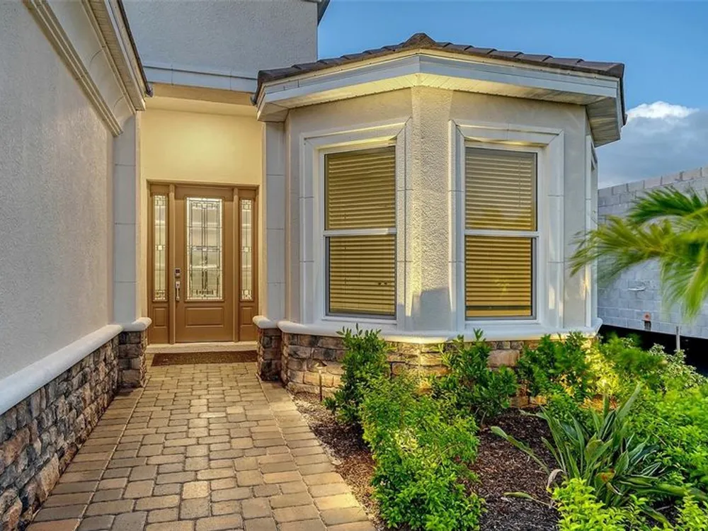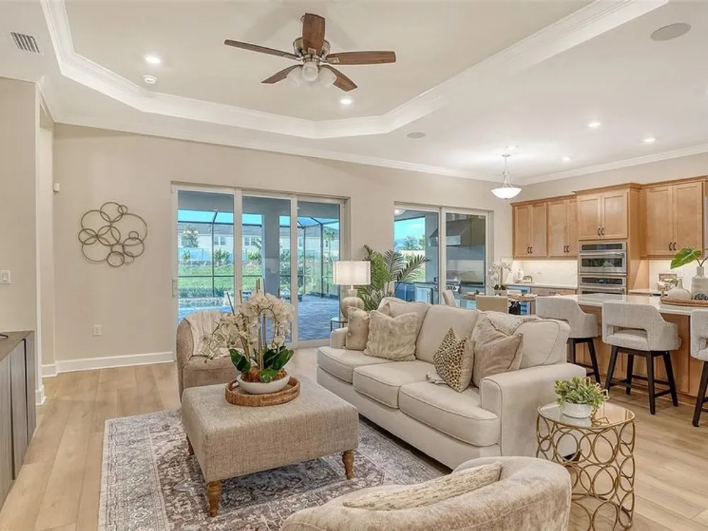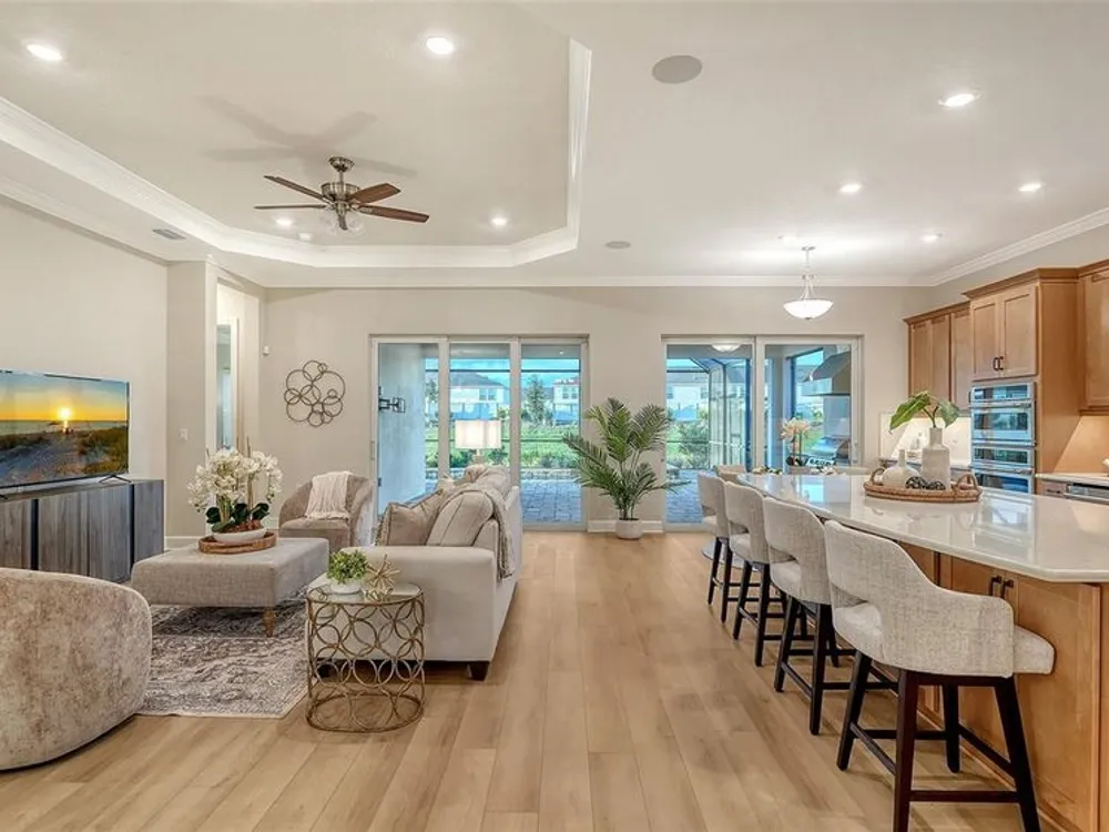 Discover resort-style living at its finest in this fully loaded 3-bedroom, 3-bath plus office Lazio floor plan, located in the highly sought-after Esplanade at Azario in Lakewood Ranch. This exceptional, non-golf deeded home showcases impact glass windows and doors, designer finishes, and a stunning water view that sets the tone for luxury and relaxation. Step inside and experience effortless elegance with tray ceilings, crown molding, luxury vinyl plank flooring throughout, and an abundance of natural light. The gourmet kitchen is a chef’s dream, featuring Quartz countertops, a large center island, GE Monogram stainless appliances including a gas cooktop and range hood, wall-mounted oven and microwave, extended cabinetry with wine refrigerator, soft-close drawers, tile backsplash, and a spacious walk-in pantry. The open-concept great room flows seamlessly to the covered lanai with a heated saltwater pool and spa and a fully equipped outdoor kitchen, creating the perfect space for entertaining or quiet evenings watching the sunset. The primary suite is a true retreat, offering peaceful water views, a spacious walk-in closet, and a luxurious en-suite bath featuring a large walk-in shower with frameless glass, dual sink vanity, quartz countertops, and beautiful tile extending to the ceiling. Designed for modern living, the home also includes a laundry room with utility sink and cabinetry, epoxy garage flooring, glass front door with sidelights, and a tandem 3rd bay garage. Exterior enhancements include landscape lighting and bay window extensions that elevate the home’s curb appeal and livability. Located within Esplanade at Azario, residents enjoy world-class amenities—a resort-style pool and Bahama bar, full-service spa, state-of-the-art fitness center, sports courts, culinary center with teaching kitchen, on-site dining, and a full-time lifestyle director. Additional offerings include pickleball, tennis, bocce, walking trails, a dog park, community garden, and fire pit—all just minutes from Lakewood Ranch’s premier shopping, dining, and Gulf Coast beaches. This home offers the perfect blend of luxury, privacy, and low-maintenance living. Schedule your private showing today and experience the Esplanade lifestyle!