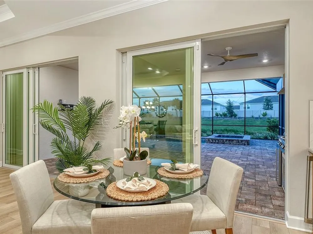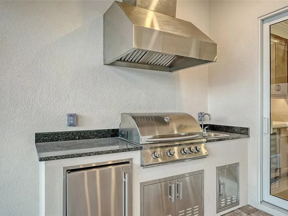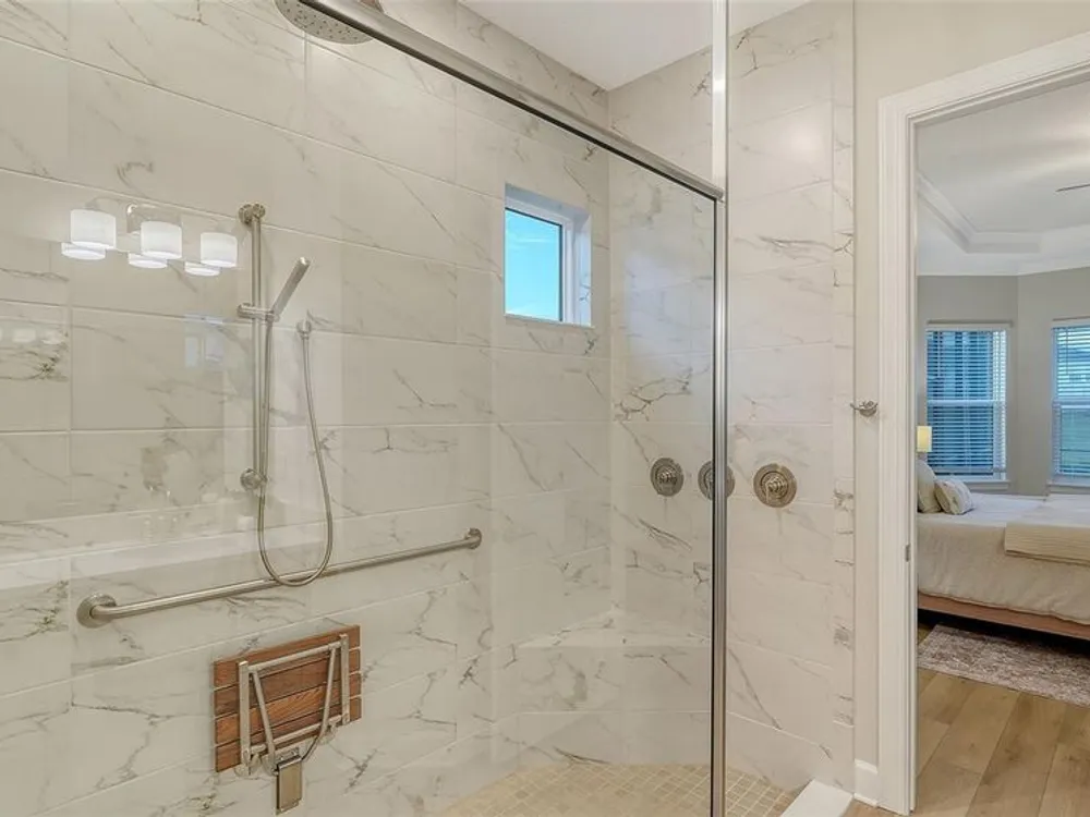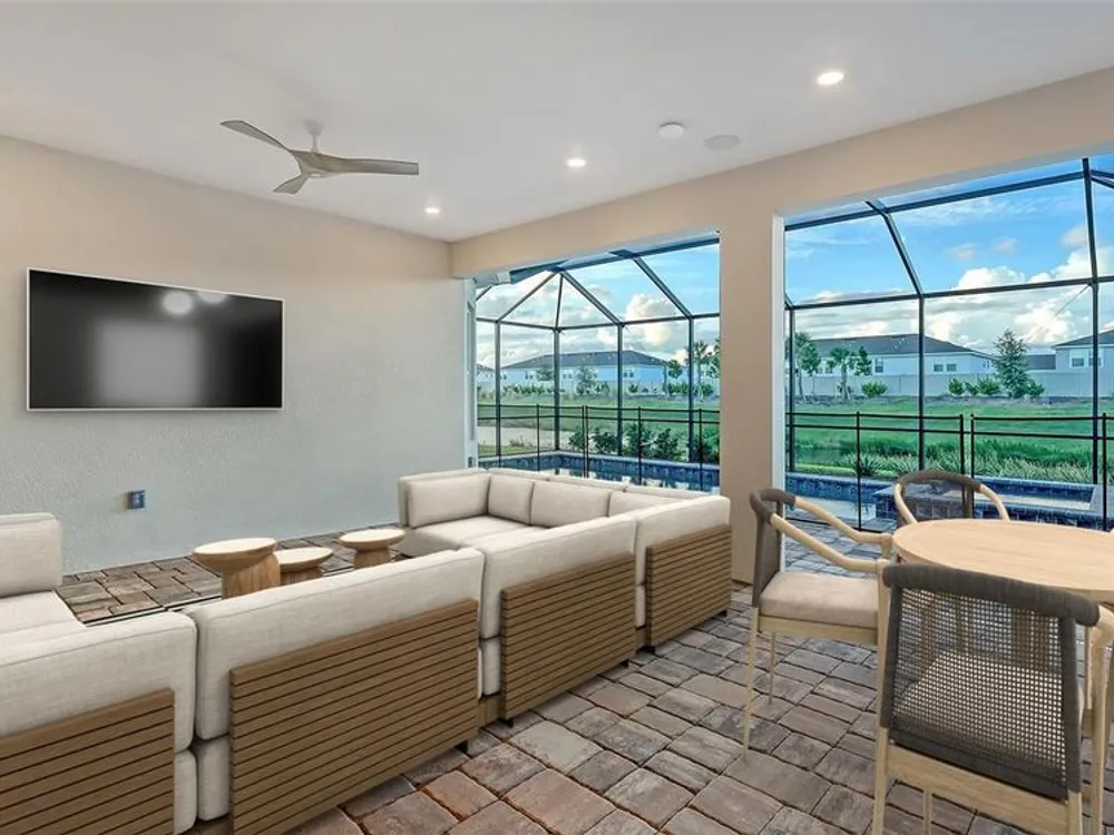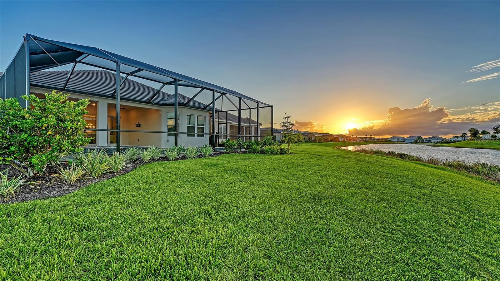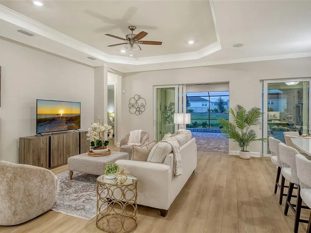 Discover resort-style living at its finest in this fully loaded 3-bedroom, 3-bath plus office Lazio floor plan, located in the highly sought-after Esplanade at Azario in Lakewood Ranch. This exceptional, non-golf deeded home showcases impact glass windows and doors, designer finishes, and a stunning water view that sets the tone for luxury and relaxation. Step inside and experience effortless elegance with tray ceilings, crown molding, luxury vinyl plank flooring throughout, and an abundance of natural light. The gourmet kitchen is a chef’s dream, featuring Quartz countertops, a large center island, GE Monogram stainless appliances including a gas cooktop and range hood, wall-mounted oven and microwave, extended cabinetry with wine refrigerator, soft-close drawers, tile backsplash, and a spacious walk-in pantry. The open-concept great room flows seamlessly to the covered lanai with a heated saltwater pool and spa and a fully equipped outdoor kitchen, creating the perfect space for entertaining or quiet evenings watching the sunset. The primary suite is a true retreat, offering peaceful water views, a spacious walk-in closet, and a luxurious en-suite bath featuring a large walk-in shower with frameless glass, dual sink vanity, quartz countertops, and beautiful tile extending to the ceiling. Designed for modern living, the home also includes a laundry room with utility sink and cabinetry, epoxy garage flooring, glass front door with sidelights, and a tandem 3rd bay garage. Exterior enhancements include landscape lighting and bay window extensions that elevate the home’s curb appeal and livability. Located within Esplanade at Azario, residents enjoy world-class amenities—a resort-style pool and Bahama bar, full-service spa, state-of-the-art fitness center, sports courts, culinary center with teaching kitchen, on-site dining, and a full-time lifestyle director. Additional offerings include pickleball, tennis, bocce, walking trails, a dog park, community garden, and fire pit—all just minutes from Lakewood Ranch’s premier shopping, dining, and Gulf Coast beaches. This home offers the perfect blend of luxury, privacy, and low-maintenance living. Schedule your private showing today and experience the Esplanade lifestyle!