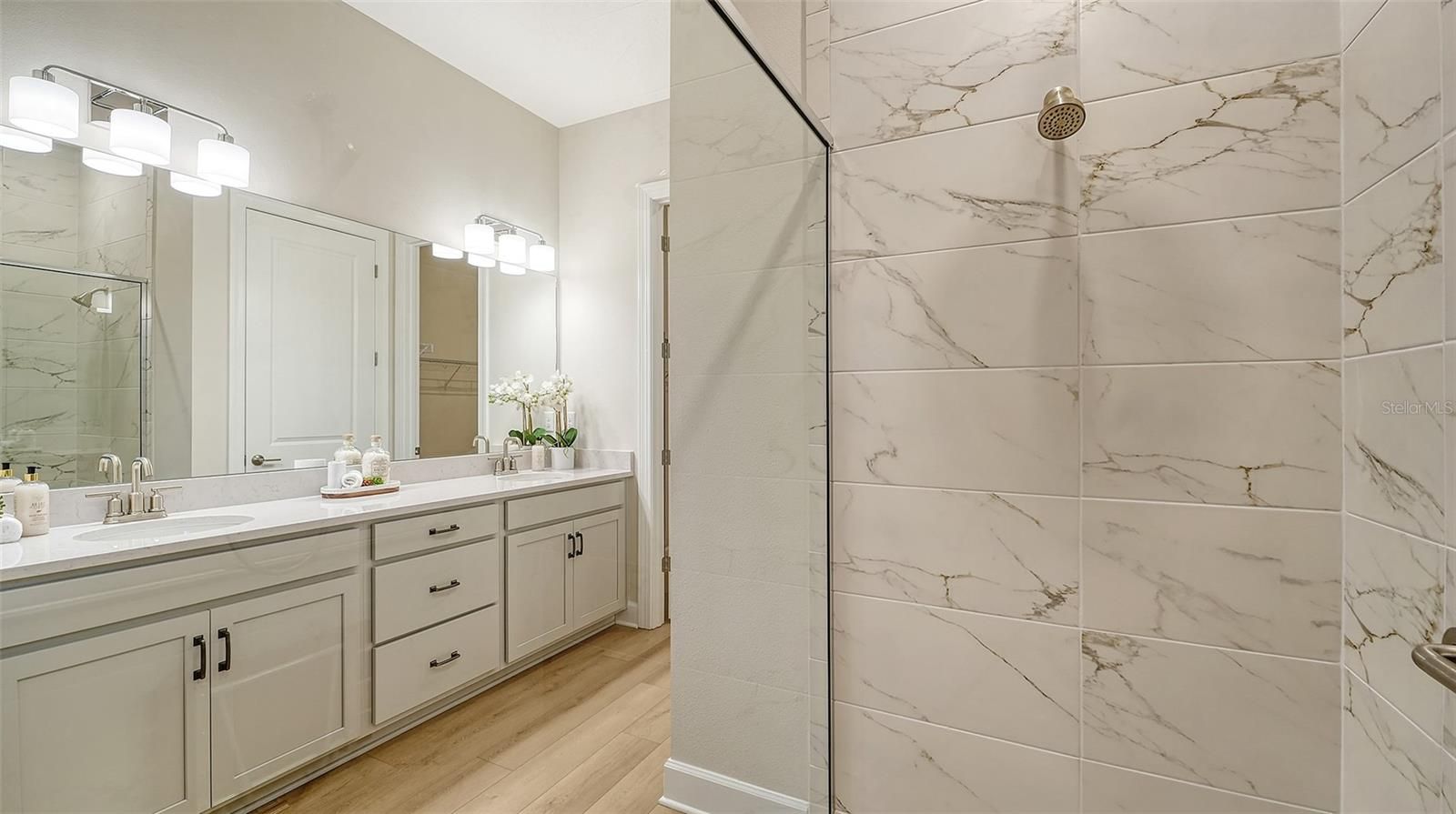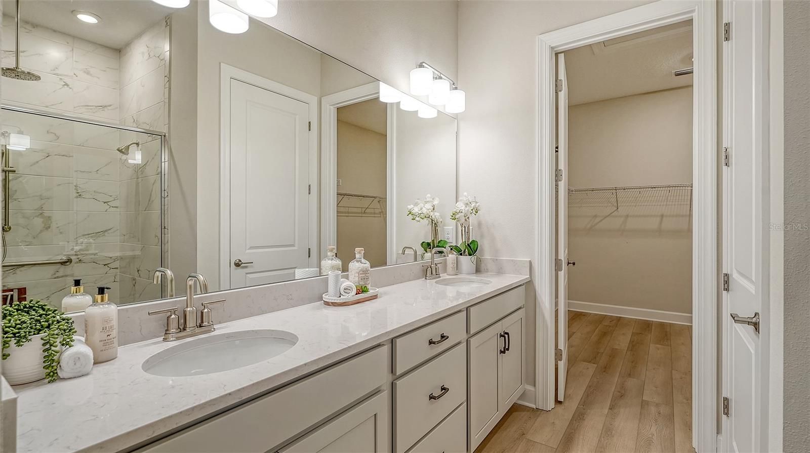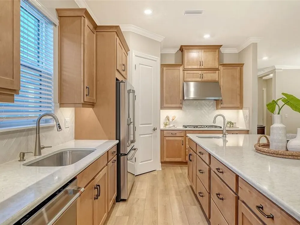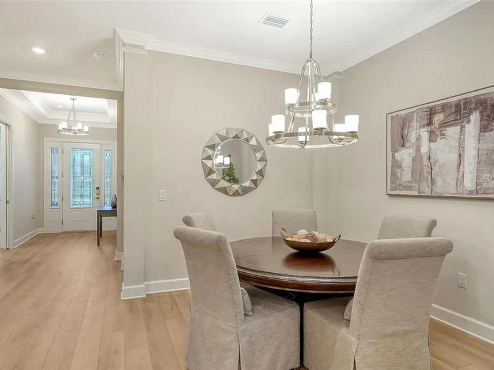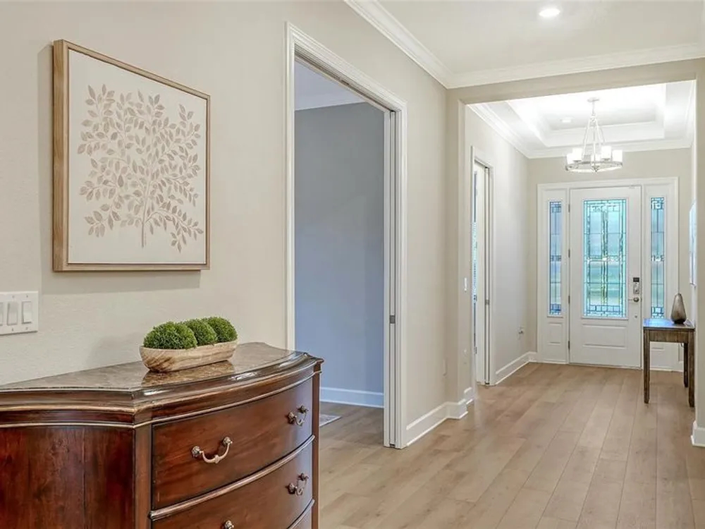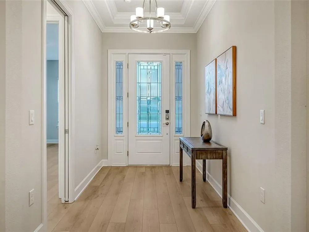 Discover resort-style living at its finest in this fully loaded 3-bedroom, 3-bath plus office Lazio floor plan, located in the highly sought-after Esplanade at Azario in Lakewood Ranch. This exceptional, non-golf deeded home showcases impact glass windows and doors, designer finishes, and a stunning water view that sets the tone for luxury and relaxation. Step inside and experience effortless elegance with tray ceilings, crown molding, luxury vinyl plank flooring throughout, and an abundance of natural light. The gourmet kitchen is a chef’s dream, featuring Quartz countertops, a large center island, GE Monogram stainless appliances including a gas cooktop and range hood, wall-mounted oven and microwave, extended cabinetry with wine refrigerator, soft-close drawers, tile backsplash, and a spacious walk-in pantry. The open-concept great room flows seamlessly to the covered lanai with a heated saltwater pool and spa and a fully equipped outdoor kitchen, creating the perfect space for entertaining or quiet evenings watching the sunset. The primary suite is a true retreat, offering peaceful water views, a spacious walk-in closet, and a luxurious en-suite bath featuring a large walk-in shower with frameless glass, dual sink vanity, quartz countertops, and beautiful tile extending to the ceiling. Designed for modern living, the home also includes a laundry room with utility sink and cabinetry, epoxy garage flooring, glass front door with sidelights, and a tandem 3rd bay garage. Exterior enhancements include landscape lighting and bay window extensions that elevate the home’s curb appeal and livability. Located within Esplanade at Azario, residents enjoy world-class amenities—a resort-style pool and Bahama bar, full-service spa, state-of-the-art fitness center, sports courts, culinary center with teaching kitchen, on-site dining, and a full-time lifestyle director. Additional offerings include pickleball, tennis, bocce, walking trails, a dog park, community garden, and fire pit—all just minutes from Lakewood Ranch’s premier shopping, dining, and Gulf Coast beaches. This home offers the perfect blend of luxury, privacy, and low-maintenance living. Schedule your private showing today and experience the Esplanade lifestyle!