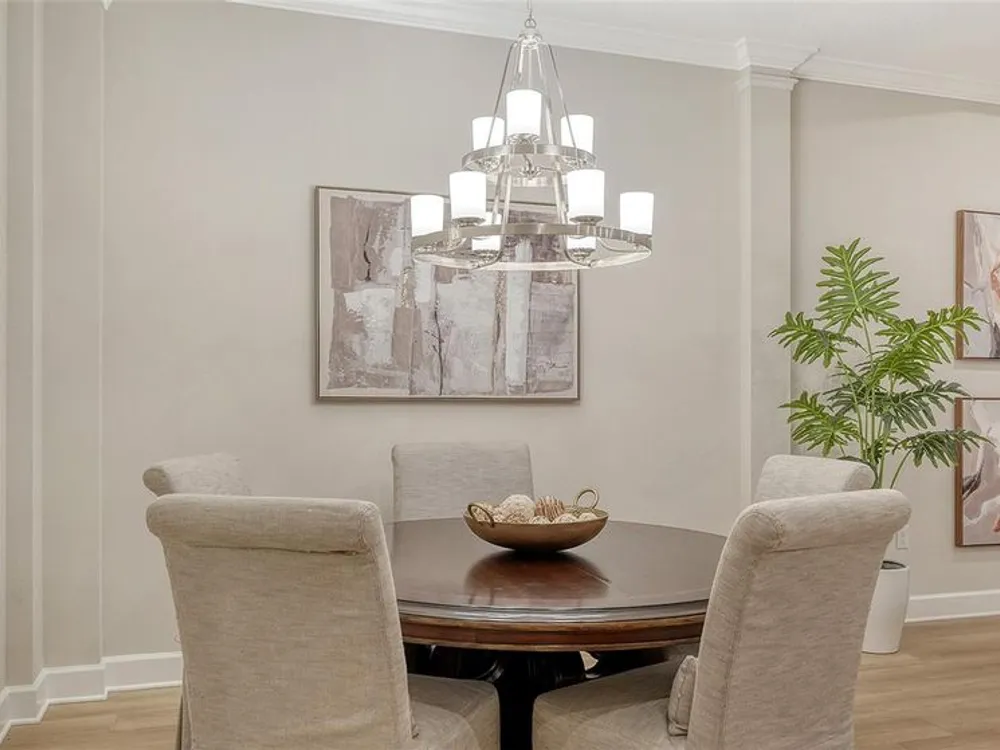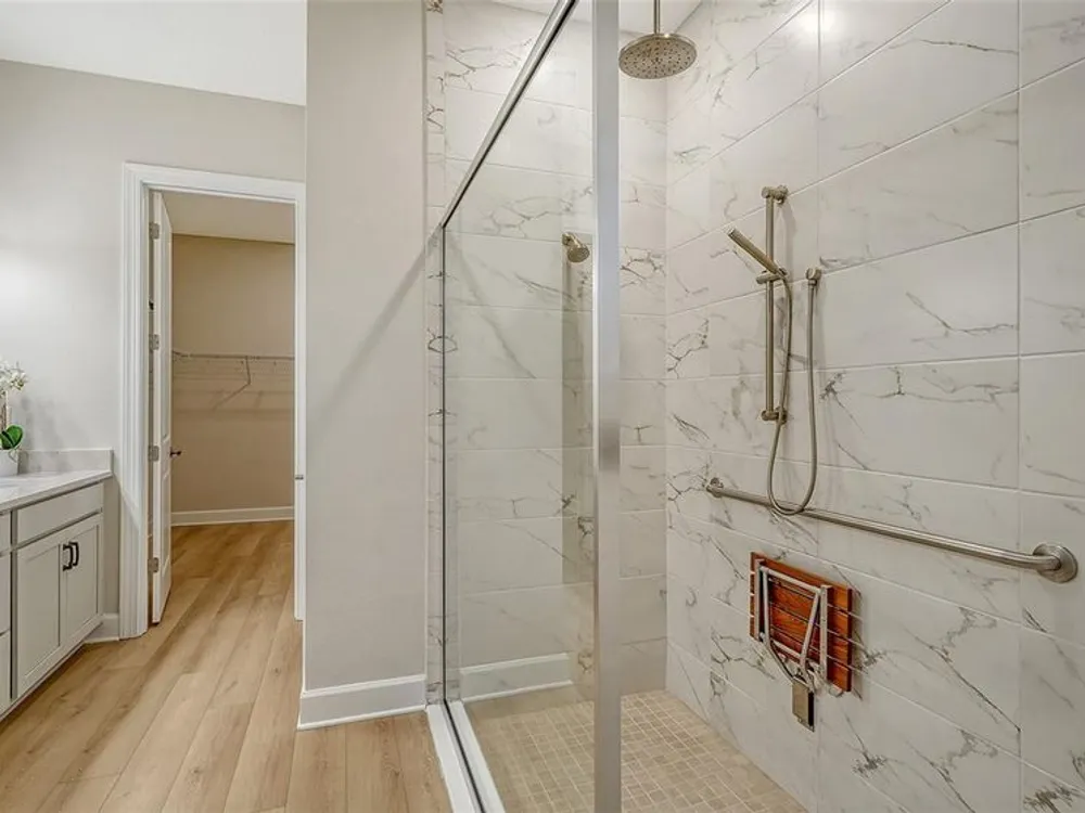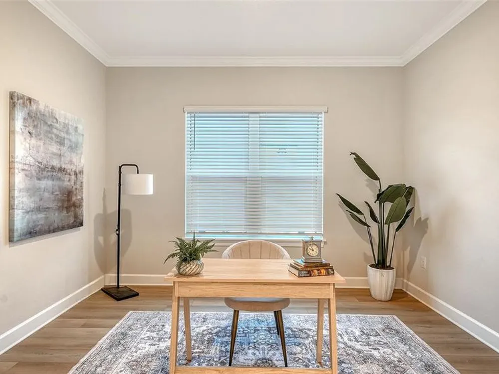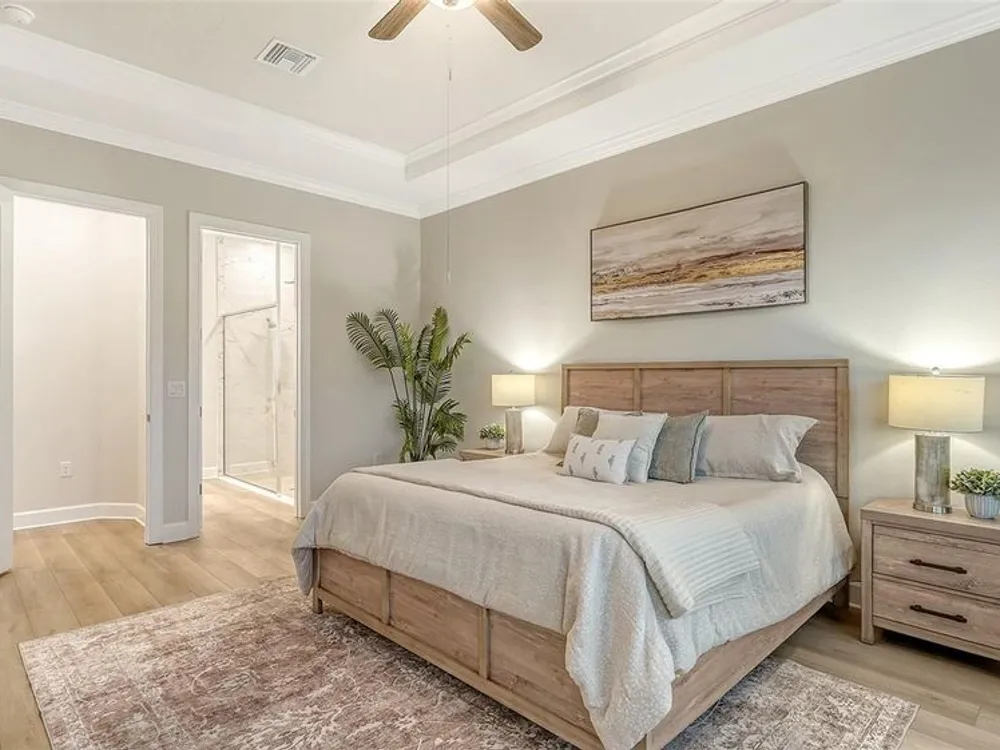 - Ceiling Fan(s), Crown Molding, Eat-in Kitchen, Kitchen/Family Room Combo, Living/Dining Room, Open Floorplan, Main Level Primary, Stone Counters, Thermostat, Tray Ceiling(s), Walk-In Closet(s)