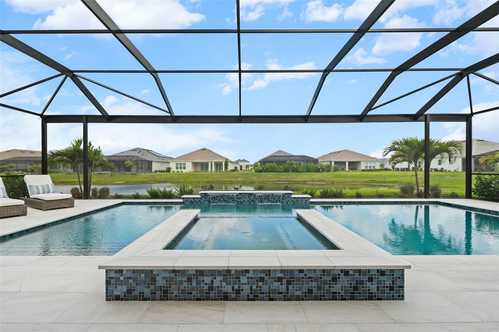 Under contract-accepting backup offers. This exceptional Pallazzio floor plan in the resort-style community of Esplanade at Azario offers a rare non-golf, water-view setting with 3 bedrooms, 3 full baths, and a bonus room ideal for a home office or guest space. Tucked toward the end of a quiet cul-de-sac with tranquil water views, this open-concept residence flows effortlessly from room to room. The chef's kitchen impresses with quartz countertops, neutral, glass-tile backsplash, GE Café appliances, natural gas range, and built-in water filtration, while the great room elevates everyday living with a stacked-stone fireplace, built-in mantel, Sonos speaker system, and updated light fixtures throughout. The primary suite is a true retreat, featuring a tray ceiling, spa-quality bath with oversized shower, and a custom-finished walk-in closet. Step outside to a private oasis with an oversized heated saltwater pool and spa, and a fully appointed summer kitchen with stacked-stone wall — ideal for year-round entertaining. Peace-of-mind upgrades include a whole-home natural gas generator, impact-resistant windows, rain gutters, smart-home technology, and a custom security system. No golf membership with this home, so lower monthly dues, yet residents still enjoy full access to Azario's world-class amenities, including resort pool and Bahama Bar, fitness and wellness center, spa, tennis, pickleball, culinary center, and an active country club social calendar. Move-in ready and meticulously maintained — a true blend of elegance, privacy, and effortless Florida living.