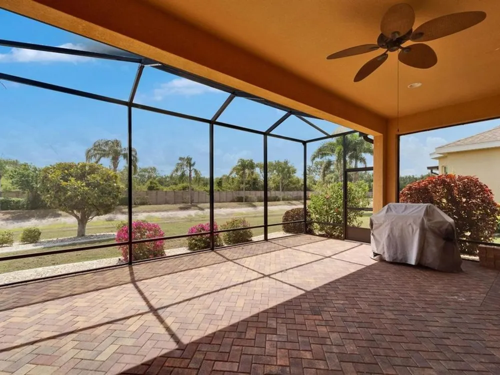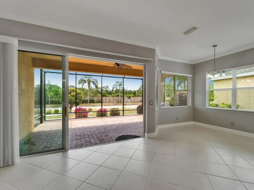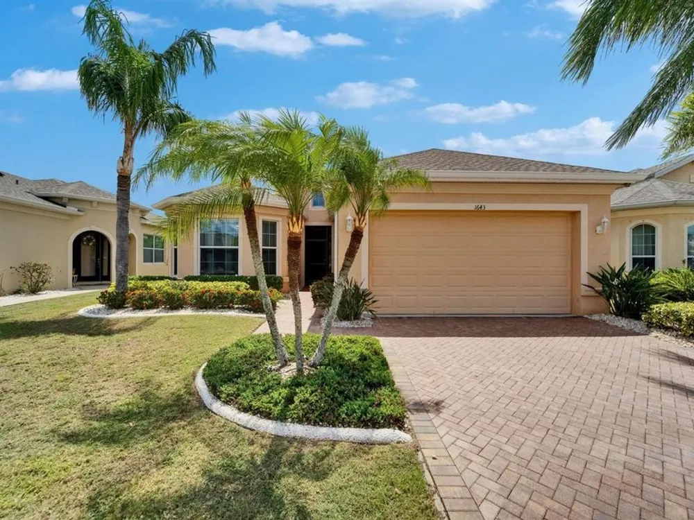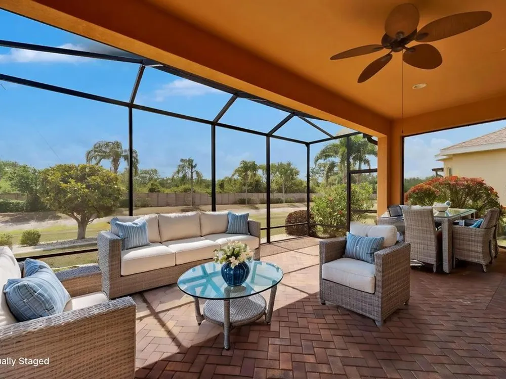 One or more photo(s) has been virtually staged. **PRICE IMPROVEMENT — HUGE REDUCTION!** ** BRING ALL OFFERS – MOTIVATED SELLERS! ** Welcome to 1643 Emerald Dunes Drive, a beautifully maintained 2-bedroom, 2-bathroom plus den/office Laguna model located in the prestigious Club Renaissance at Sun City Center — Voted #1 Retirement Community in the USA by Realtor.com and Travel + Leisure. This vibrant, active adult community offers resort-style living with exclusive access to a Mediterranean-style clubhouse featuring a heated pool and spa, full-service day spa and wellness center, fitness center with indoor walking track, golf shop, upscale restaurant and lounge, tennis and pickleball courts, and over 150 clubs and social groups to enjoy. Built in 2015, this smoke-free, pet-free home offers nearly 2,000 sq. ft. of stylish, maintenance-free living with soaring 12-to-14-foot ceilings, elegant triple crown molding, arched doorways, and designer finishes throughout. The spacious gourmet kitchen features 42" wood cabinetry, granite countertops, stainless steel appliances, pull-out drawers, stone backsplash, under-cabinet lighting, and a large island perfect for entertaining. The formal dining room includes a stunning chandelier and overlooks serene pond and fountain views. The split-bedroom floor plan provides ultimate privacy, with a luxurious primary suite boasting a tray ceiling, bay window, dual walk-in closets, and a spa-like bath with granite-topped vanities and a step-free walk-in shower. The versatile den/office with French doors and custom built-ins can easily serve as a third bedroom. Enjoy Florida’s outdoor living from the extended 24x18 screened lanai with brick pavers, ceiling fan, custom blinds, and a propane line for grilling, all overlooking tranquil pond views with no rear neighbors for added privacy. Recent upgrades include a new roof (2022), A/C capacitor (2024), hurricane shutters, whole-house surge protector, energy-efficient Low-E windows, and a full water filtration system. Residents enjoy full access to Sun City Center’s extensive amenities including multiple pools (indoor and outdoor), tennis, shuffleboard, lawn bowling, softball, arts & crafts studios, hobby workshops, and a golf-cart-friendly community with easy access to shopping, medical facilities, and dining. Conveniently located near Tampa, Sarasota, and award-winning beaches like Clearwater and Siesta Key. Seller is offering a credit toward the remainder of the 2025 Renaissance Social Membership (~$1,500 value). Required community fees include Siena I HOA ($960/year), Renaissance Maintenance ($595/year), Renaissance Social Membership ($2,660/year), and Sun City Center Association ($342/person/year), plus a one-time $3,000 capital fund fee at closing. Don’t miss this rare opportunity to live in one of Florida’s most sought-after active adult communities—schedule your private showing today!