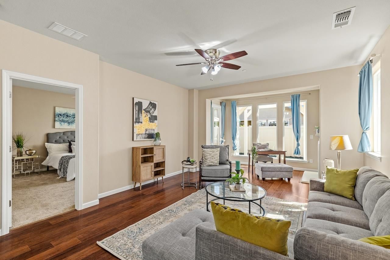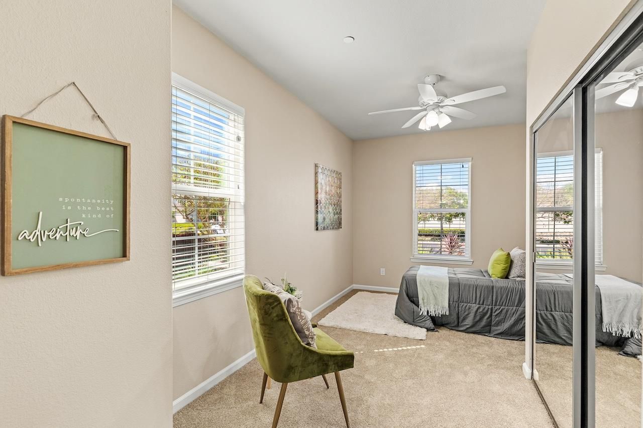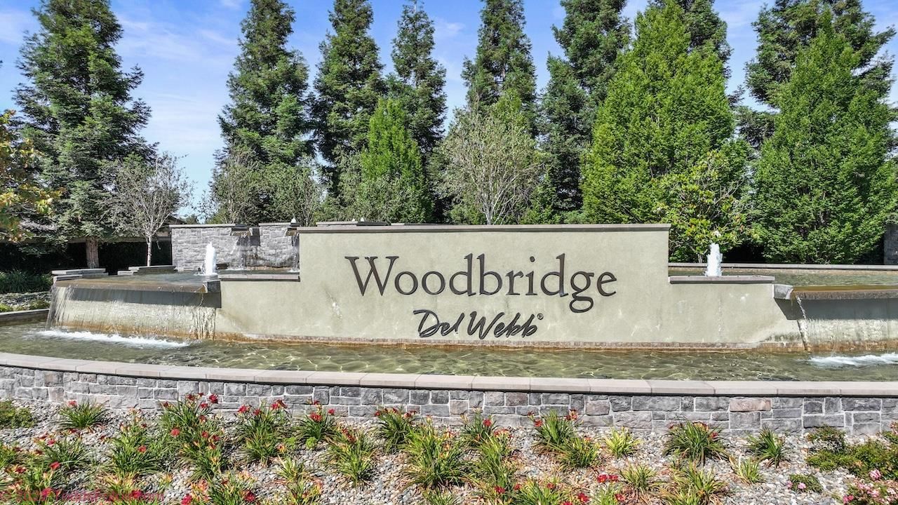 Wonderful Cruise model with rare hearth room & fireplace, fresh 2-tone painted interior, 3 true bedrooms (each with a closet), laminate flooring, new carpet & pad in the bedrooms, 24-panel leased solar system ($21/mo) with paid-for double battery (2 Powerwalls) backup, tankless water heater, kitchen features granite counters, full backsplash, cabinet pulls, 5-burner gas cooktop, stainless oven & m/w, stainless fridge stays and island with sink & breakfast bar, primary bedroom includes slider to backyard, lighted ceiling fan, 2 sinks, stall shower, tile flooring and walk-in closet with new custom organizer that includes desk & new carpet, 2nd bedroom has a walk-in closet, 3rd BR has double door entry & mirrored closet doors, laundry room has both gas & electric dryer outlets, washer & dryer stay & tile flooring, finished garage with opener, low-maintenance landscaping, new backyard landscaping, new concrete patio, new artificial grass, fresh black bark & 3 arbors. Come see this dynamite home!! Woodbridge is a 55+ active adult community with a clubhouse, pool, softball field, putting green, tennis court, pickle ball courts & much more!