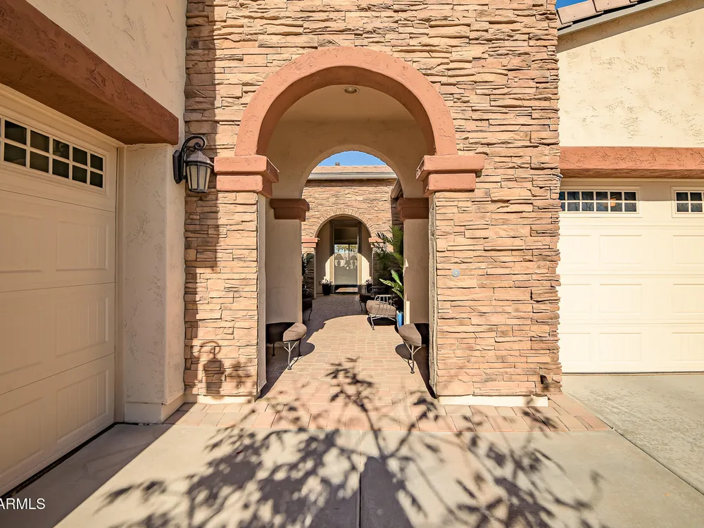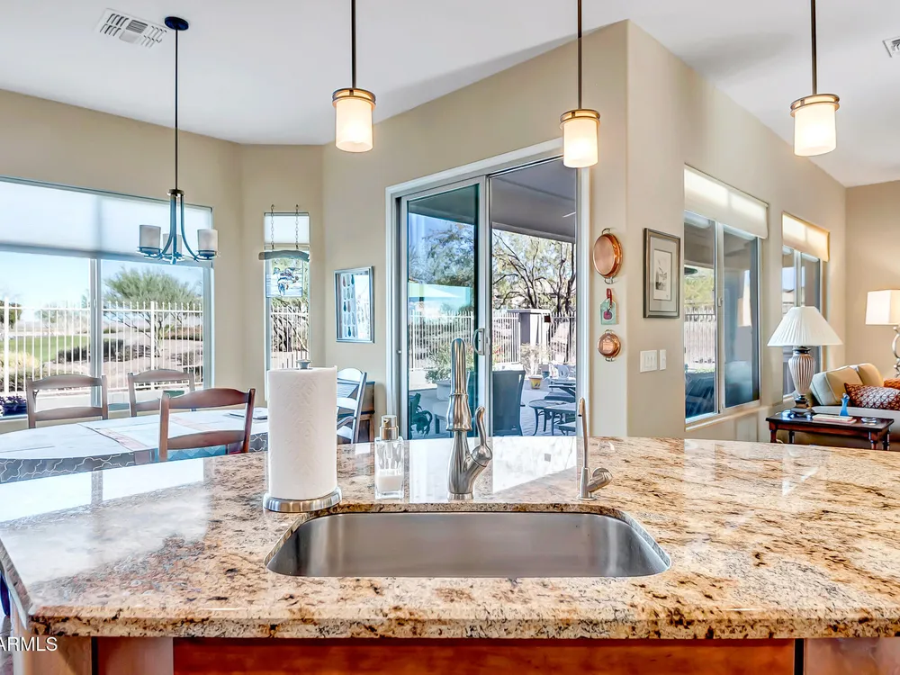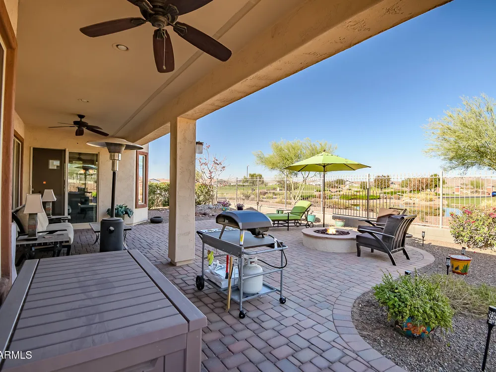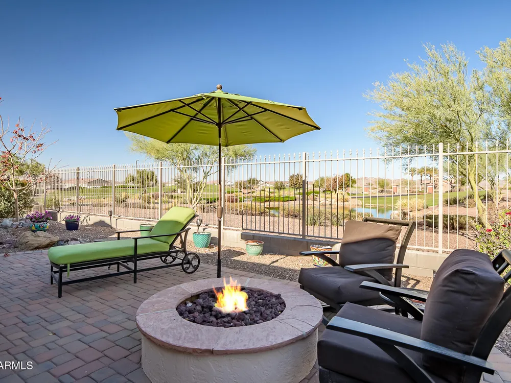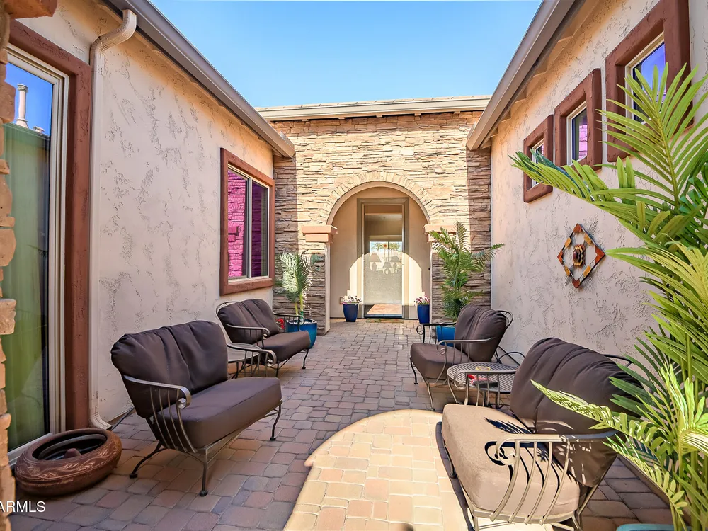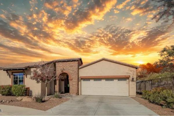 Welcome home to the desirable Canta Mia 55+ community! Nestled in a quiet cul-de-sac, this well-appointed home offers an exceptional combination of privacy, convenience, & comfort. Charming courtyard is a welcoming space for morning coffee & a good book. Chef's dream kitchen is spacious with a large island & breakfast bar. Versatile flex room for a home office, hobbies, or a third bedroom to suit your needs. 3rd bay garage for your extra toys or golf cart! Enjoy serene outdoor space with stunning desert landscaping, no rear neighbors, & tranquil pond views. Save beaucoup on energy costs with the added benefit of 100% paid and maintenance free SOLAR! Dynamic, social community that offers an array of amenities, making it the ideal choice for active adults seeking a vibrant lifestyle!